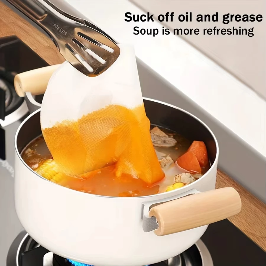 【Ampliamente utilizado】 Las láminas de absorción de aceite no solo absorben aceite de sopa, sino que también se pueden colocar en un plato para absorber la grasa de la superficie de los alimentos fritos.