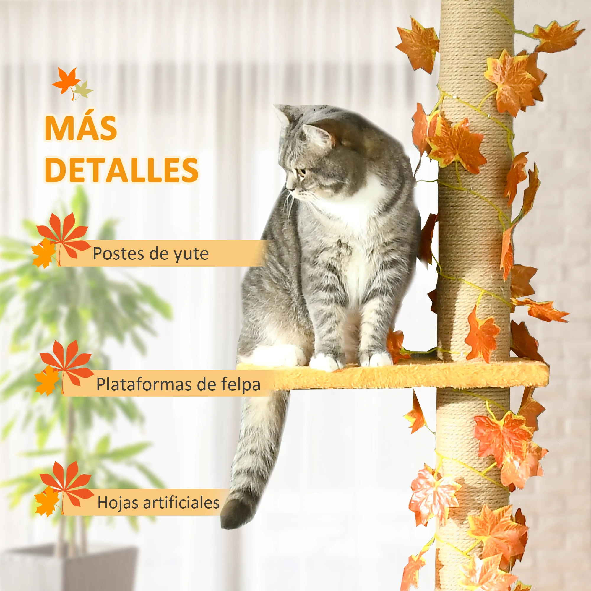 Comprar Pawhut Árbol para Gatos de Suelo a Techo de 202-242 cm Torre para Gatos con 3 Plataformas Postes Rascadores Altura Ajustable y Decoración de Hoja de Arce Naranja
