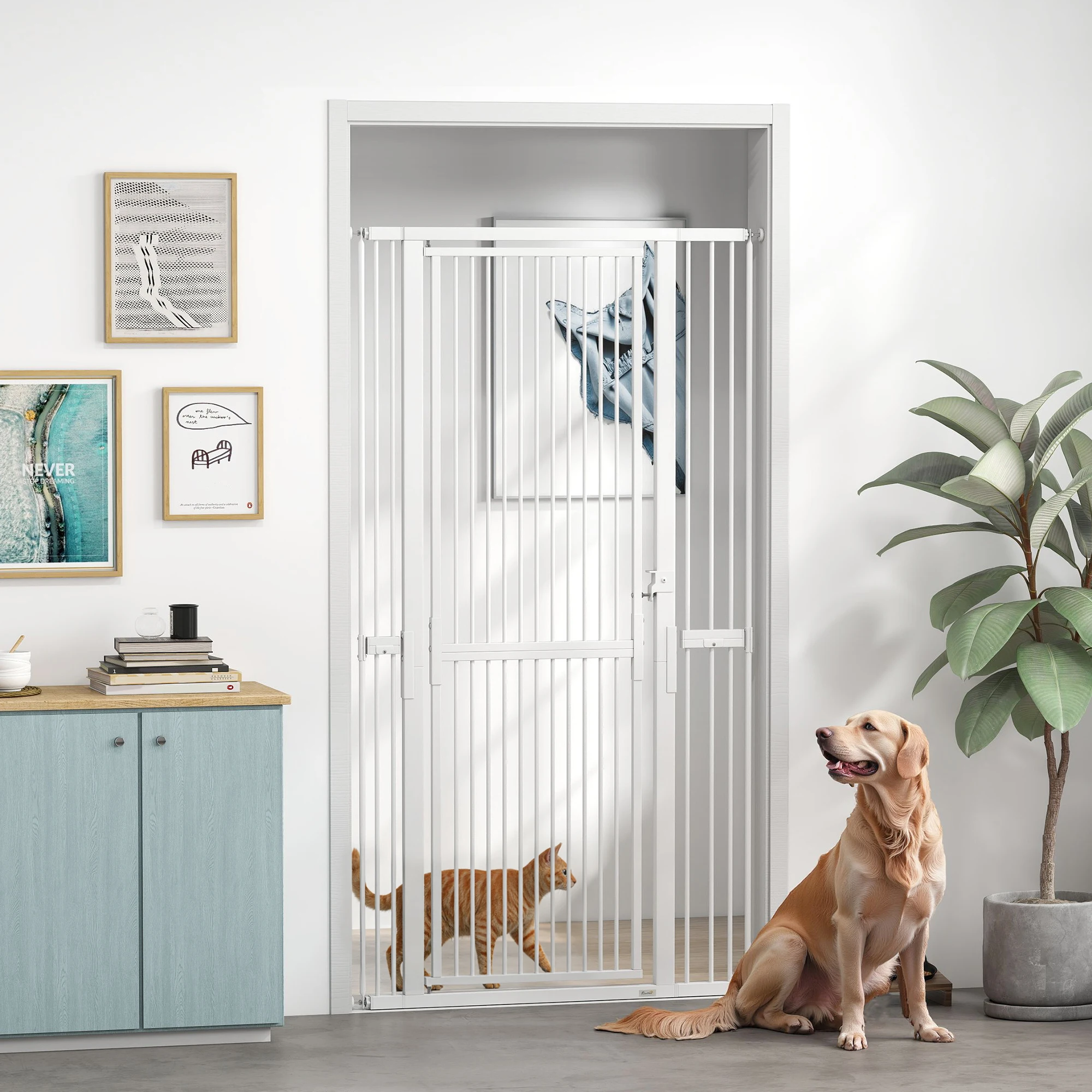 Esta valla para perros incluye extensiones de 7 cm y 14 cm, ajustable de 76 a 104 cm para adaptarse a diferentes espacios;