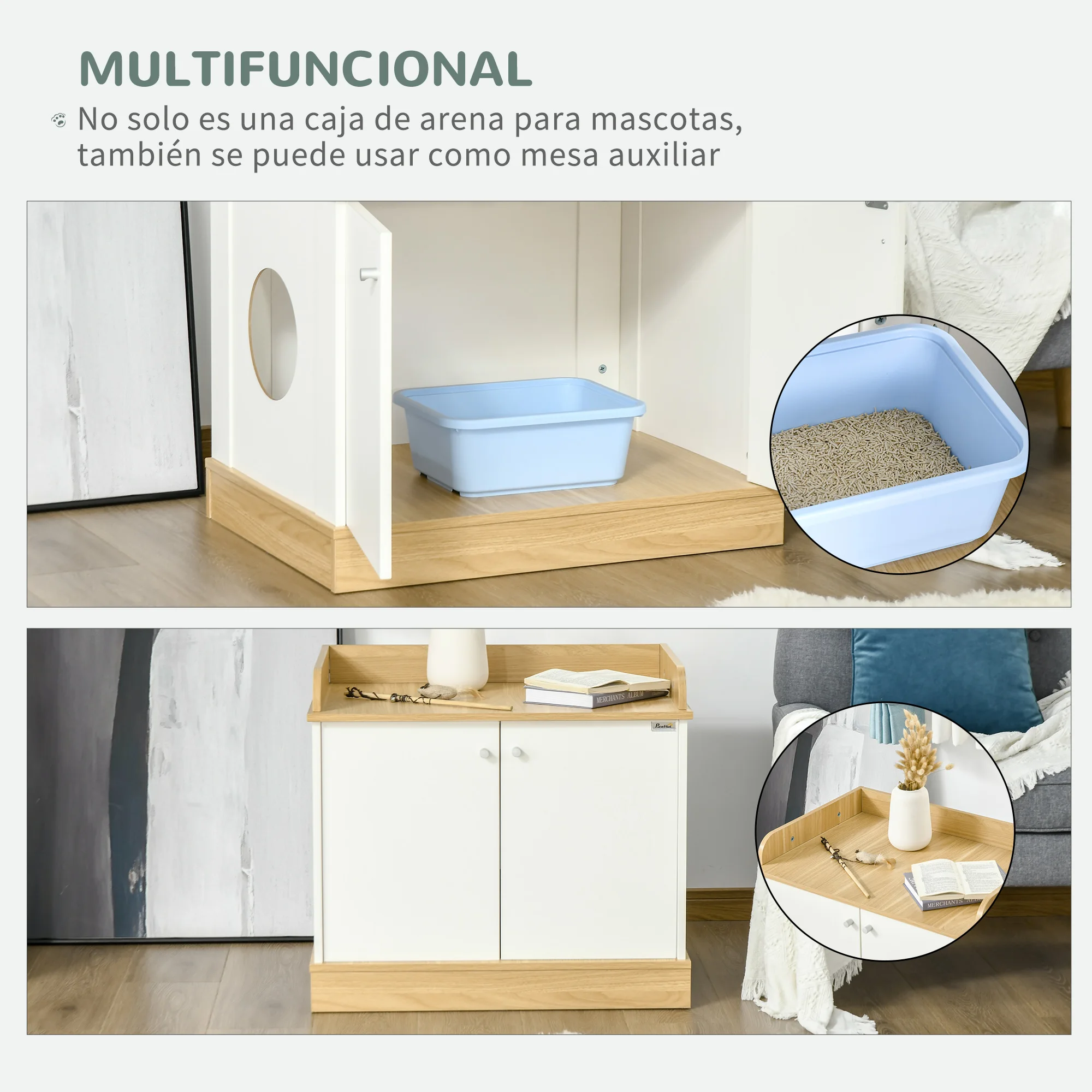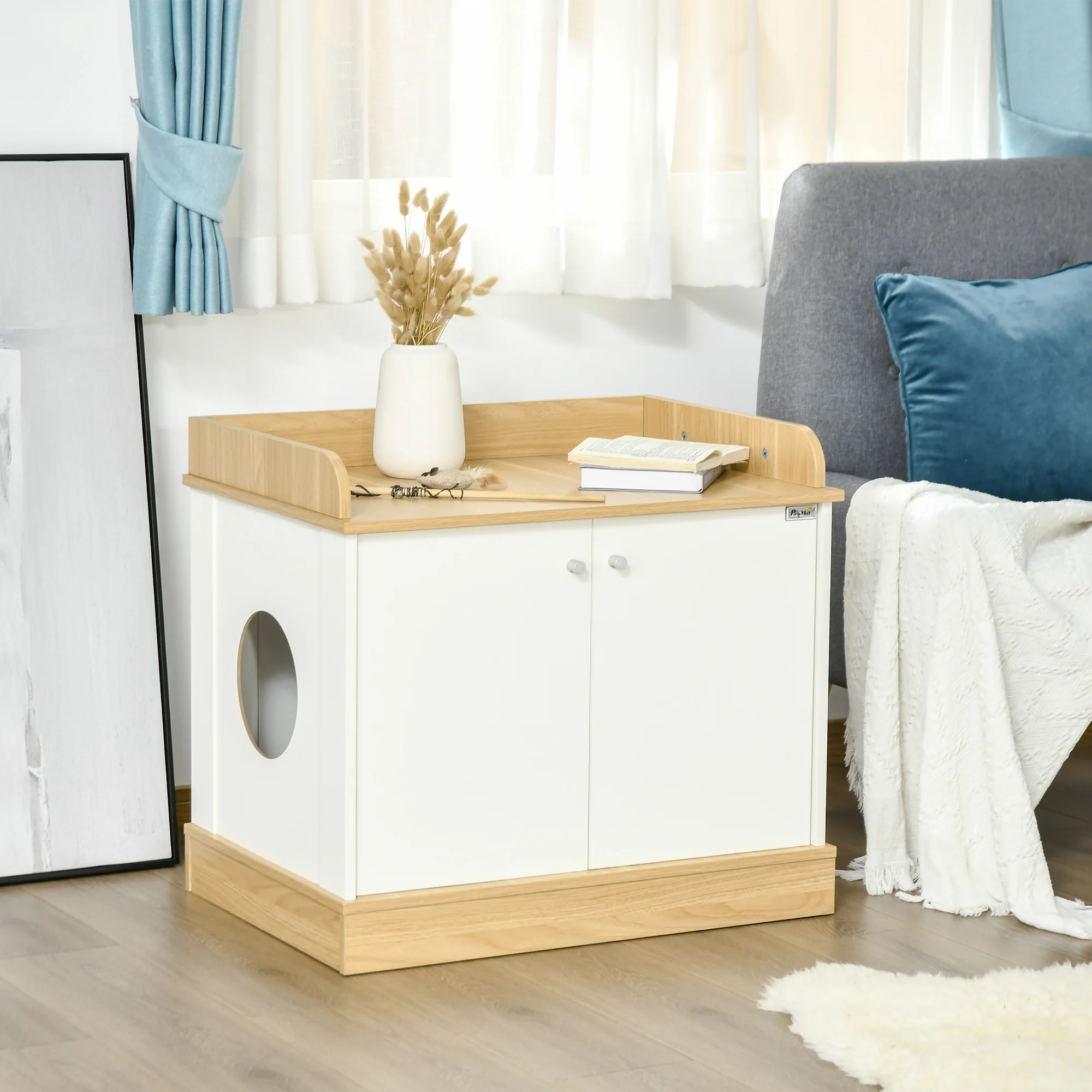 PawHut Casa para Gatos de Madera Mueble Arenero para Gatos 2 en 1 con Estante de Almacenaje Doble Puerta y Orificio de Entrada Lateral 75x53x67 cm Blanco y Roble