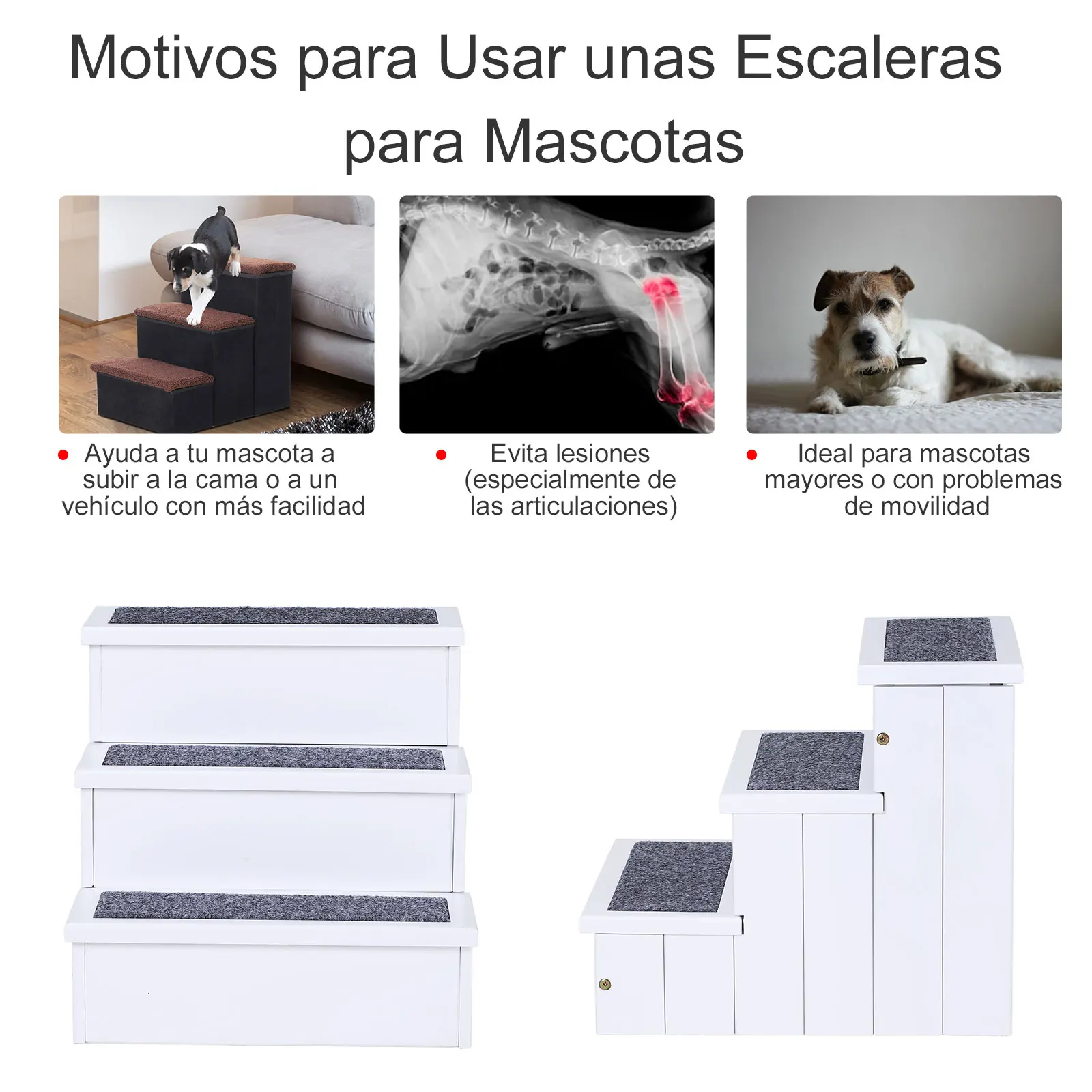 Comprar PawHut Escalera para Mascotas 3 Peldaños con Espacio de Almacenaje y Alfombra Antideslizantes Portátil Madera para Vehículo Carga 30 kg 40,5x44,5x38 cm Blanco