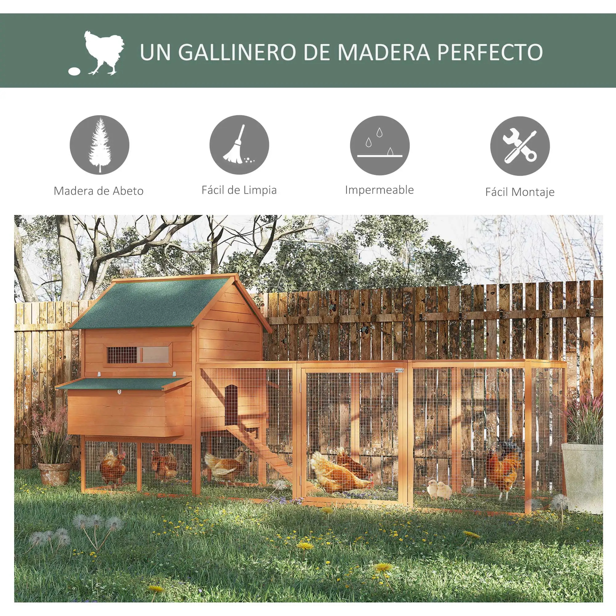 Si tienes gallinas sabrás lo importante que es brindarles un espacio adecuado a sus necesidades. Este gallinero para jardín grande es ideal porque tiene todo lo que necesitan. Nidos para poner sus huevos, una caseta elevada y cerrada para descansar, ventanas que hacen que su interior esté ventilado, bandeja extraíble para que sea fácil limpiarla y un espacio exterior protegido. No te lo pienses más y hazte con este gallinero para jardín grande que además tiene tejado protegido con tela asfáltica.