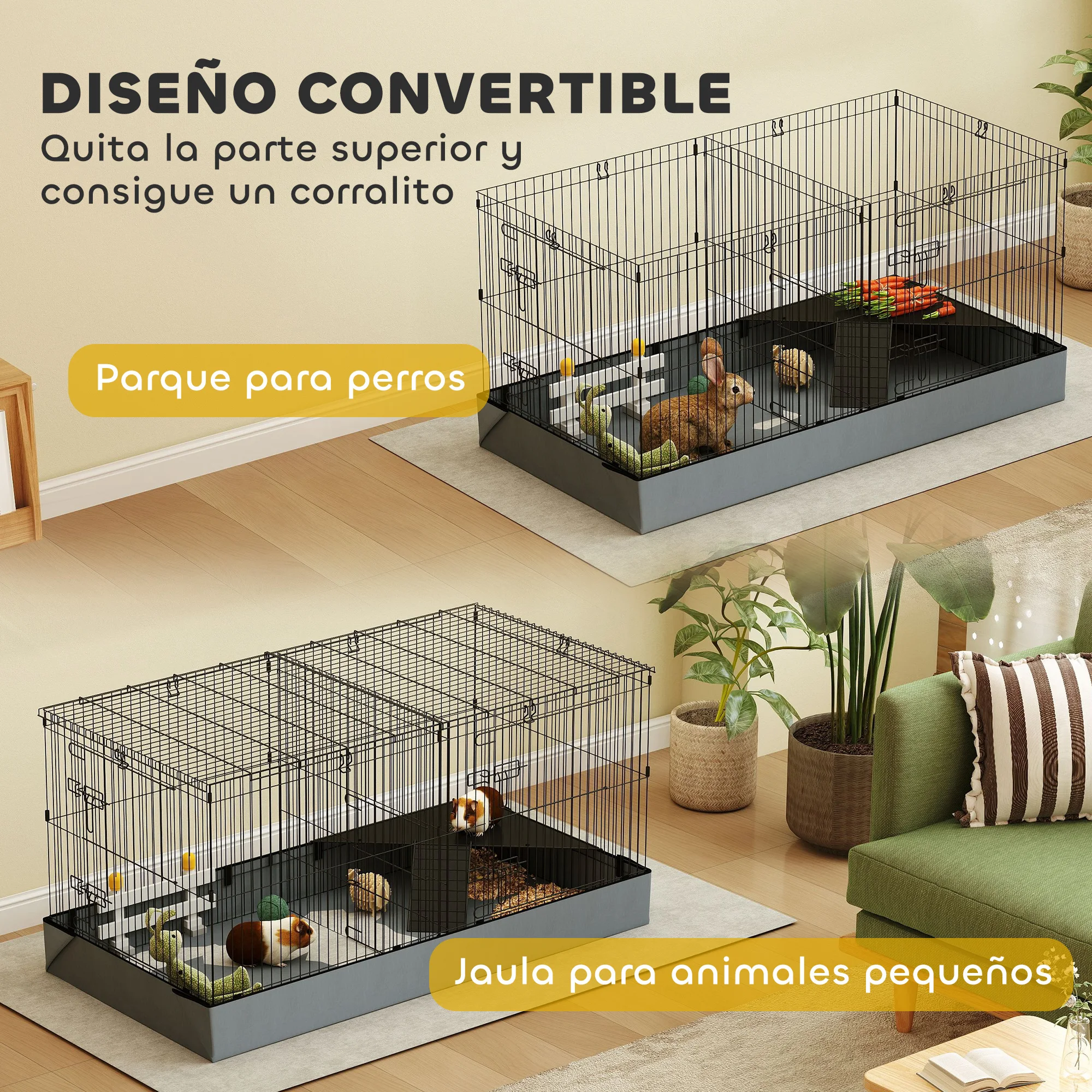 Descubre esta jaula para cobayas de PawHut, con un diseño innovador 2 en 1: se transforma de un seguro recinto a un divertido área de juego. Ideal para quienes tienen varias mascotas, cuenta con secciones separadas y una puerta para que tus amigos de cuatro patas puedan interactuar. Con un fondo impermeable, es fácil de limpiar y ofrece un espacio cómodo para las aventuras diarias de tus pequeños amigos.