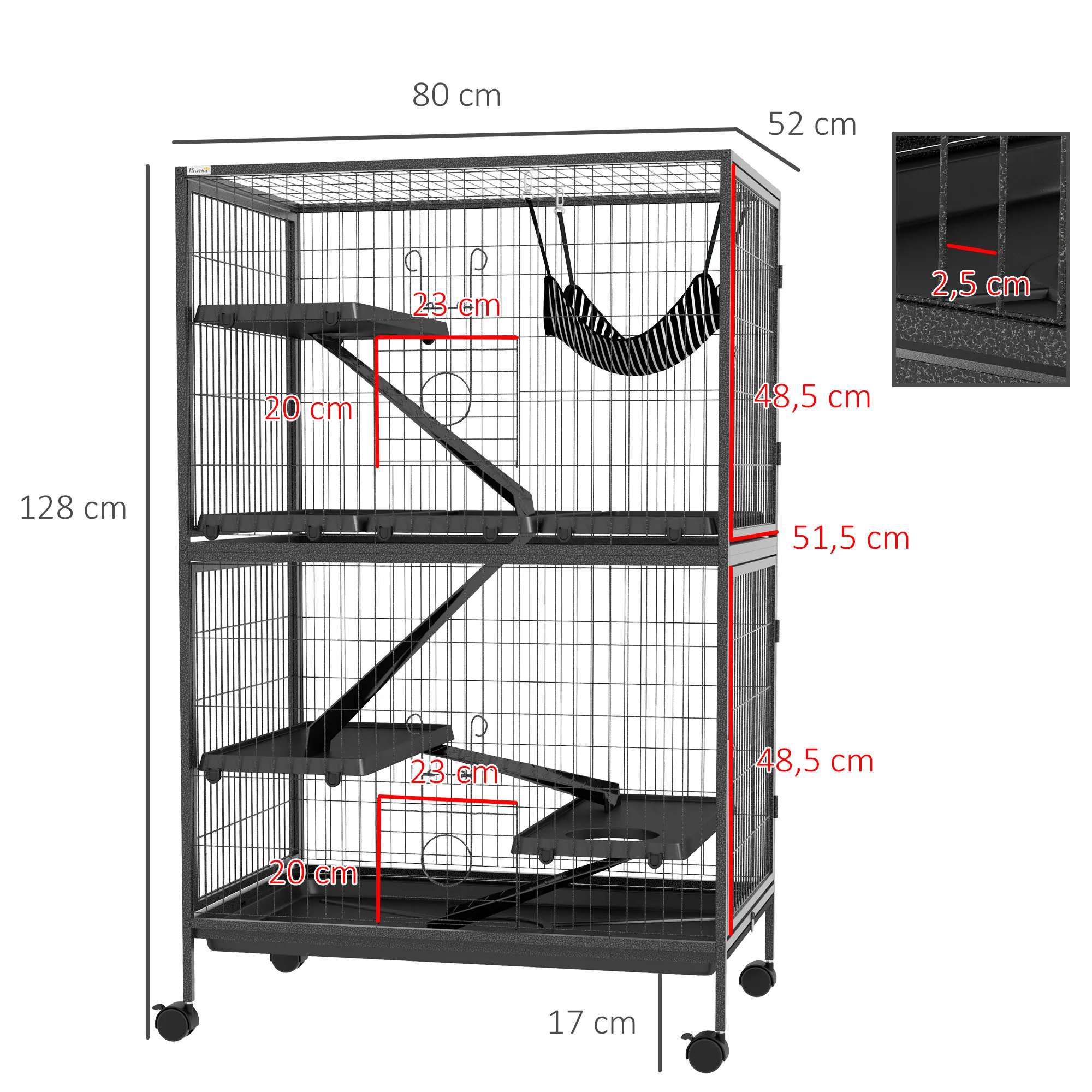 Esta jaula para pequeños roedores de PawHut es perfecta para aprovechar el espacio y poder mover a cualquier estancia de tu casa gracias a sus 4 ruedas. Cuenta con diferentes plataformas en 4 niveles de altura, rampas que las conectan y una hamaca colgante. Y este cercado para conejo tiene 4 puertas para acceder fácilmente a su interior y una bandeja inferior extraíble para limpiar cómodamente.