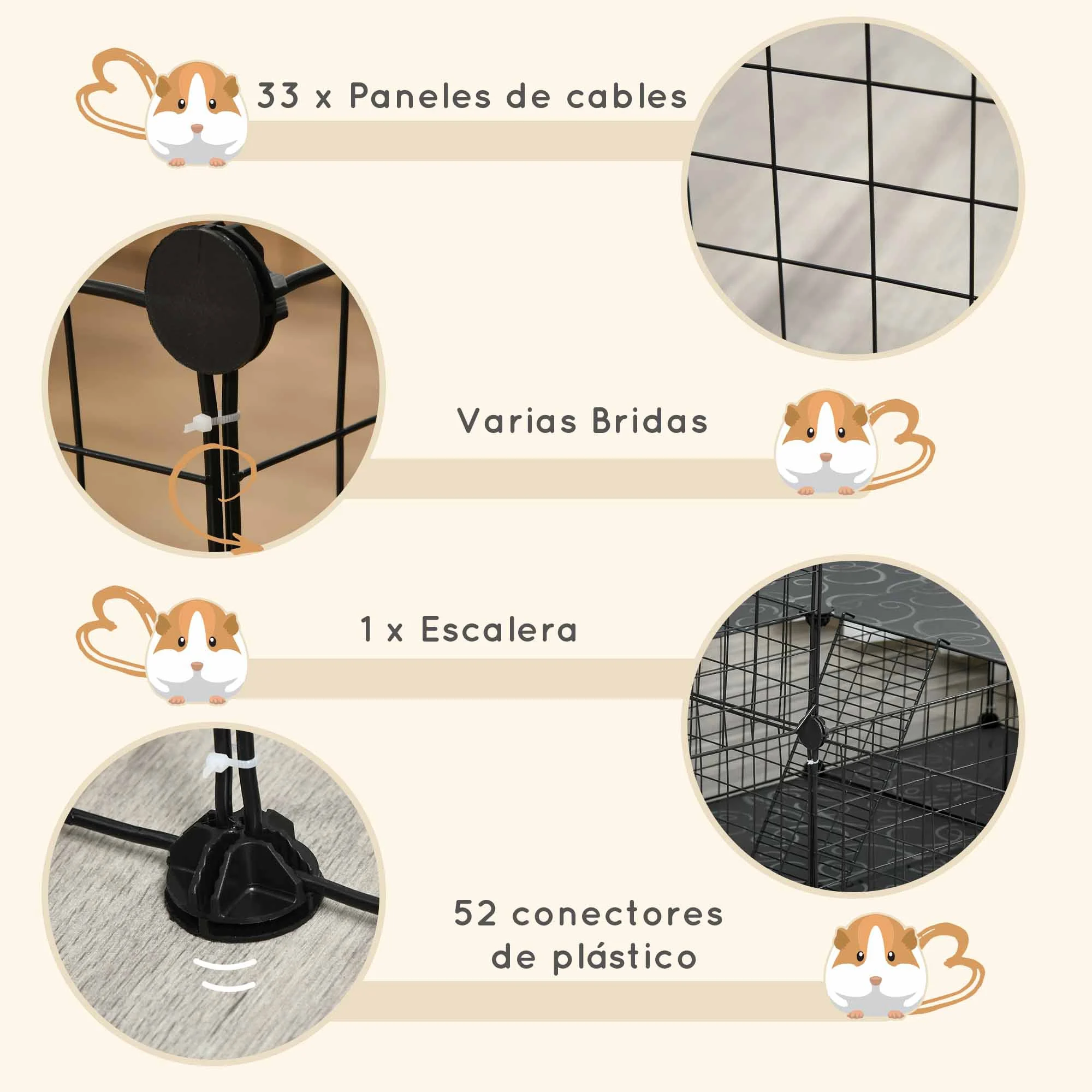 Características:● Este recinto para mascotas es ideal para pequeños animales como cobayas, chinchillas y conejos ● El diseño abierto permite interactuar con los animales desde todos los lados ● Está fabricado con materiales duraderos de acero y resina PP ● Este cercado para conejos cuenta con 47 paneles y 54 conectores, lo que te permite moldear la jaula según tus necesidades ● Este recinto para conejos tiene dos puertas para un acceso fácil ● Este recinto para animales pequeños incluye cierres para mayor seguridad ● Se requiere un fácil montaje