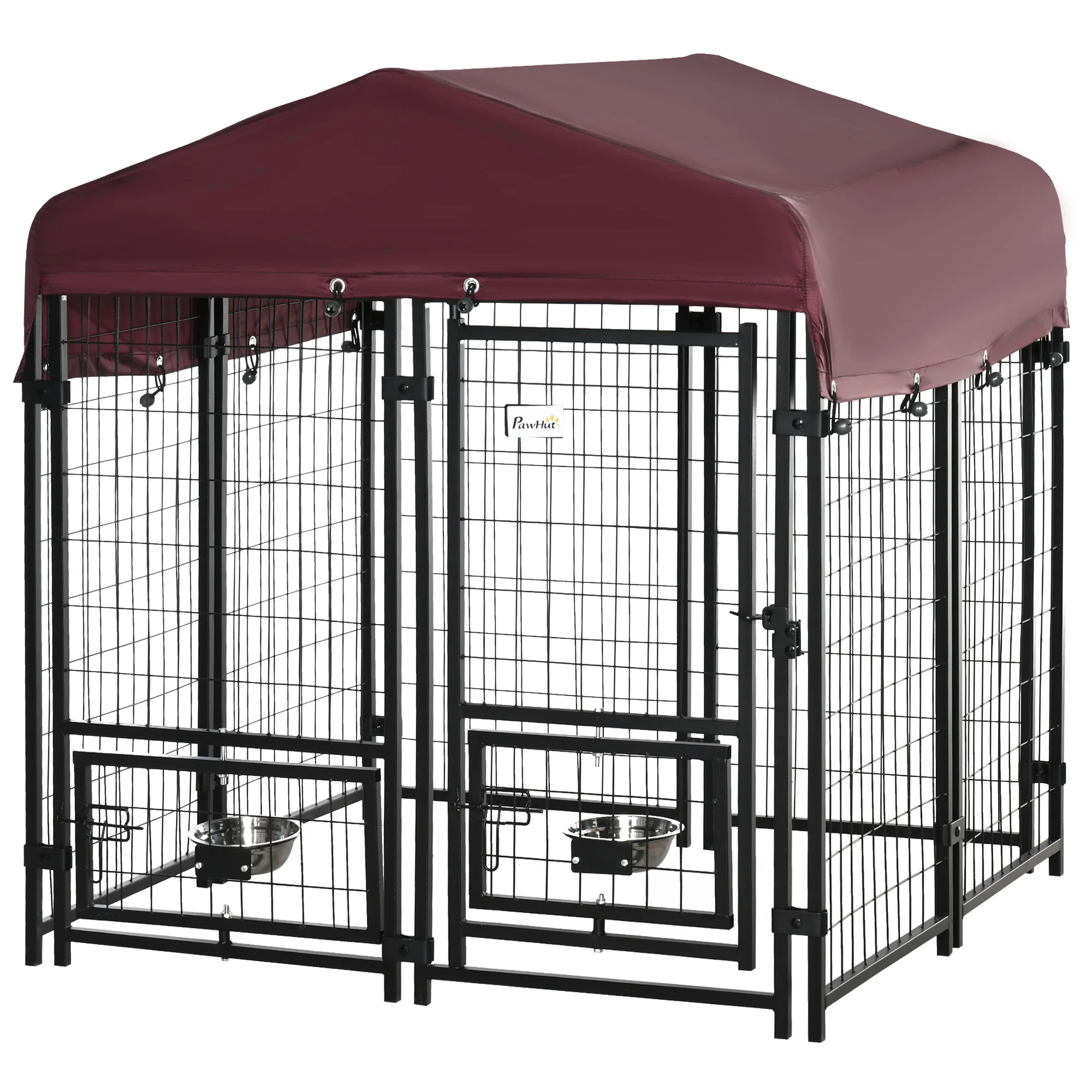 Especificaciones: - Color: negro y granate - Material: acero y tela Oxford - Medidas totales: 120x120x138/105,7 cm (con techo / sin techo) - Medidas de cada panel: 56,7x105,7 cm (LxAL) - Medidas de la puerta: 46x94,6 cm (LxAL) - Medidas de los paneles con los soportes para cuencos: 39x26 cm (en la puerta), 50x26 cm (parte fija) - Medidas de los cuencos: Ø18x6 cm (DxAL) - Capacidad del recipiente: 900 ml - Referencia: D02-094