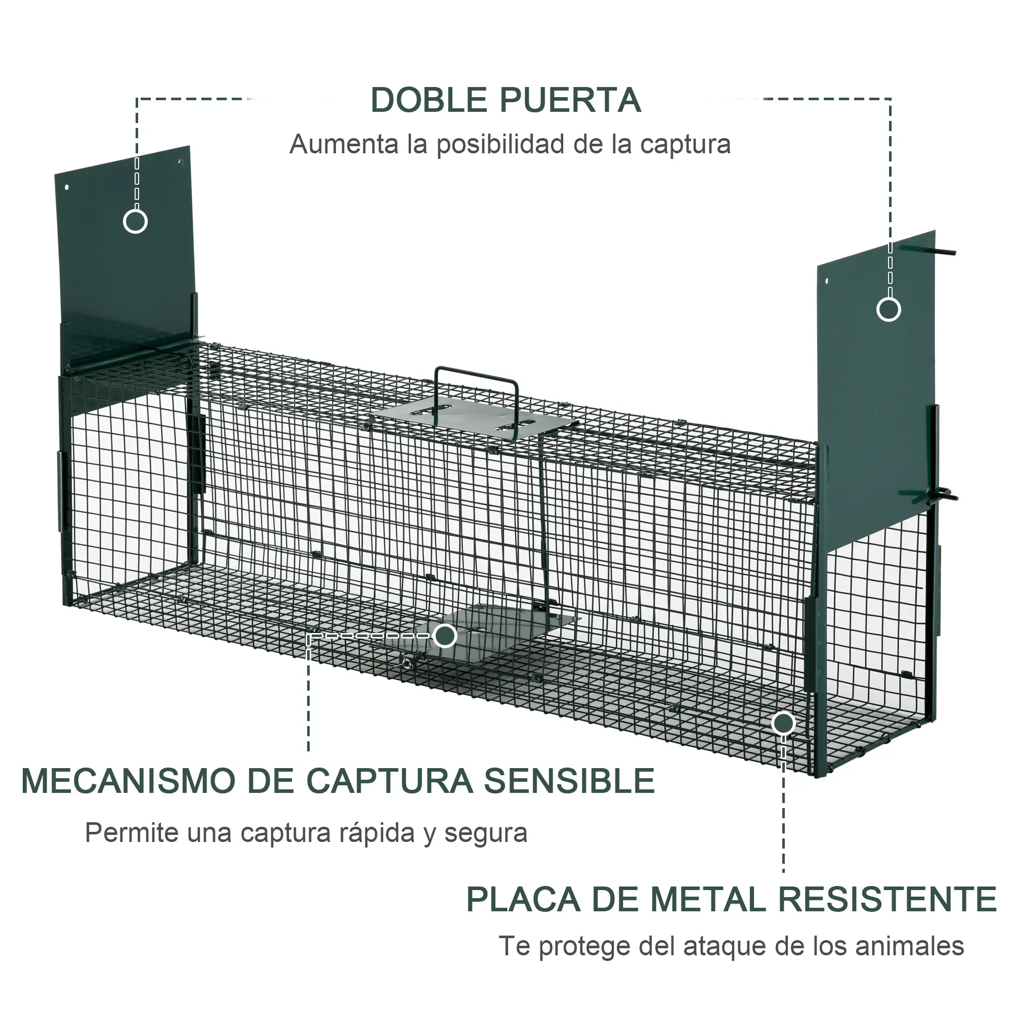 ¿Hay un animal que destroza tu jardín y quieres capturarlo sin hacerle daño? Entonces esta Trampa en forma de jaula de PawHut te va a alegrar. En ella vas a poder capturar los animales vivos sin lastimarlos. Su mecanismo de alta sensibilidad ofrece una gran eficiencia de captura con gran precisión. Apta para interiores y exteriores, para usar según tus necesidades. En exteriores y en plena naturaleza, gracias a su color verde, pasará desapercibida entre los animales. ¡La trampa que no daña!