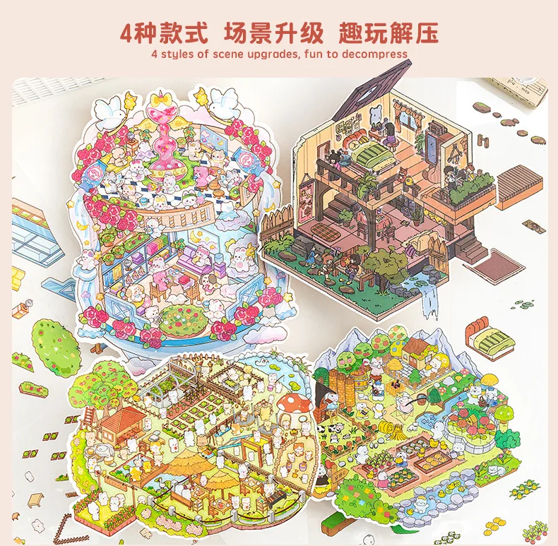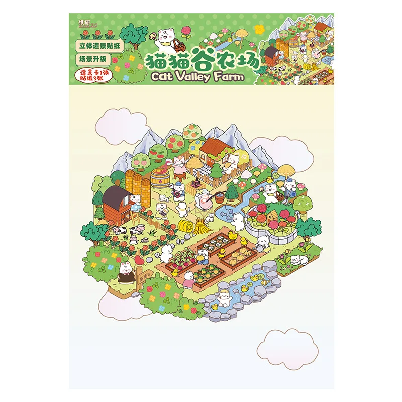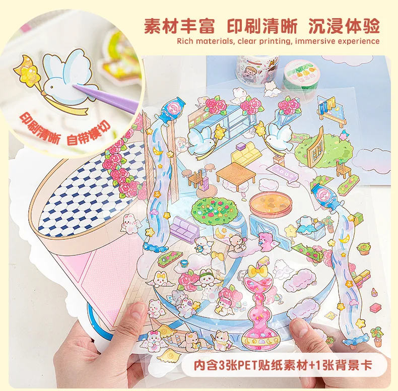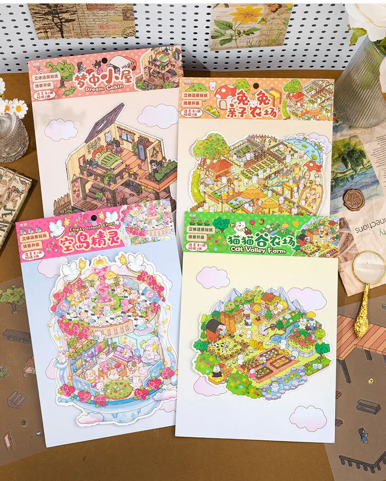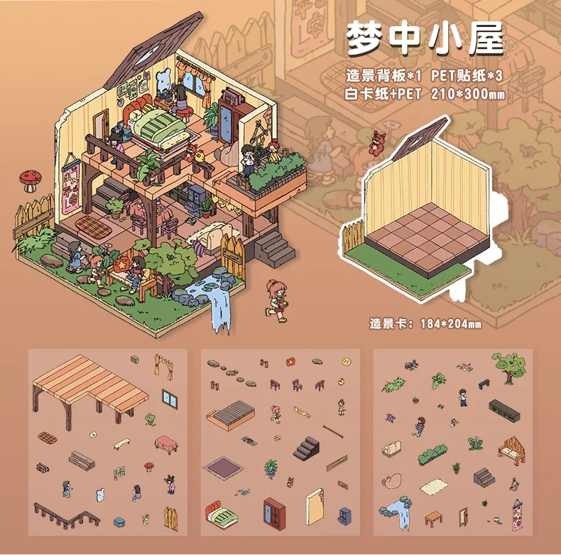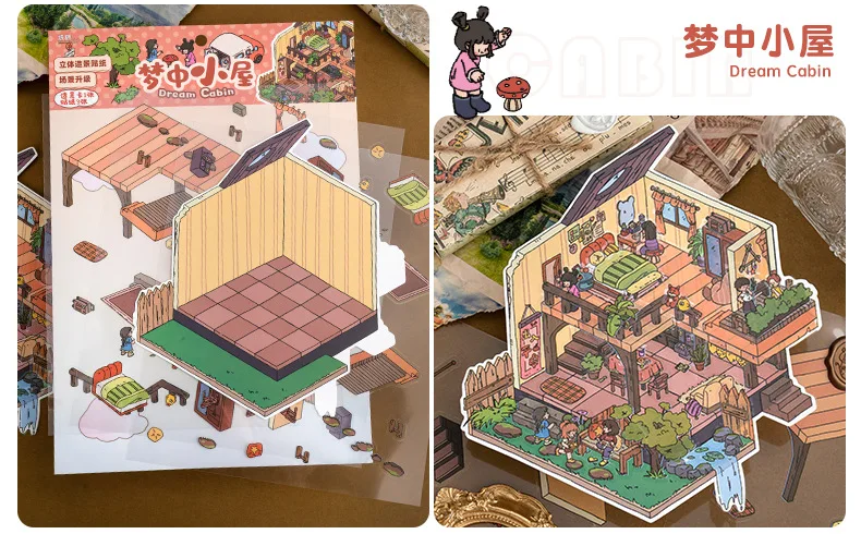 Pegatinas de escena 3D de talla grande, escena de cabina de dibujos animados, calcomanías de escena DIY, álbum de recortes, apilamiento y pegado, pegatina para hacer paisaje