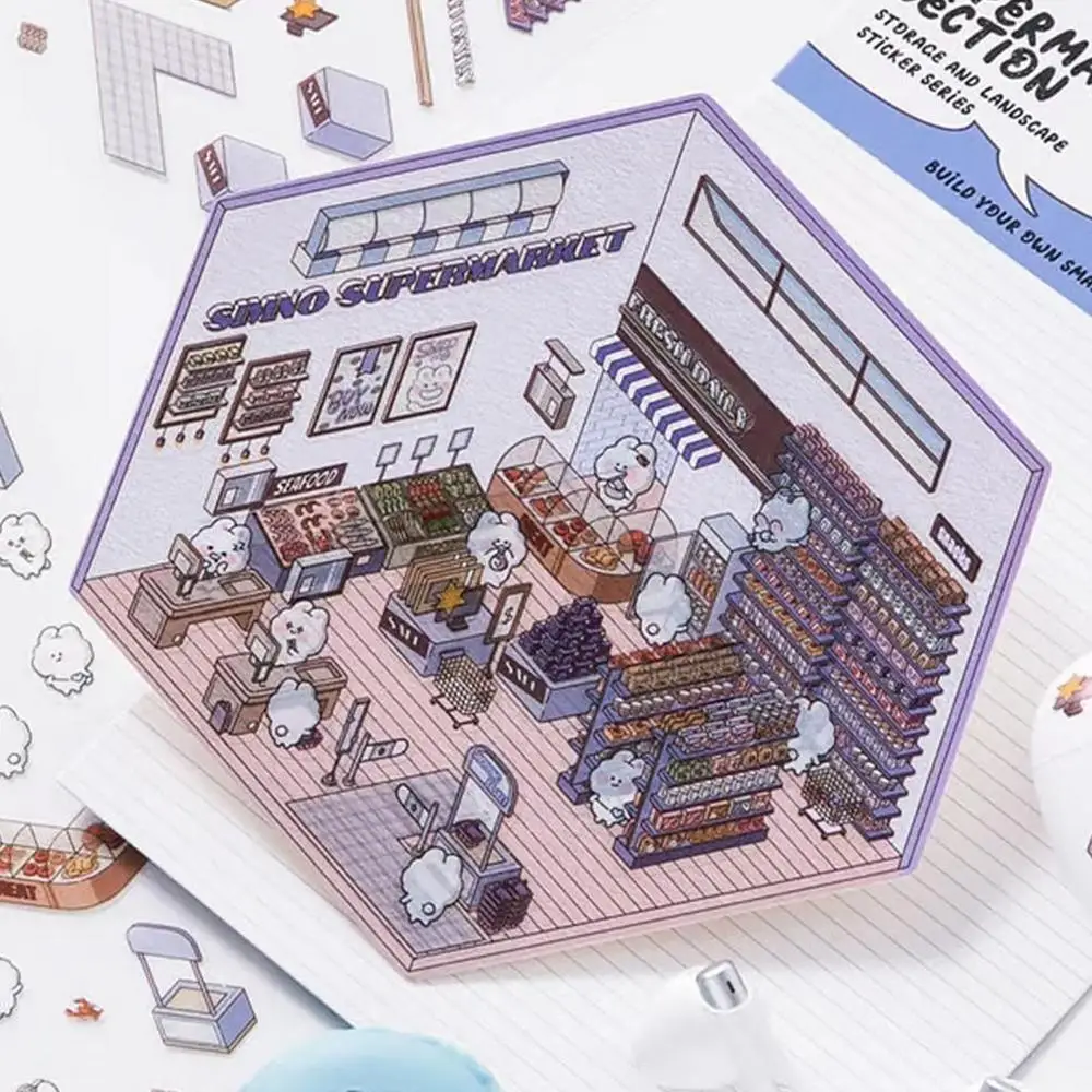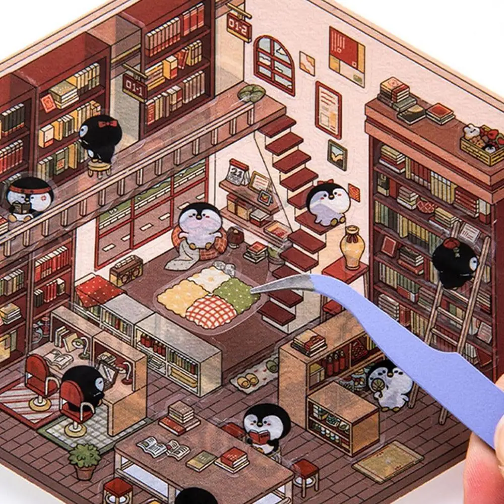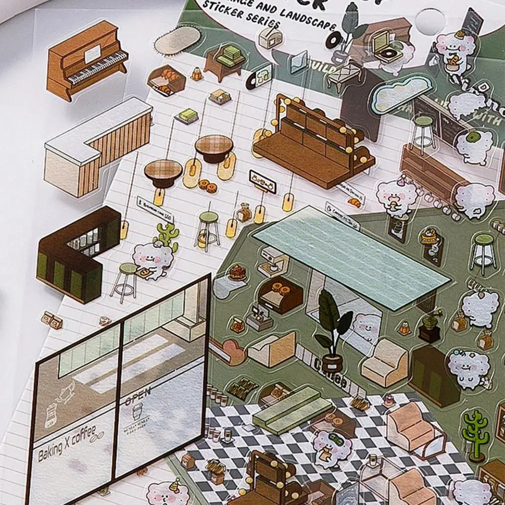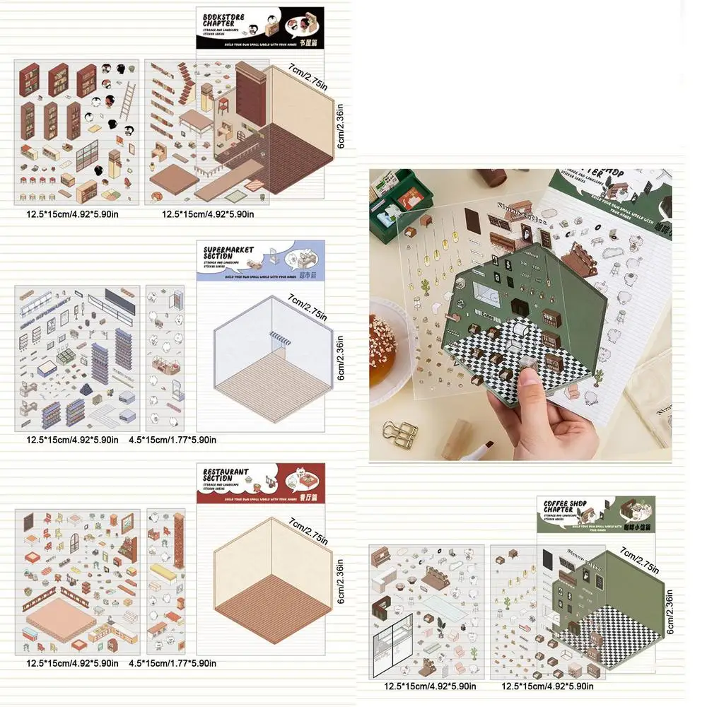 1.Un kit completo de pegatinas para la casa: incluye tadar para asegurar papel; El tipo A muestra 4 temas: comestibles, cafeterías, librerías y cometerías; El tipo B presenta 4 temas: Sunny House, Buffet Biblioteca, Feline Cafe y panadería.