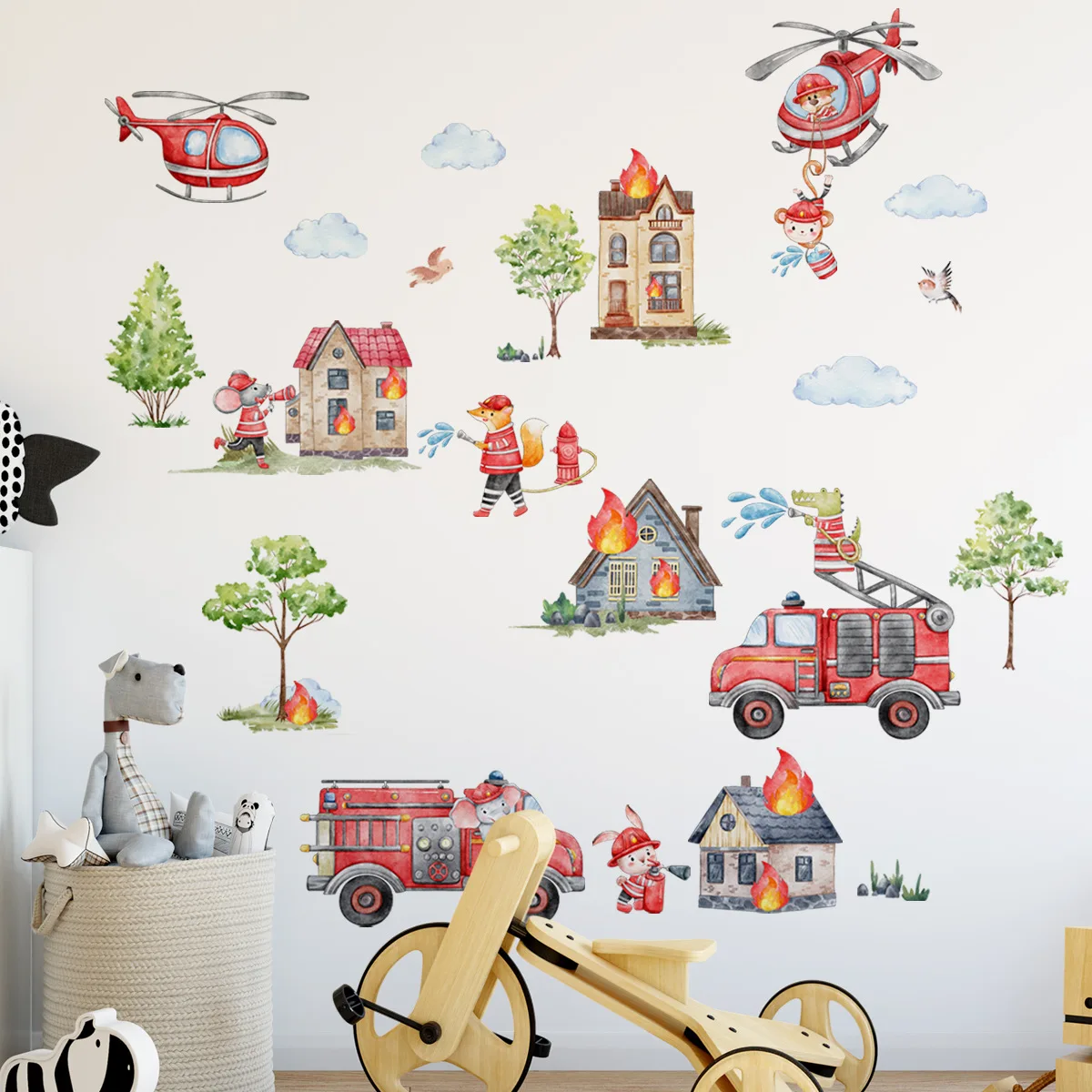 Comprar Pegatinas de pared de animales de dibujos animados, camión de bomberos, helicóptero, habitación de niños, decoración de dormitorio de niños, guardería, bebé, calcomanías de pared