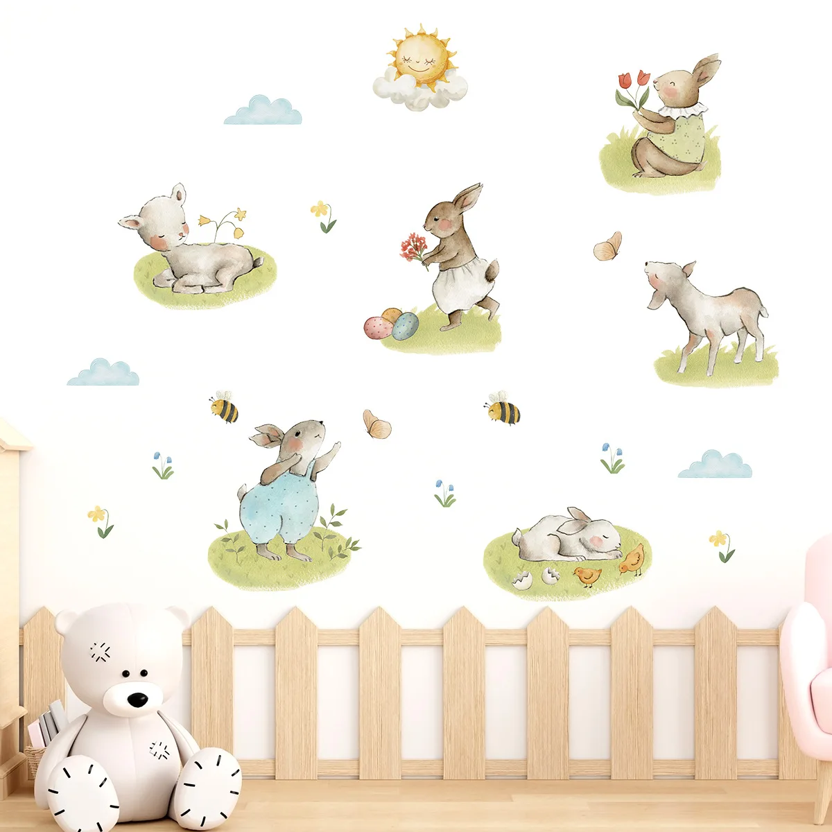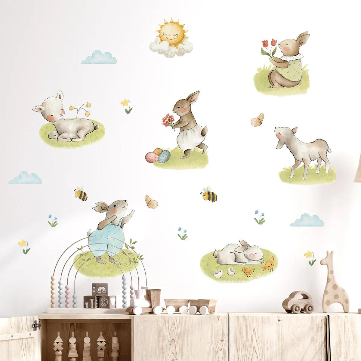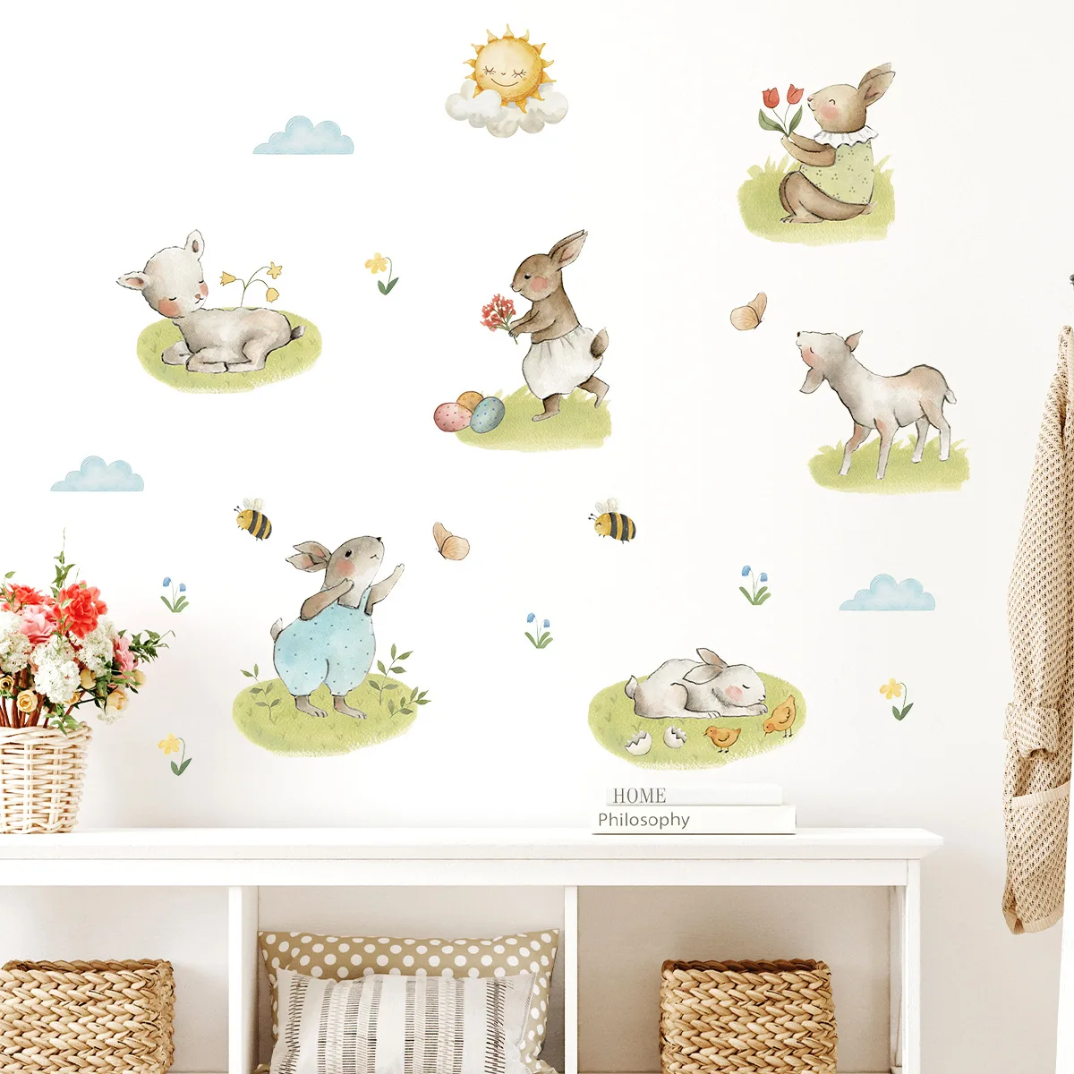 Comprar Pegatinas de pared de conejos de dibujos animados para decoración de dormitorio de habitación de niños, calcomanías de pared para guardería, papel tapiz para guardería