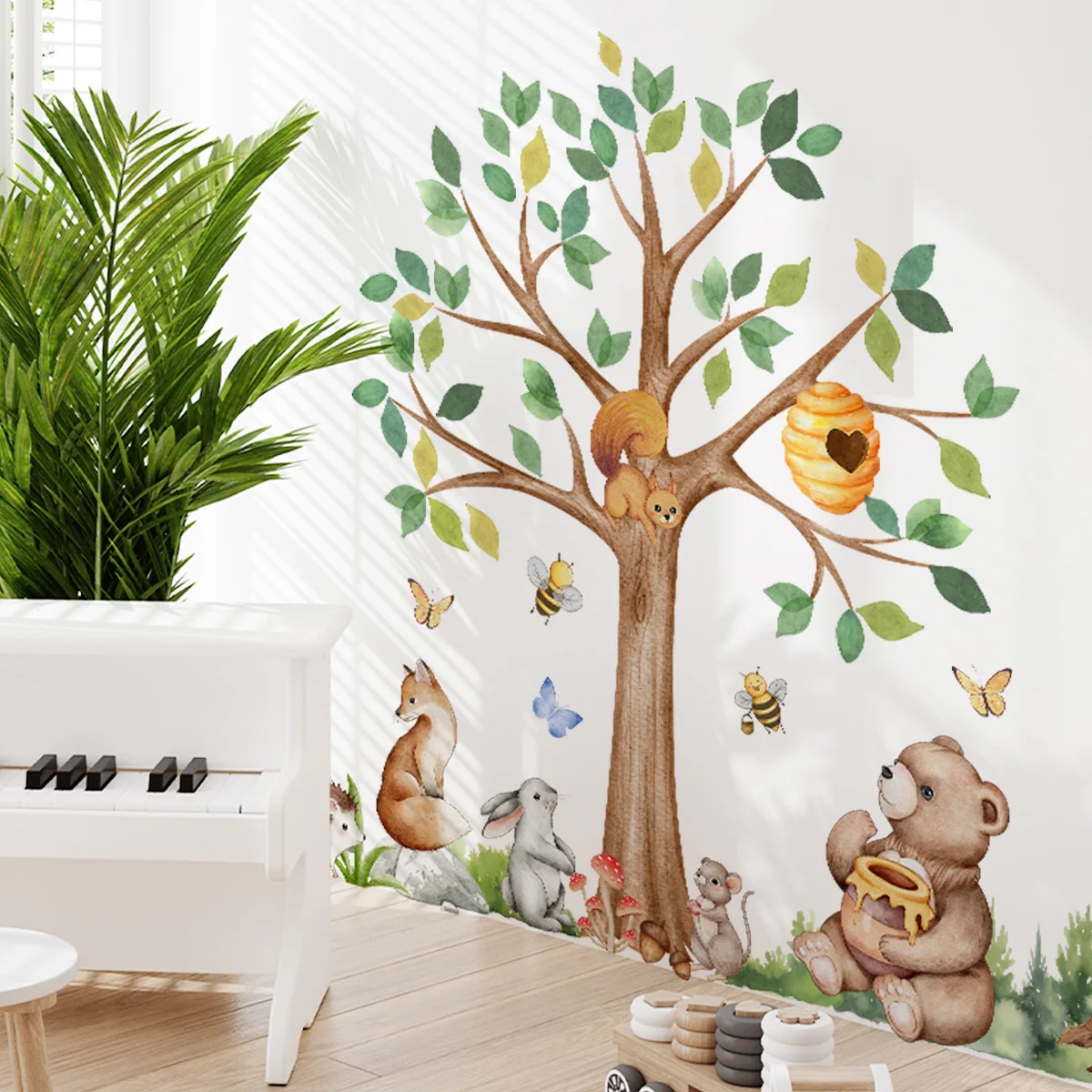 Comprar Pegatinas de pared de oso pequeño para habitación de niños, calcomanías de pared de abeja de árbol de gran tamaño, decoración de pared de guardería de bebé, guardería