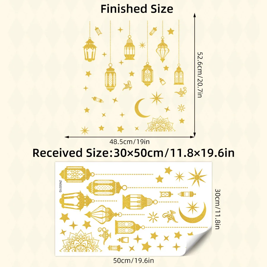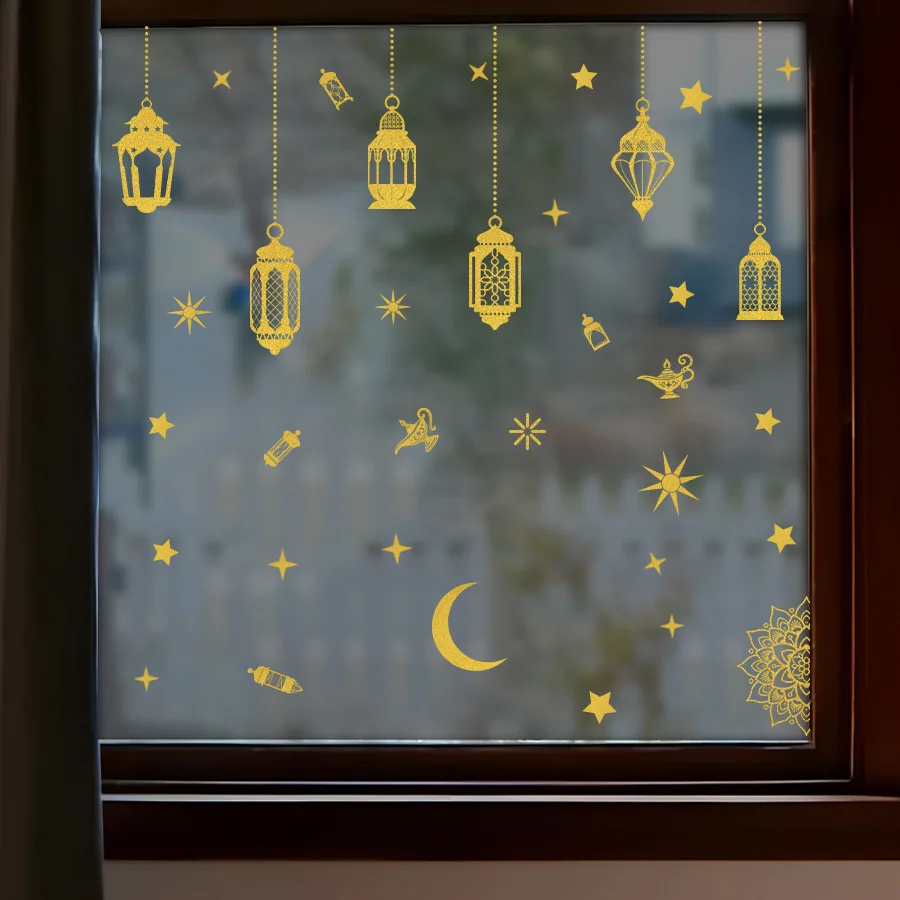 Pegatinas de ventana de linterna de Luna y estrella dorada, pegatinas de pared para decoración de Ramadán, dormitorio, sala de estar, pegatinas de decoración de pared del hogar
