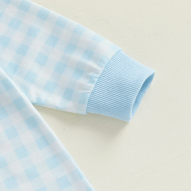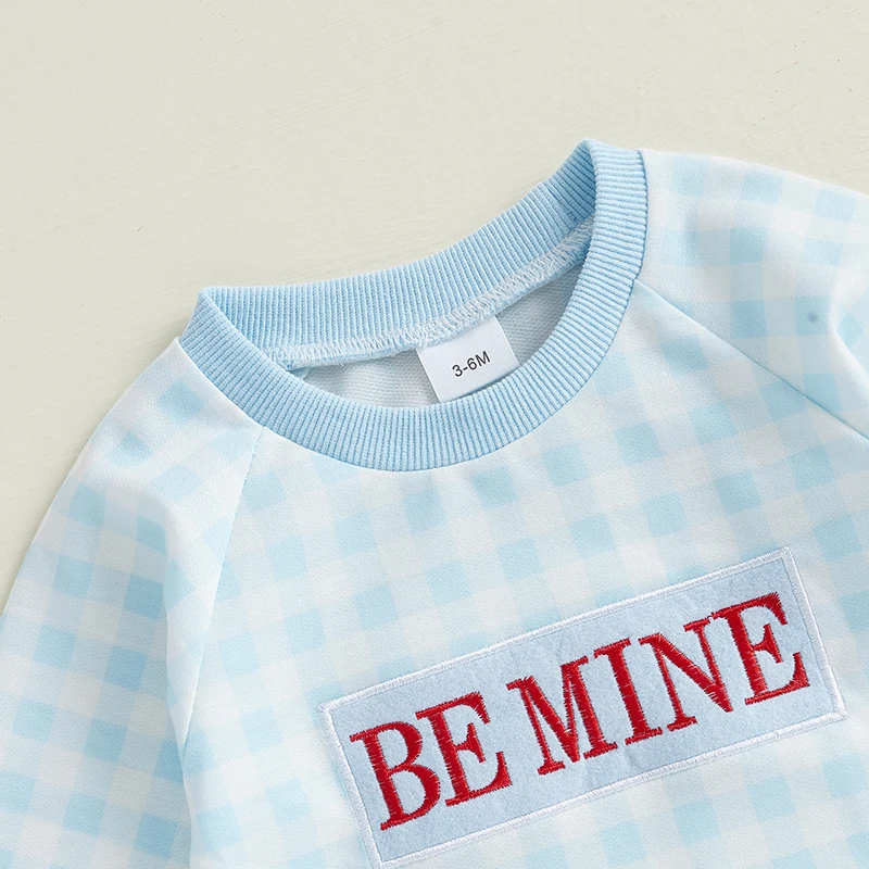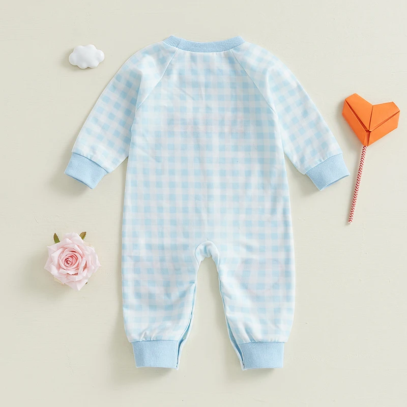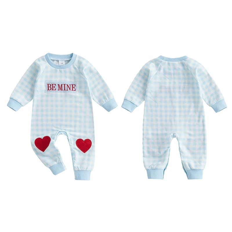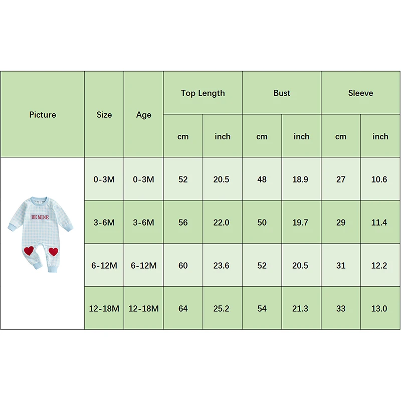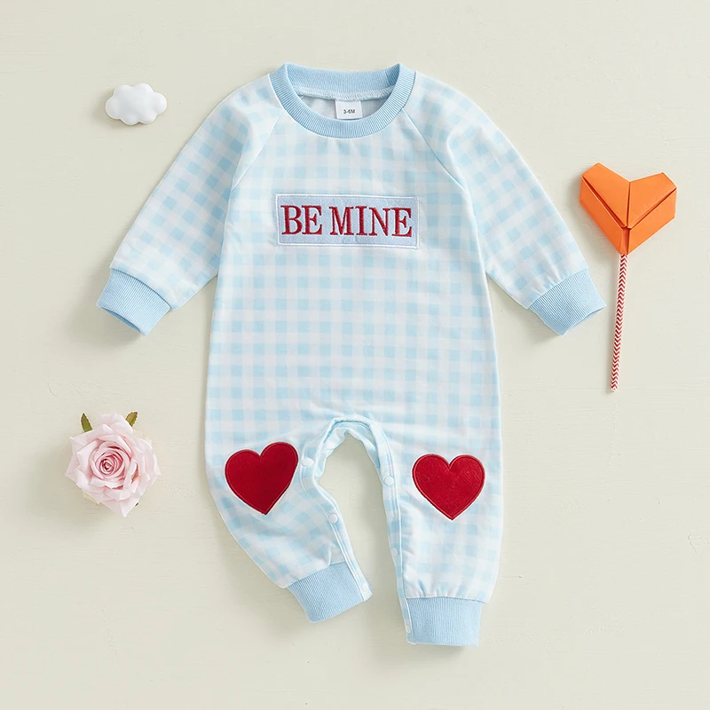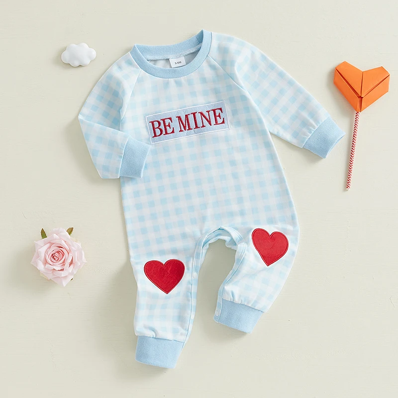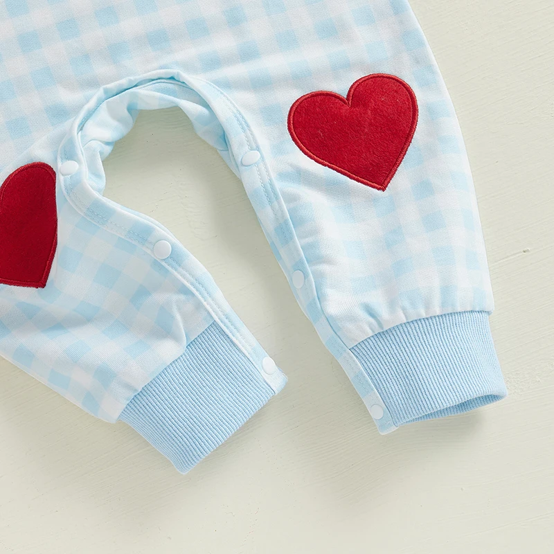 Conjunto de San Valentín para bebé; Pelele de manga larga para niño pequeño con estampado de cuadros, bordado de letras, manga larga, escote redondo y botones en la entrepierna; Lindo y cómodo, tu pequeño recibirá muchos elogios al usarlo.