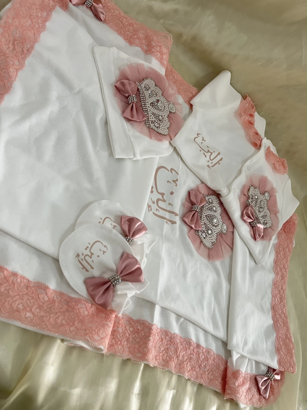 Nuestro juego de 5 piezas está hecho de algodón suave y grueso. Están adornados con botones de diamantes de imitación, joyas de la Corona y lazos.