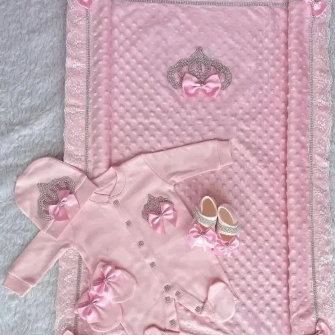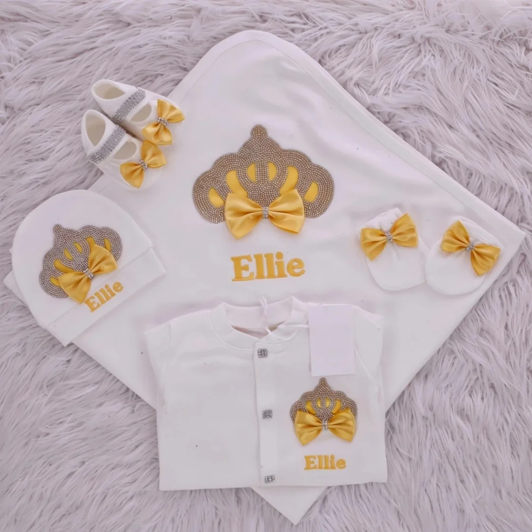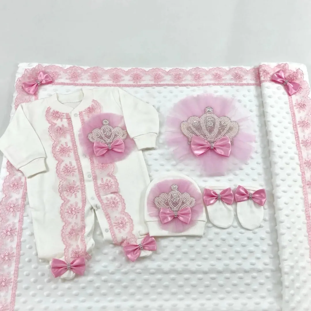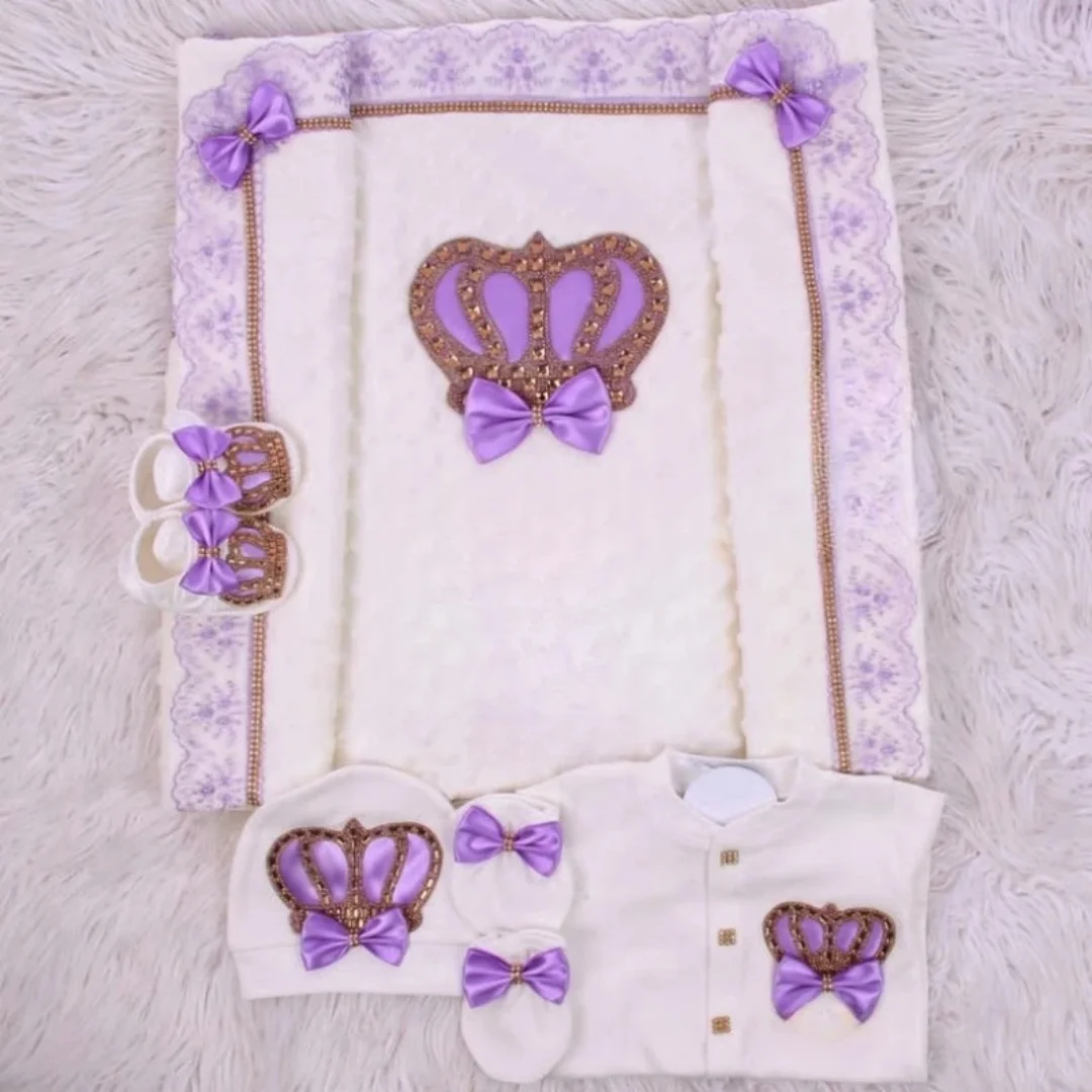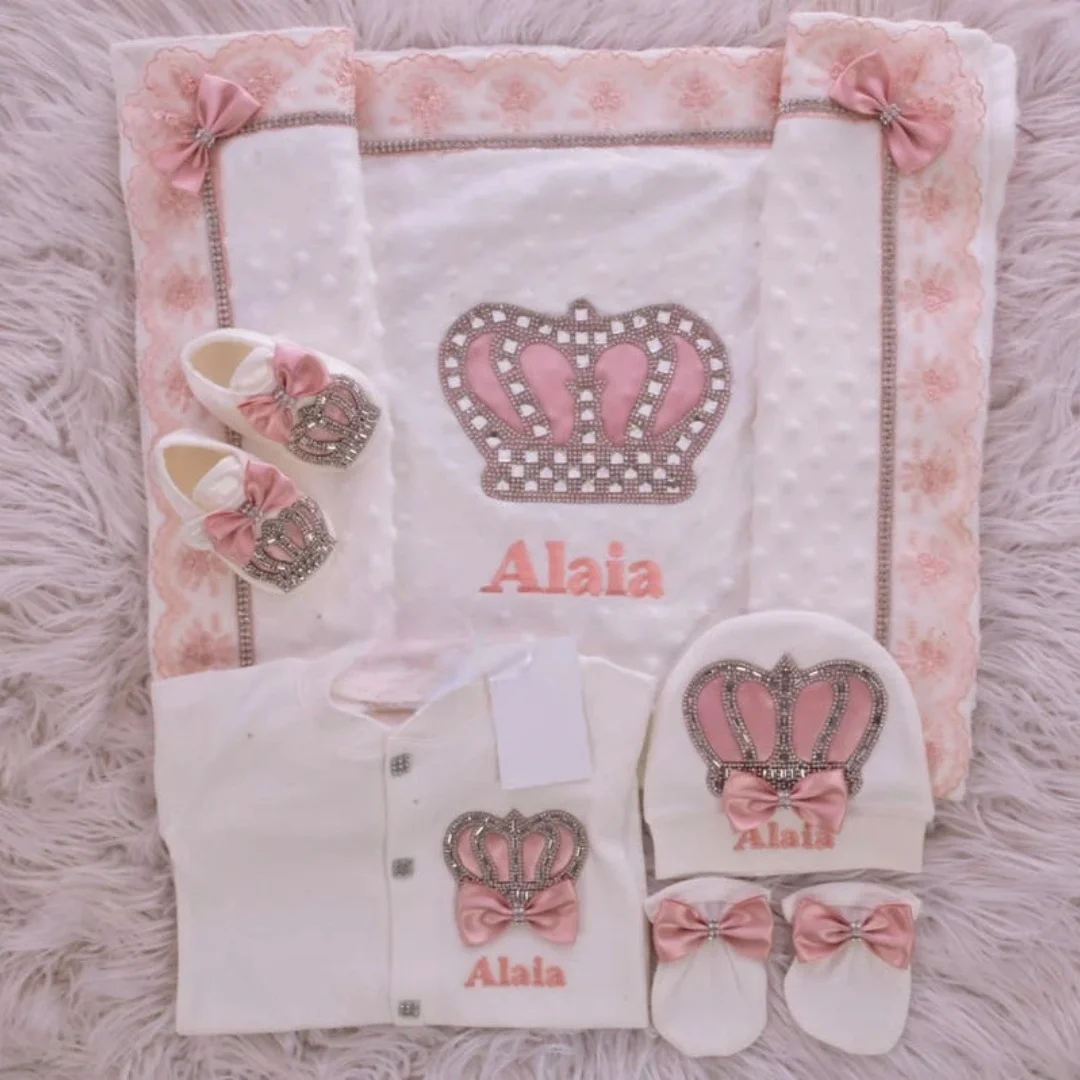 Nuestro juego de 5 piezas está hecho de algodón suave y grueso.Están adornados con botones de diamantes de imitación, joyas de corona y lazos.
