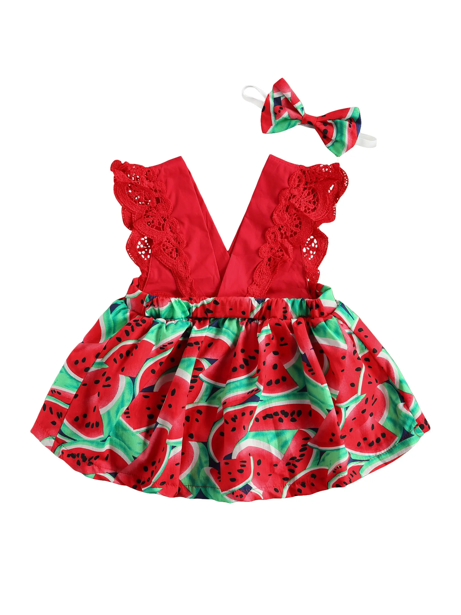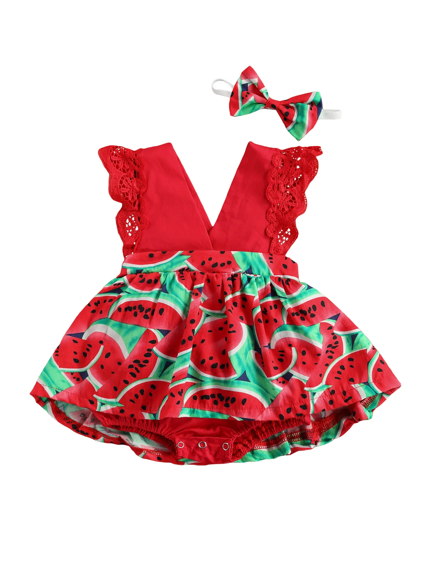 Ropa de bebé niña, Pelele con estampado de sandía para niñas, sin mangas, cuello en V profundo, Mono corto, diadema con lazo, conjunto de ropa para niños