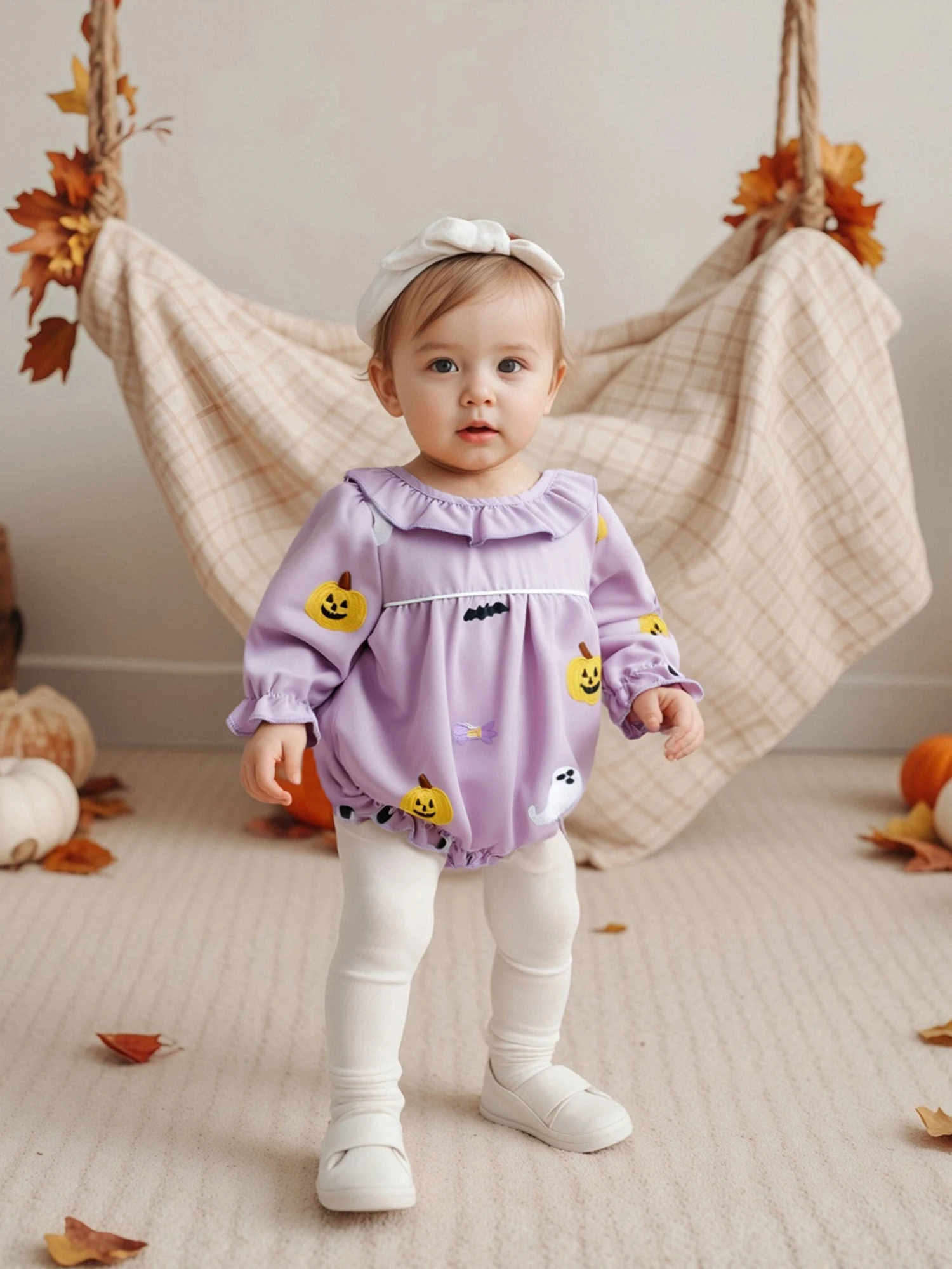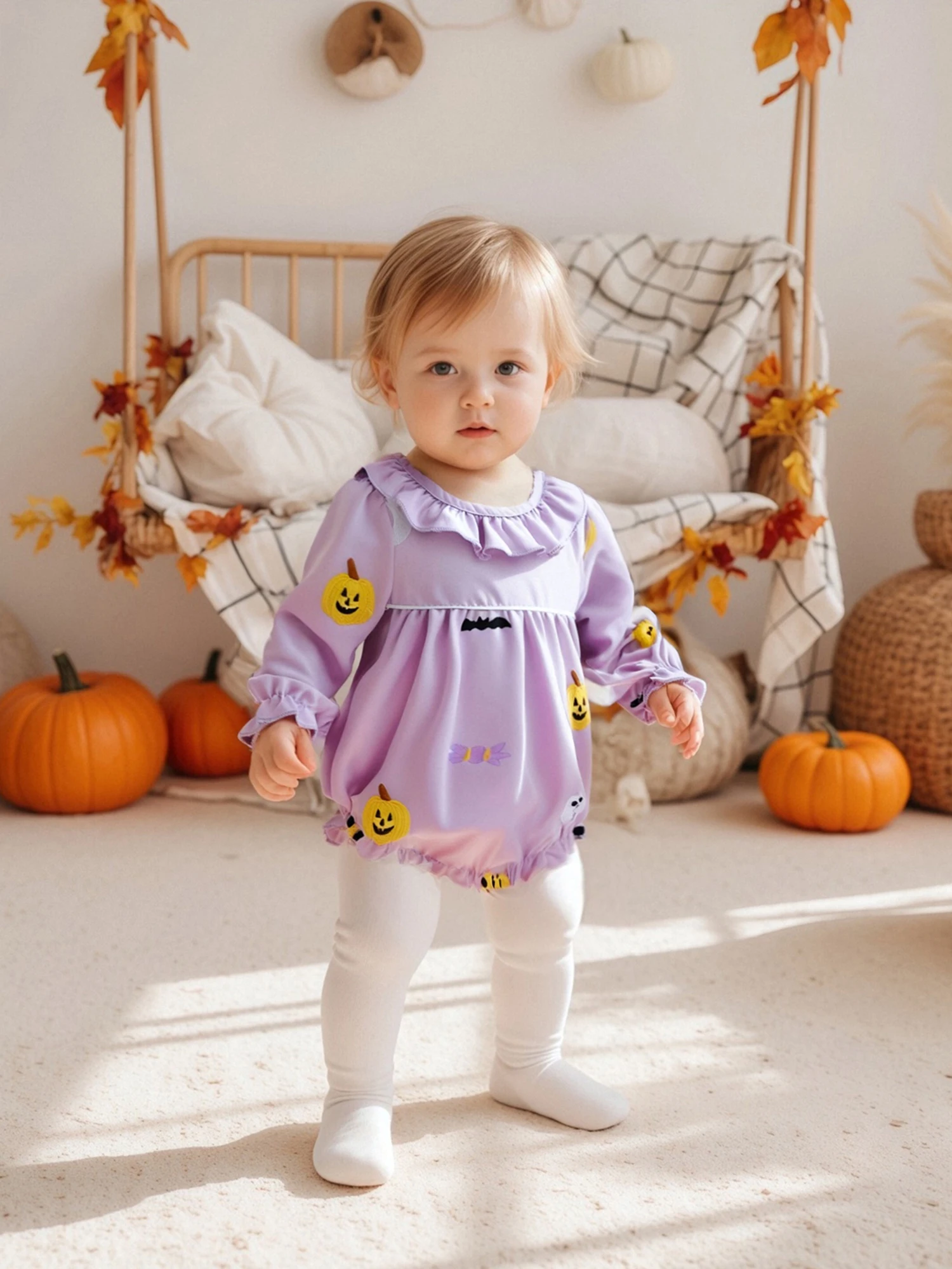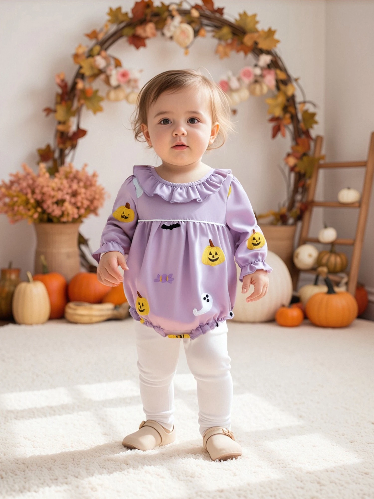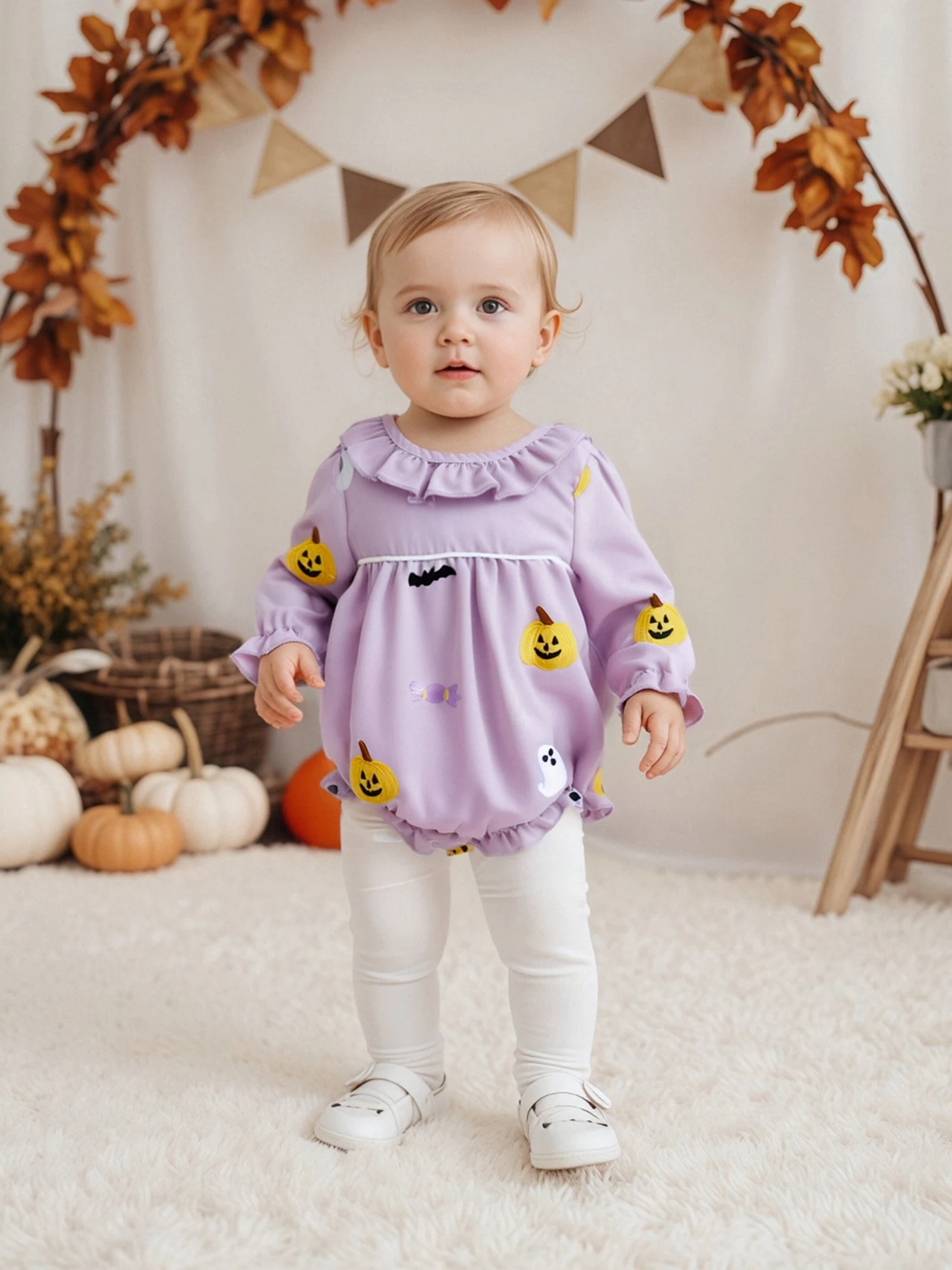 Pelele de Halloween para niña de 0 a 18 meses, mono de burbujas con cuello redondo y volantes de manga larga con bordado de calabaza fantasma - imagen 5