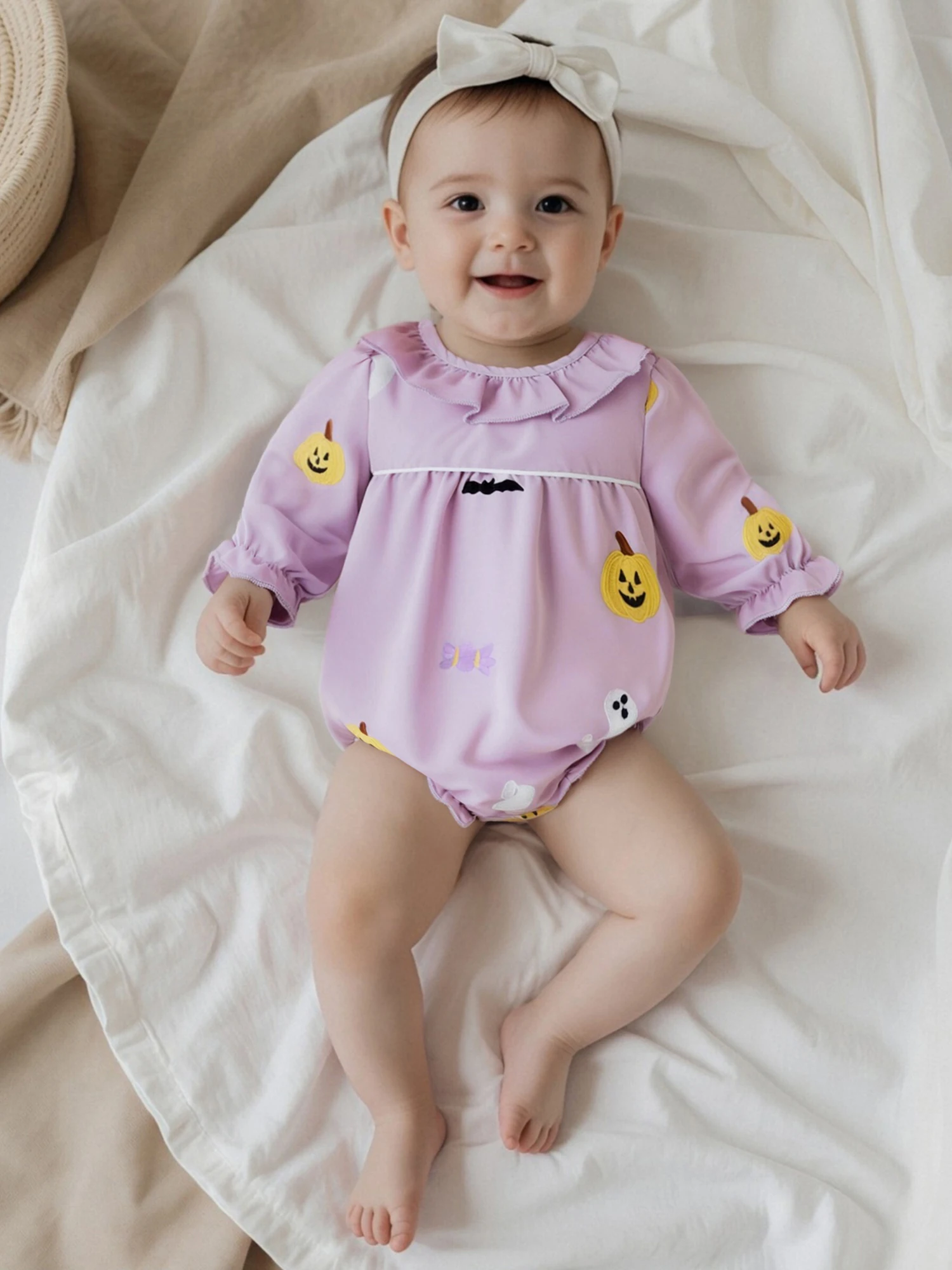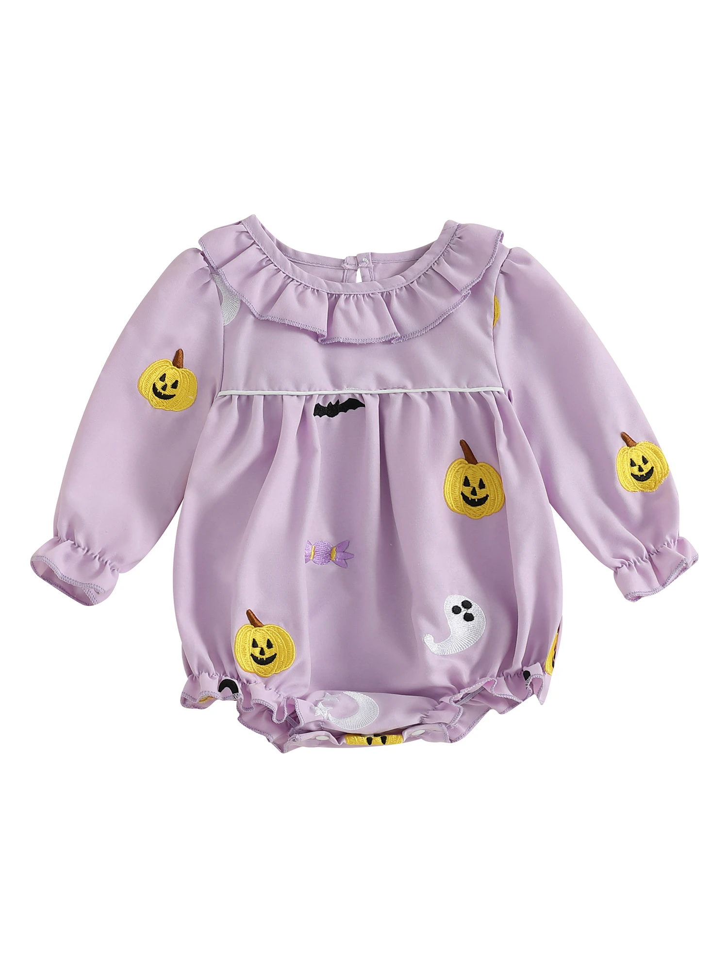 Mameluco de Halloween para niña, mono de burbujas con cuello redondo y volantes de manga larga con bordado de calabaza fantasma
