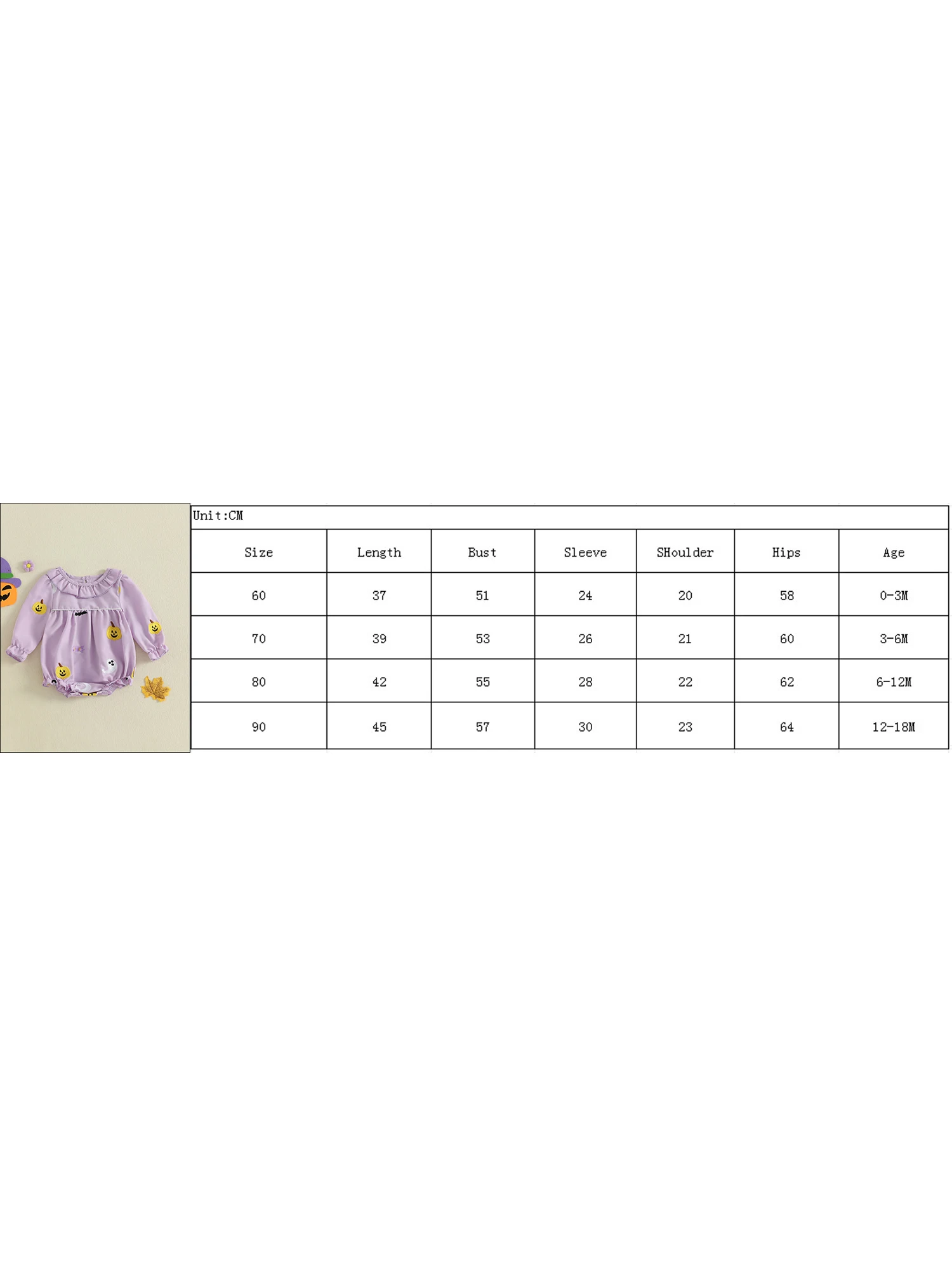 70 Longitud: 39 Busto: 53 Manga: 26 Hombro: 21 Cadera: 60 Edad recomendada: 3-6 meses