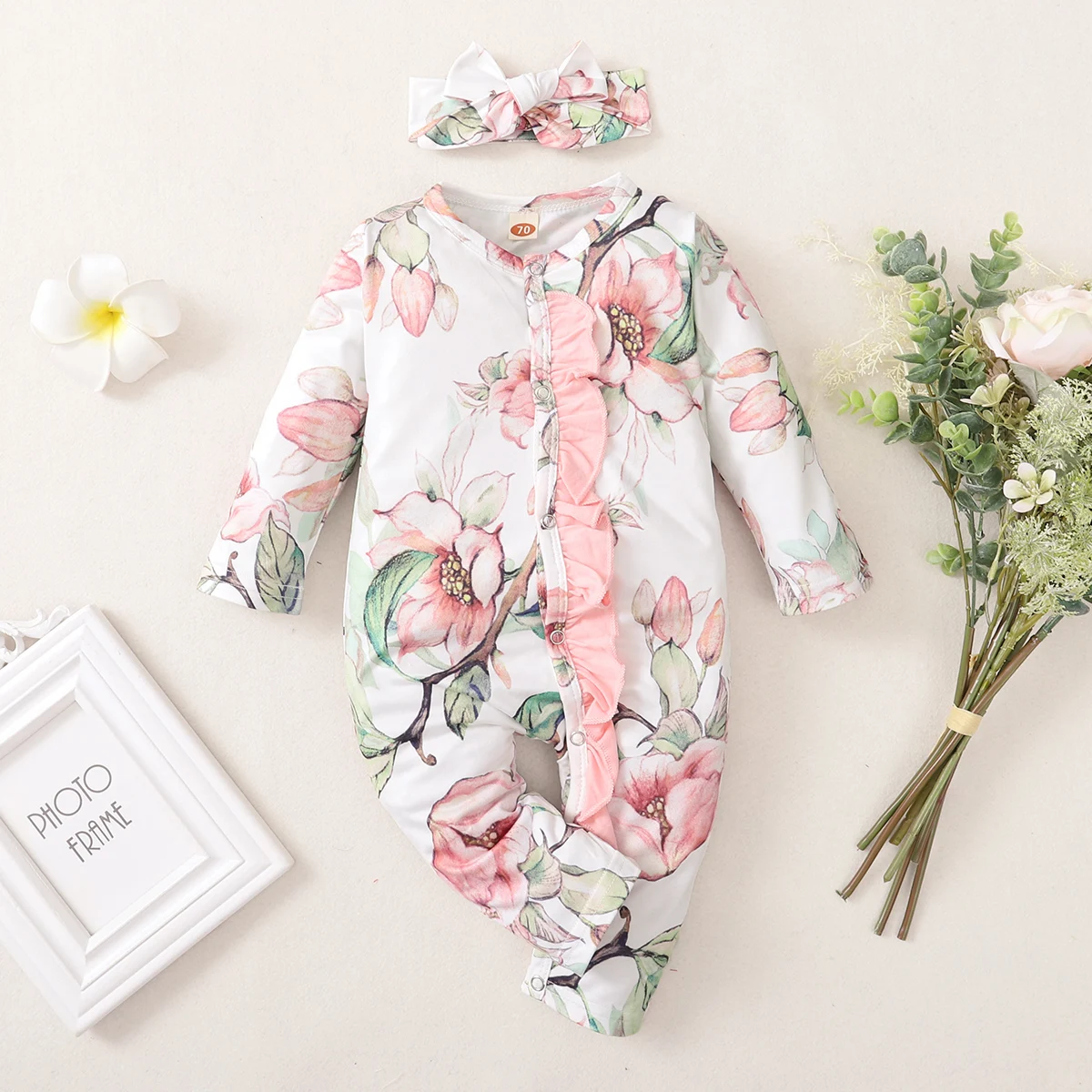 Comprar Pelele para niña recién nacida, body Floral de manga larga con volantes laterales y Diadema con lazo, mono de moda para niña de 0 a 18 meses