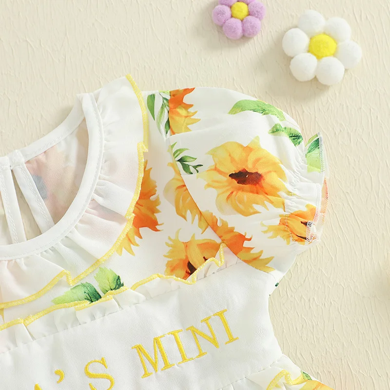 Características El mameluco de verano para niña con estampado floral y bordado de letras añade un toque de ternura al armario de tu bebé; Mangas cortas, escote redondo y volantes, sencillos pero elegantes, hacen que tu bebé sea aún más adorable. Adecuado para uso diario casual, juegos al aire libre, bodas, vacaciones, fiestas de cumpleaños, reuniones familiares y fotografía.
