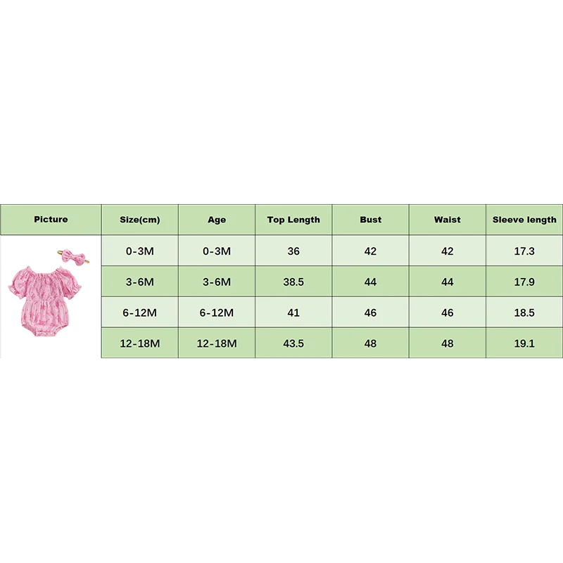Vestido mameluco de Pascua para niña, manga corta abombada, hombros descubiertos, estampado de conejito, mameluco con diademaTamaño (cm)0-3M Longitud: 36 Busto: 42 Manga: 17.3 Cintura: 42 Edad recomendada: 0-3 meses3-6M Longitud: 38,5 Busto: 44 Manga: 17,9 Cintura: 44 Edad recomendada: 3-6 meses6-12M Longitud: 41 Busto: 46 Manga: 18,5 Cintura: 46 Edad recomendada: 6-12 meses12-18M Longitud: 43,5 Busto: 48 Manga: 19.1 Cintura: 48 Edad recomendada: 12-18 mesesTamaño (pulgadas)0-3M Longitud: 14,17 Busto: 16,54 Manga: 6,81 Cintura: 16,54 Edad recomendada: 0-3 meses3-6M Longitud: 15,16 Busto: 17.32 Manga: 7,05 Cintura: 17.32 Edad recomendada: 3-6 meses6-12M Longitud: 16.14 Busto: 18,11 Manga: 7,28 Cintura: 18,11 Edad recomendada: 6-12 meses12-18M Longitud: 17.13 Busto: 18,9 Manga: 7,52 Cintura: 18,9 Edad recomendada: 12-18 mesesEspecificación:Material: 100% algodónLongitud de la manga: cortaTipo de patrón: ConejitoGénero: NiñaTipo de artículo: mamelucoPaquete incluido:1 mameluco + 1 diadema.Consejos amigables:1.Por favor permita una diferencia del 2-3% según la medición manual.2.Consulte cuidadosamente la tabla de medidas antes de comprar el artículo.(1 pulgada=2,54 cm)3.Tenga en cuenta que debe aceptarse una ligera diferencia de color debido a la luz y la pantalla.Gracias.Promesa:Si el producto tiene algún problema de calidad, háganoslo saber, lo ayudaremos a resolver el problema lo más rápido posible.