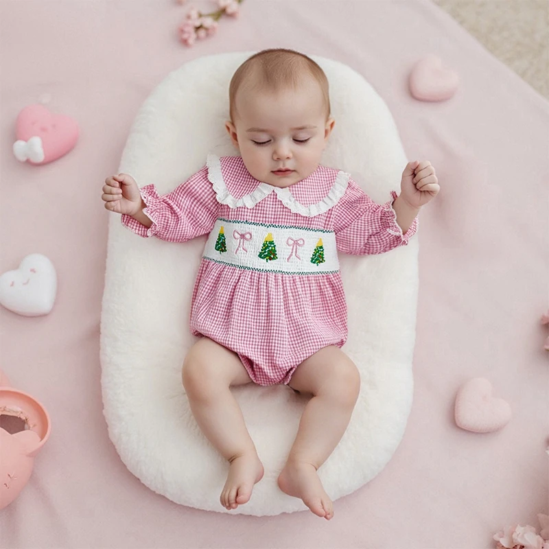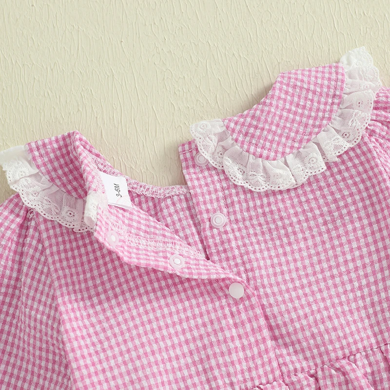 Mameluco de primavera para niñas con estampado de cuadros y lazo bordado manga larga con cuello de muñeca
