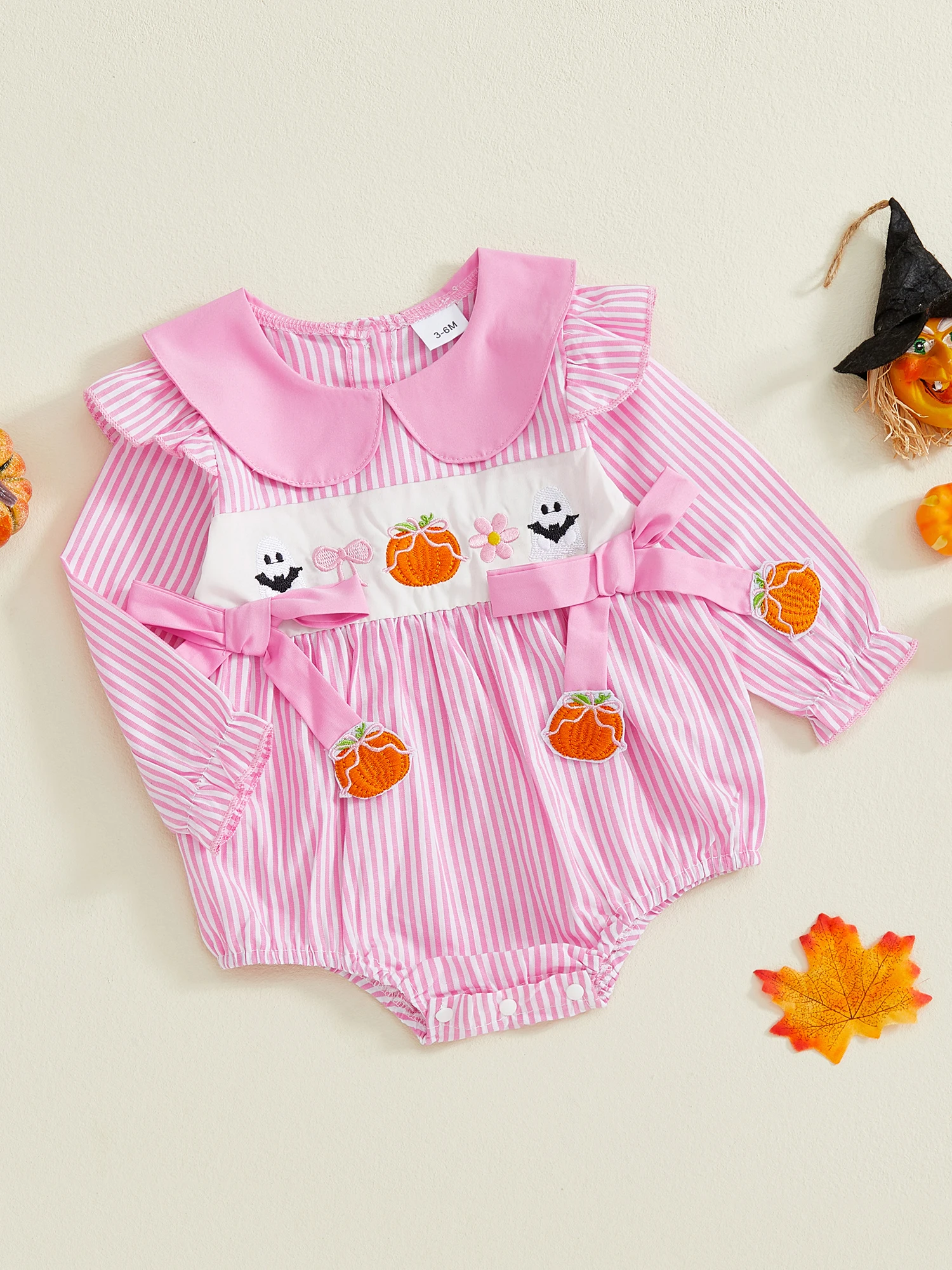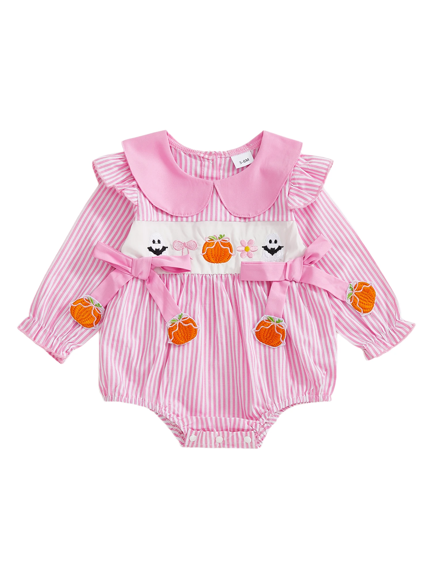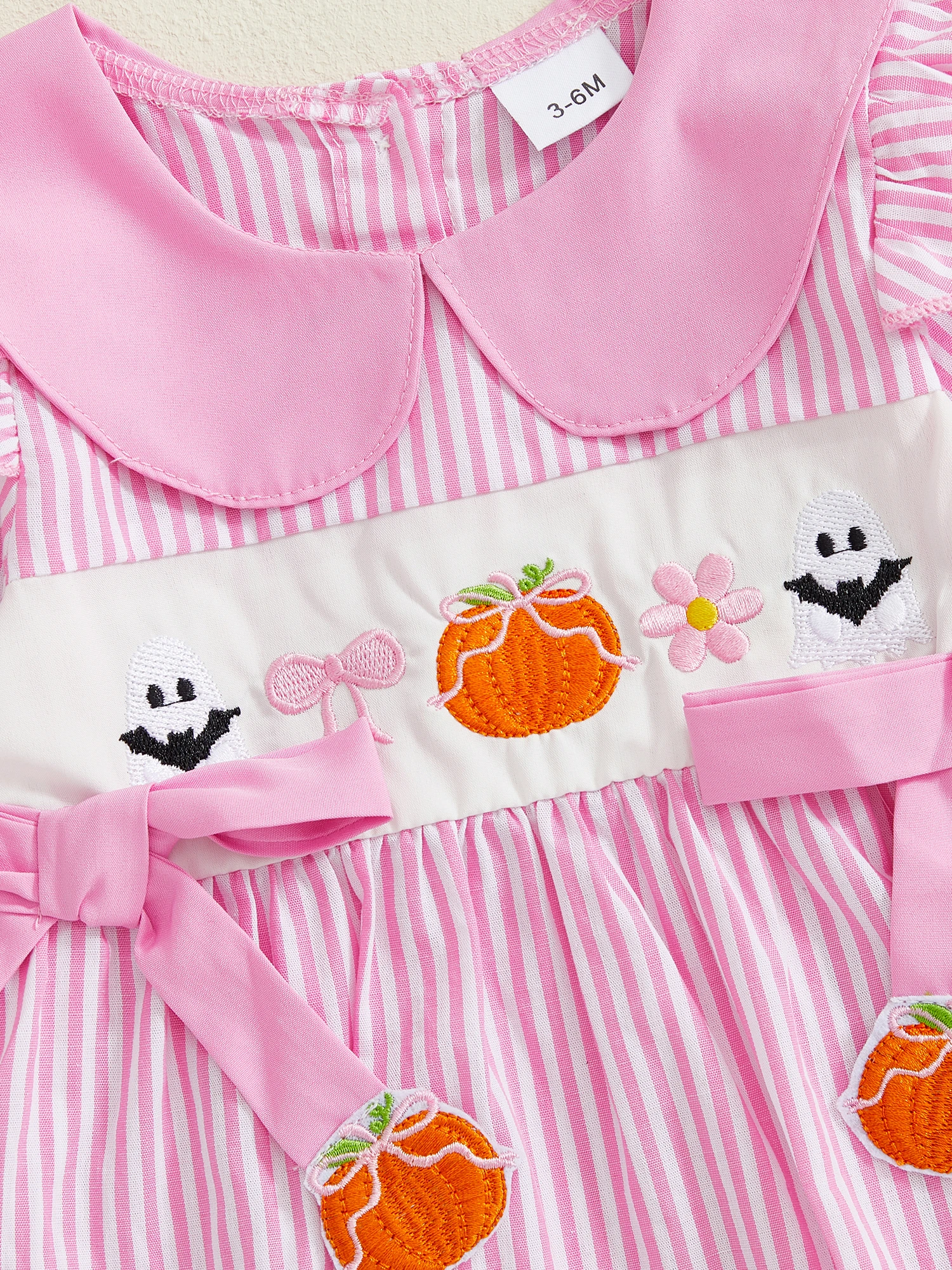 Especificación Nombre del artículo: Ropa de niña Material: 95% algodón y 5% elastano Patrón: bordado de calabaza fantasma y estampado de rayas. Cuello: cuello redondo Manga: manga larga