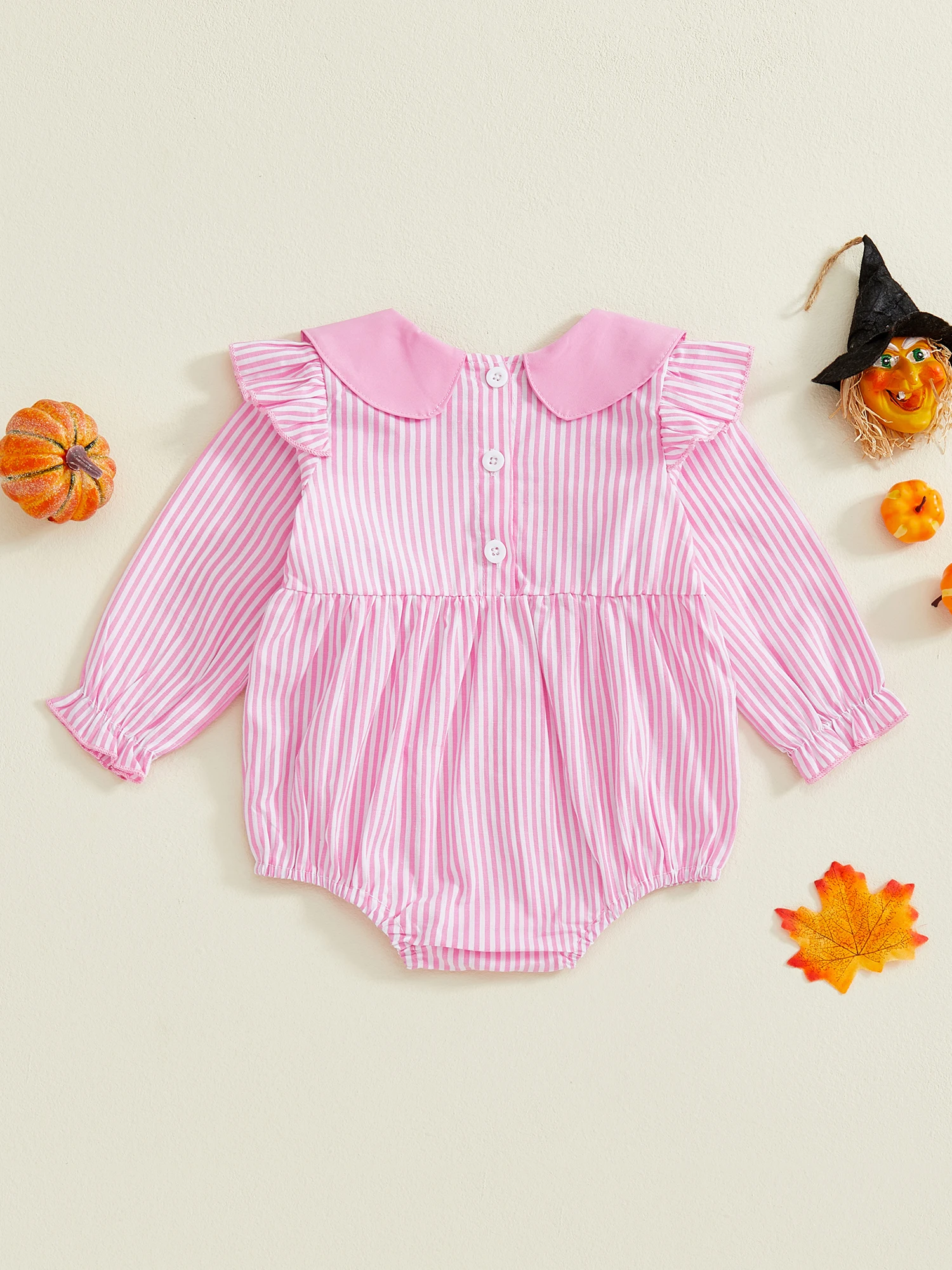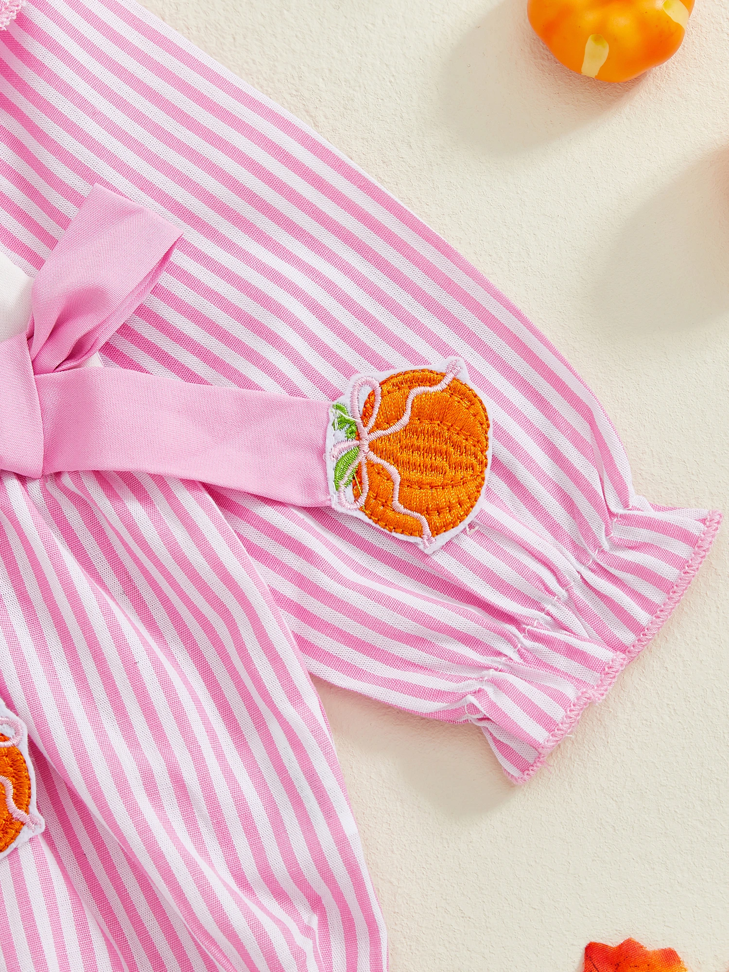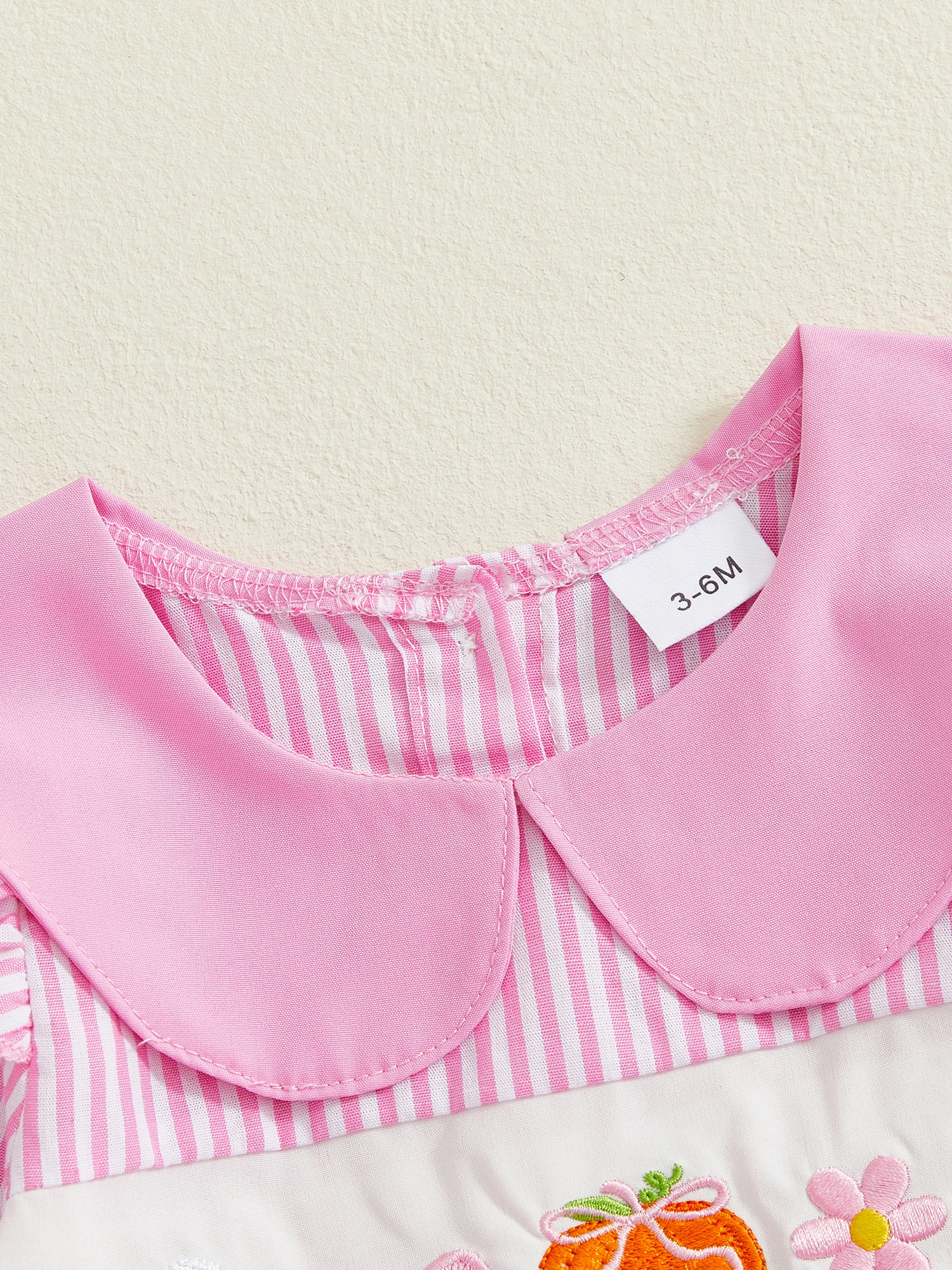 Especificación Nombre del artículo: Ropa de niña Material: 95% algodón y 5% elastano Patrón: bordado de calabaza fantasma y estampado de rayas. Cuello: cuello redondo Manga: manga larga