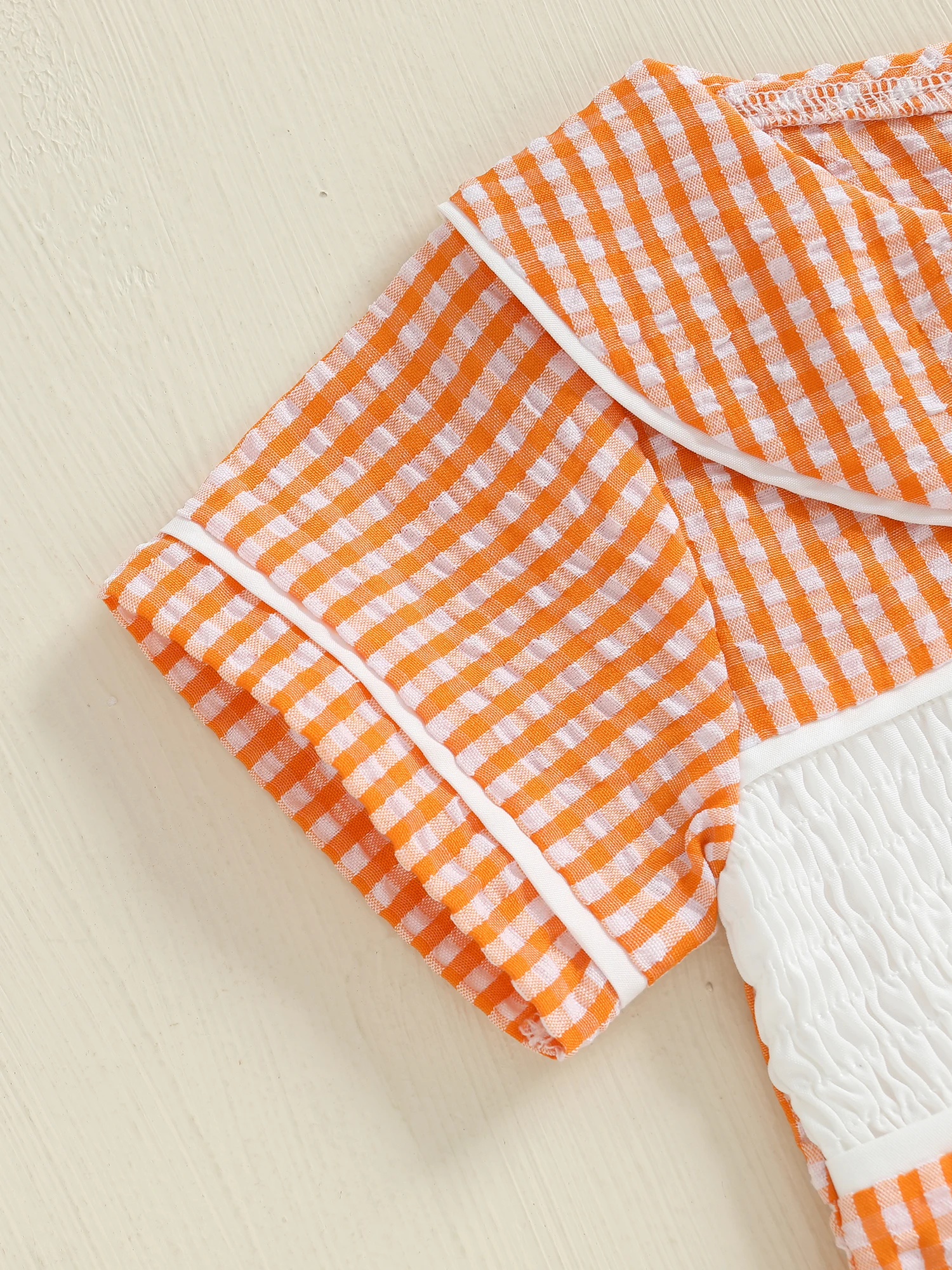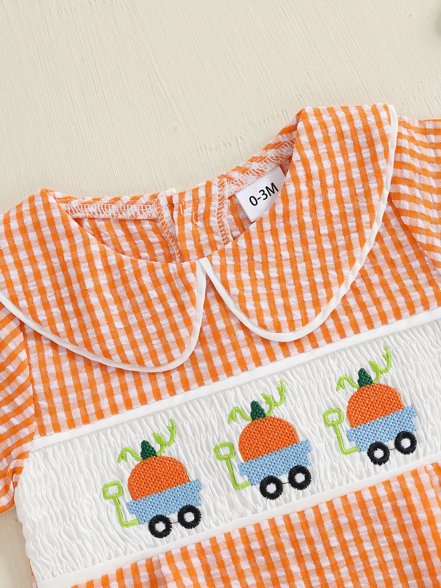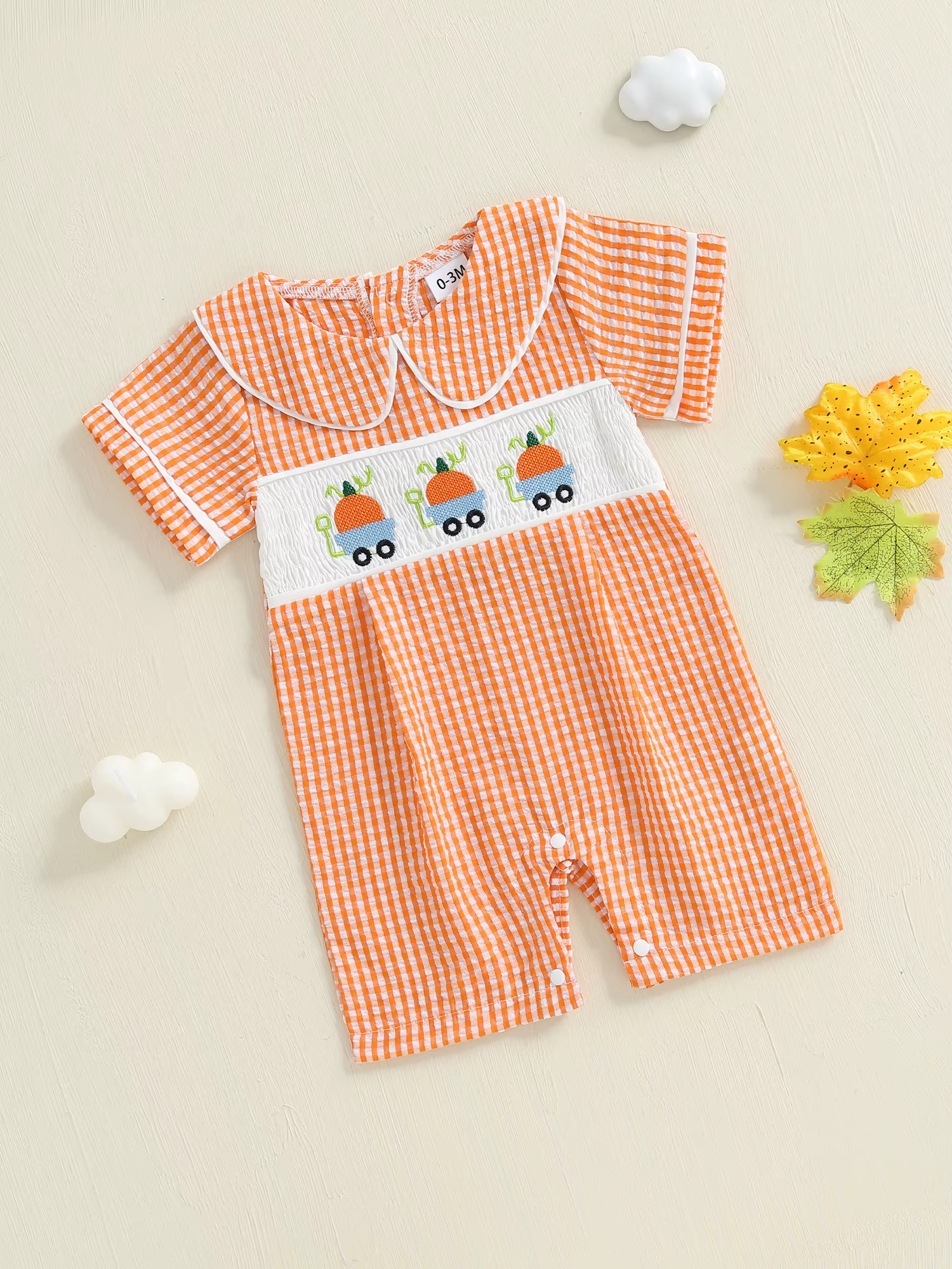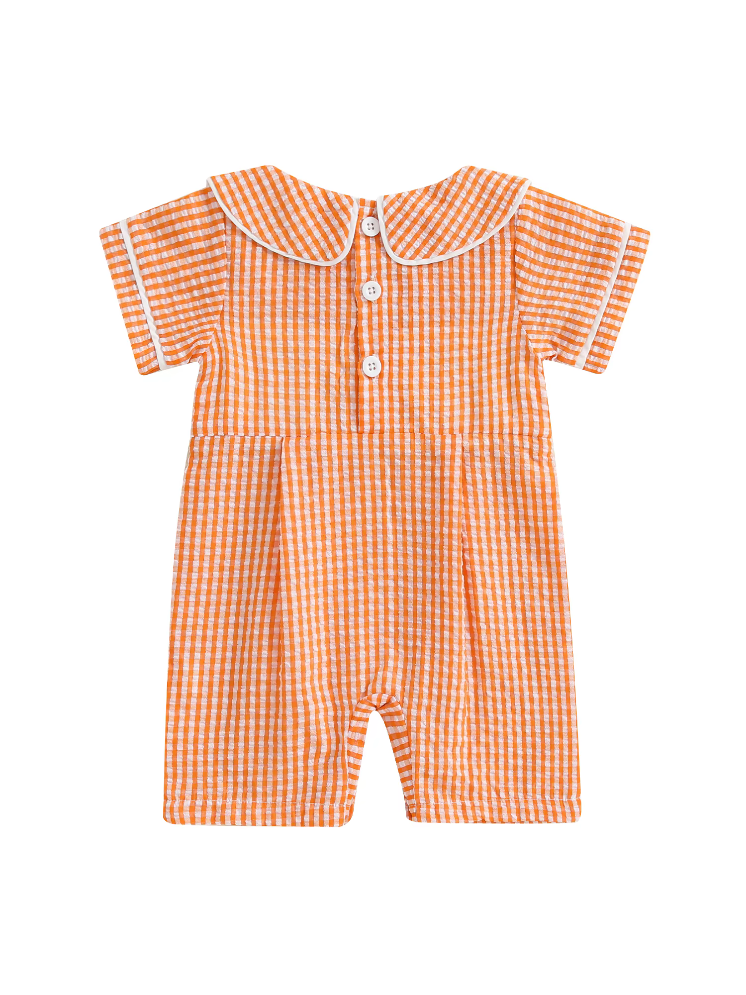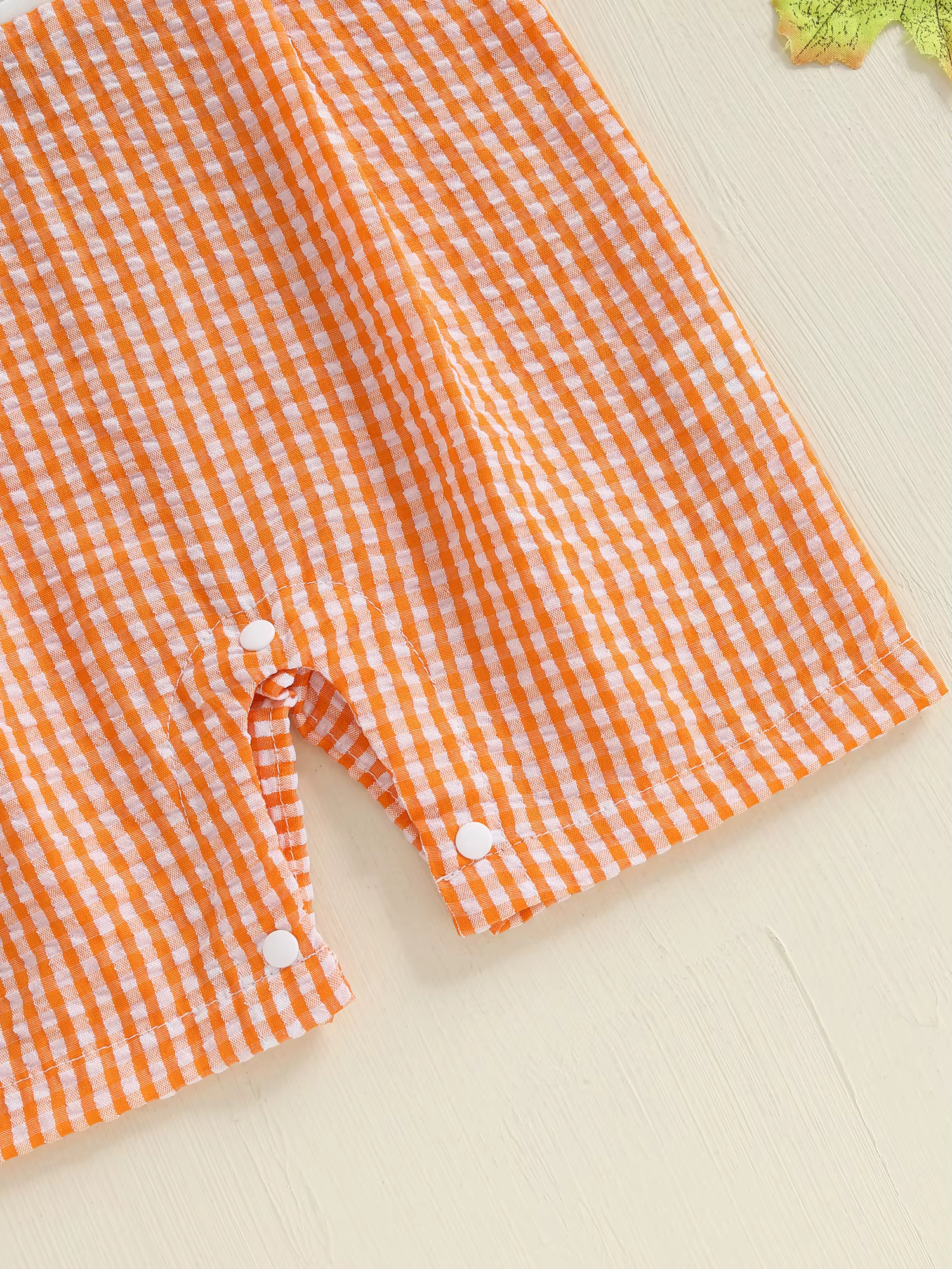 Mameluco de verano para niñas, mono informal de manga corta con cuello de muñeca a cuadros bordado de calabaza para niños pequeños, ropa linda