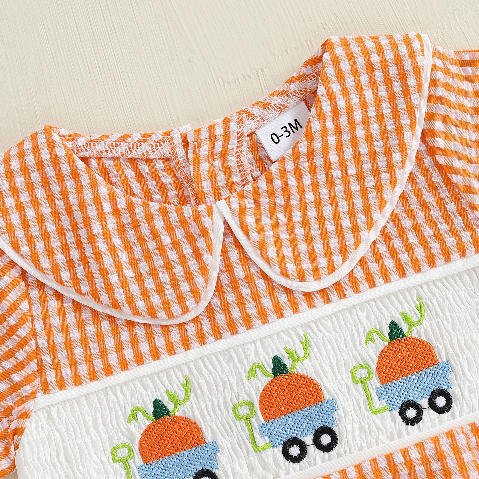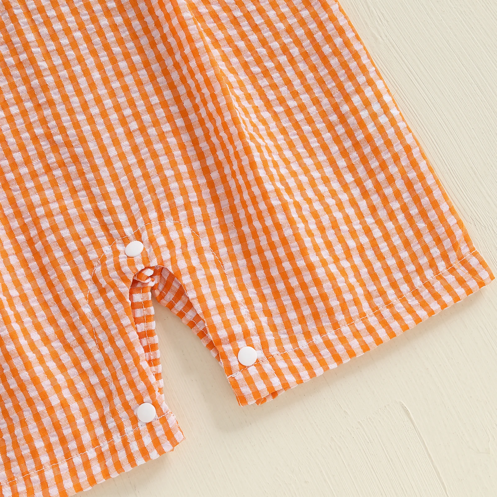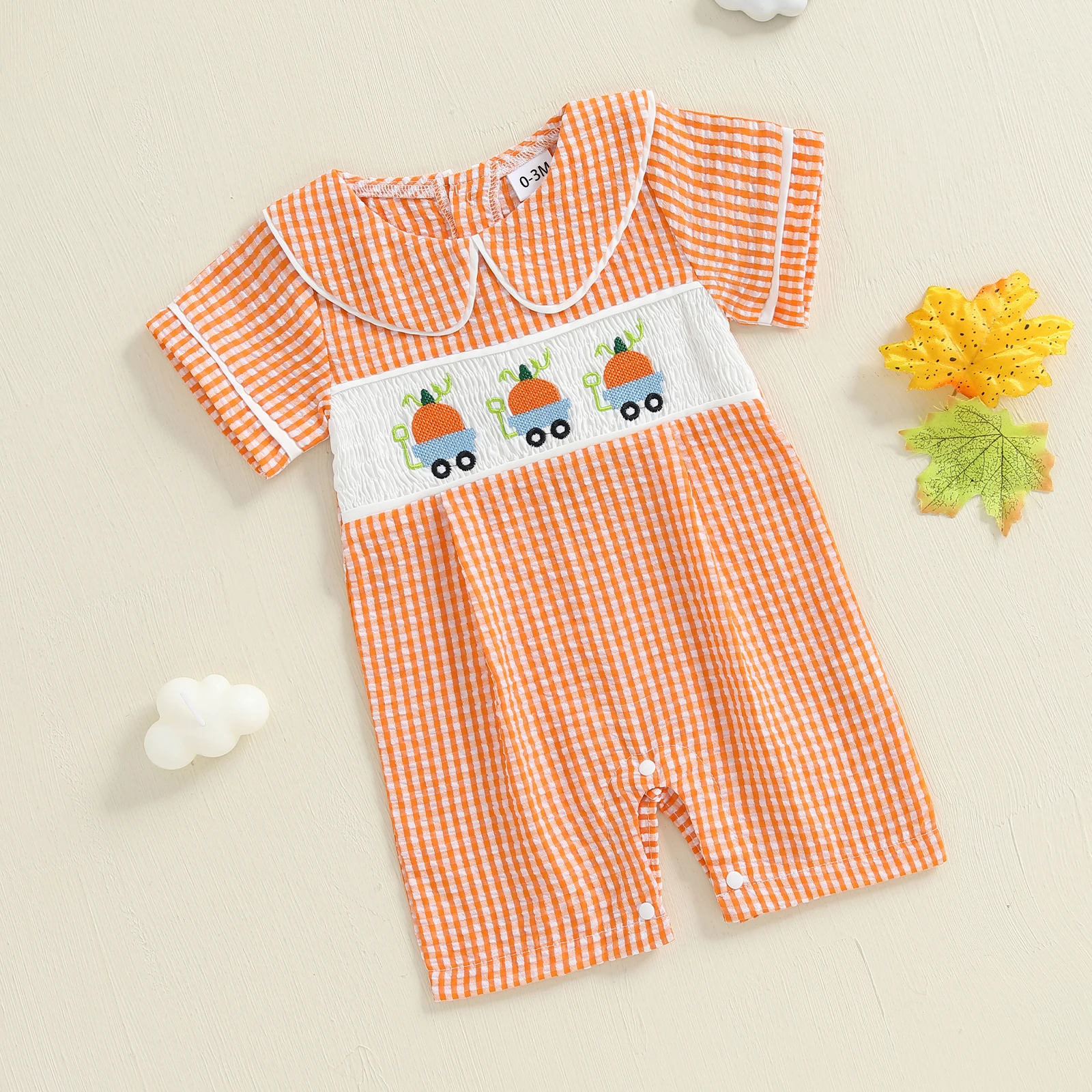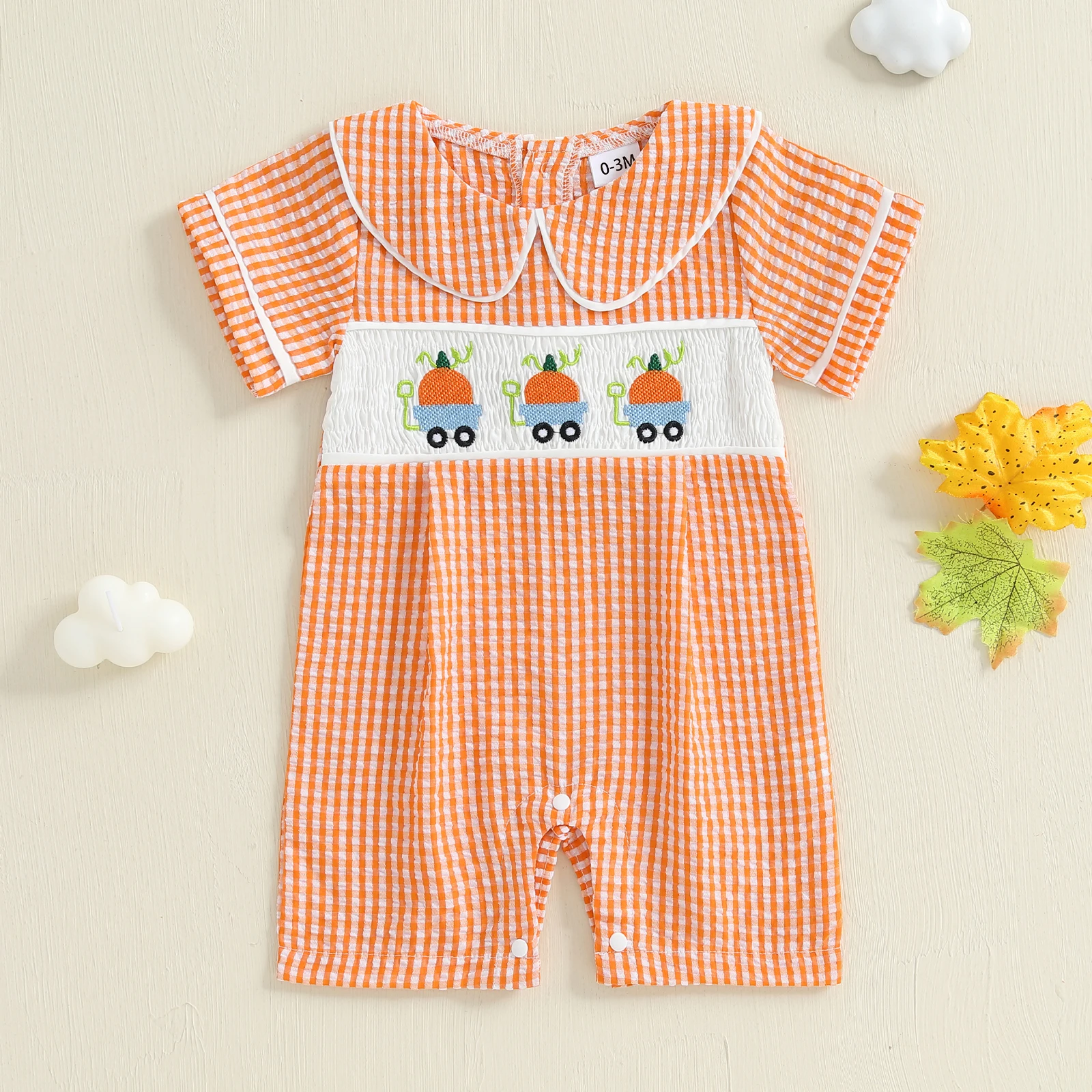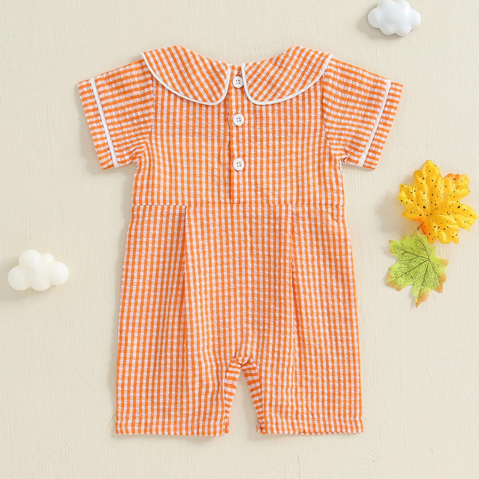 Mameluco de verano para niñas, mono informal de manga corta con cuello de muñeca a cuadros bordado de calabaza para niños pequeños, ropa linda