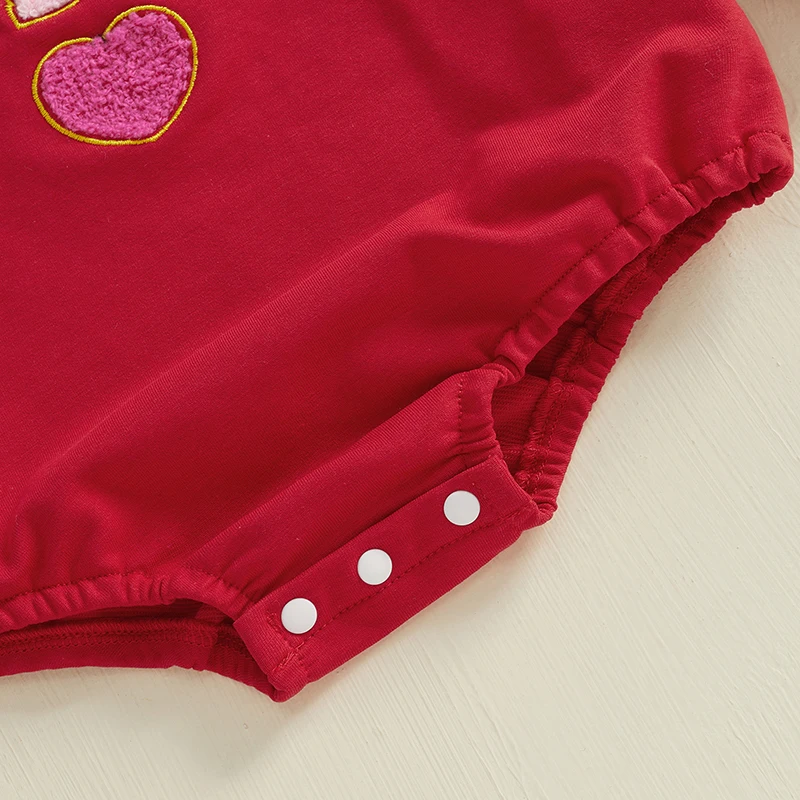 Especificaciones: Material: 95% algodón, 5% poliéster Color rojo Tamaño: 0-3 meses/3-6 meses/6-12 meses/12-18 meses Patrón: bordado de letras, bordado de corazón de amor. Género: niñas Manga: manga larga Estilo de cuello: cuello redondo