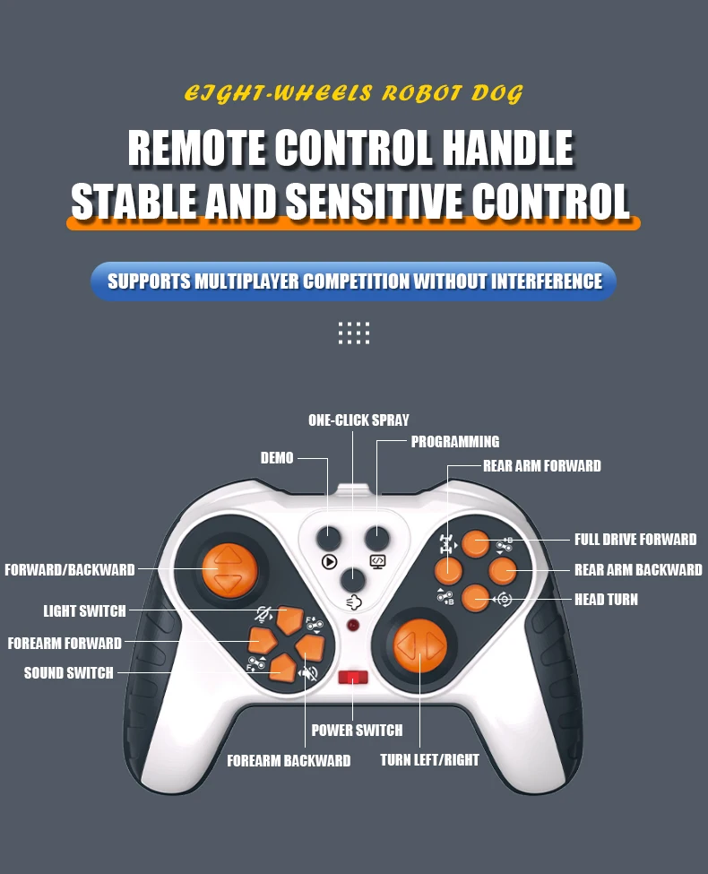 El producto adopta el funcionamiento de control remoto 2.4G y no está sujeto a interferencias.Para adelante y hacia atrás, el modo de programación, el interruptor de sonido, el antebrazo y la rueda del brazo trasero se pueden subir, bajar y girar, la rotación de la cabeza hacia la izquierda y hacia la derecha se puede operar, la función táctil del lado izquierdo de la cabeza, la función de pulverización, la función de demostración automática.