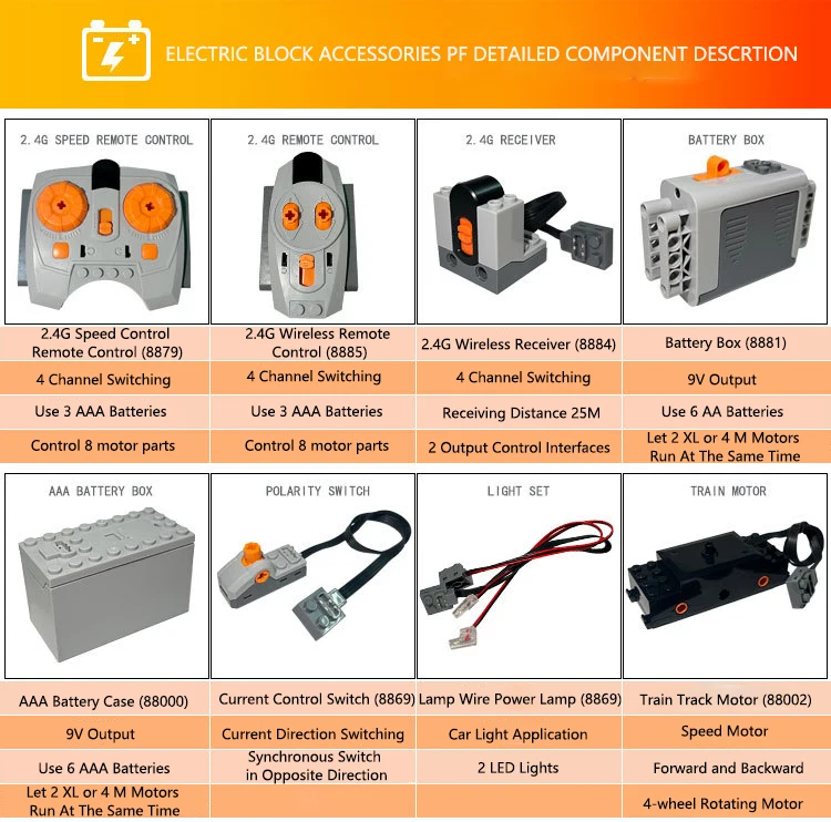 Motor 88004,L-Motor 88003, Luz 8870,Interruptor 8869,IR TX 8885,Velocidad IR