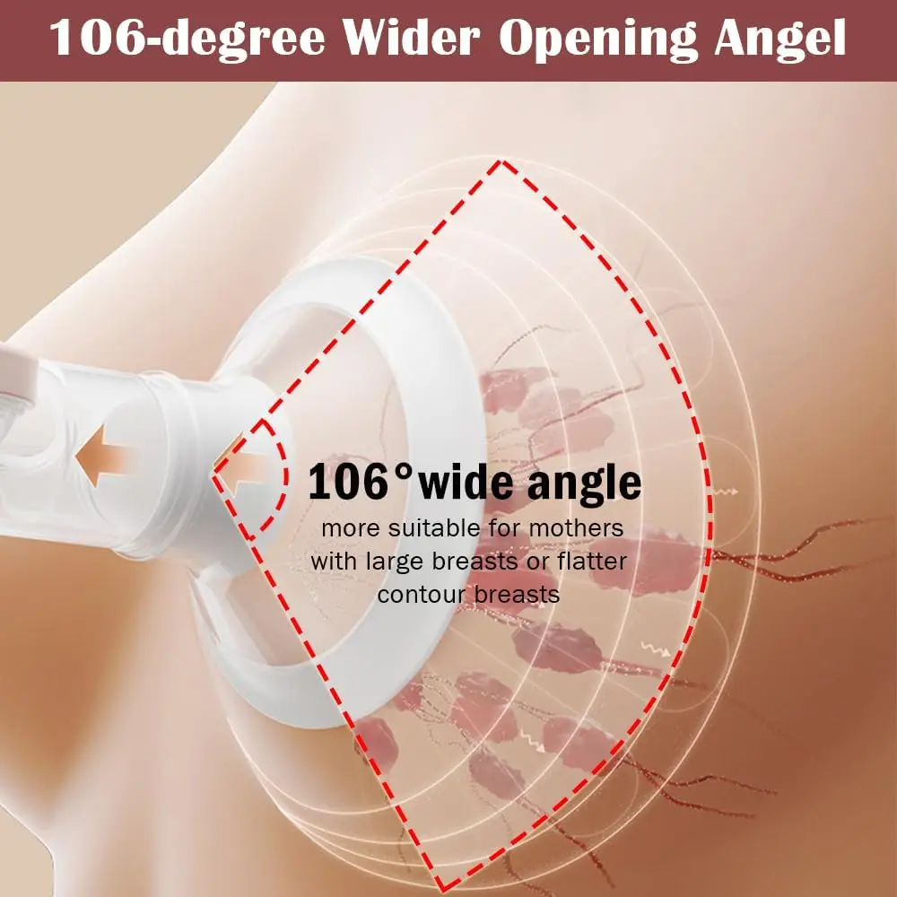 【Ángel de apertura más amplia de 106 grados】: Diseño de forma ovalada con apertura gran angular de 106 grados, más adecuado para madres con senos grandes o senos contornos más planos.Tamaño de copa más grande para un área más cubierta de los senos durante el extracción; Diseño de forma ovalada para girar y adaptarse para un bombeo cómodo