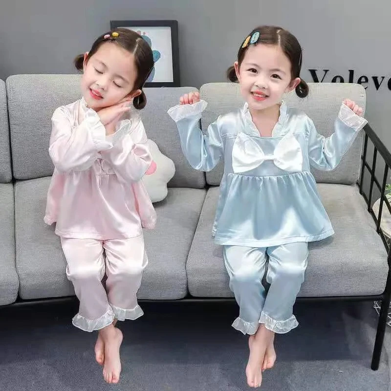 Comprar Pijamas con decoración de lazo de estilo bonito y dulce, conjunto de pijamas de seda helada para niña, ropa de casa para primavera y otoño, pantalones de manga larga para el hogar