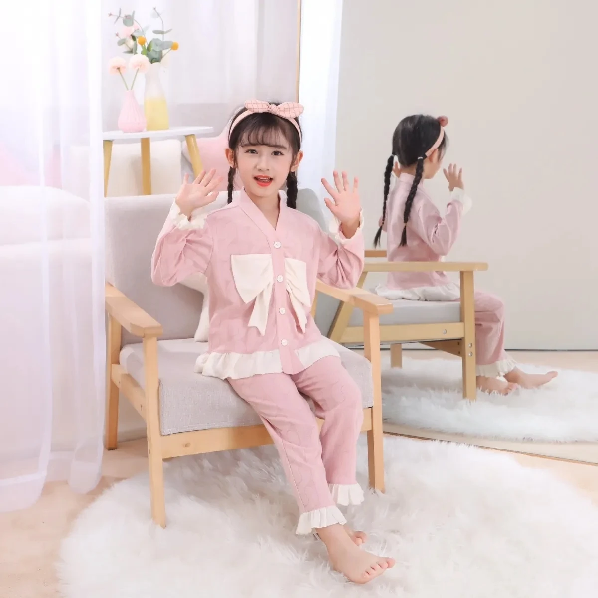 Comprar Pijamas medianos y grandes para niños, ropa de casa para niñas, manga larga de pijama de un solo pecho, pantalones, traje de dos piezas, primavera y otoño