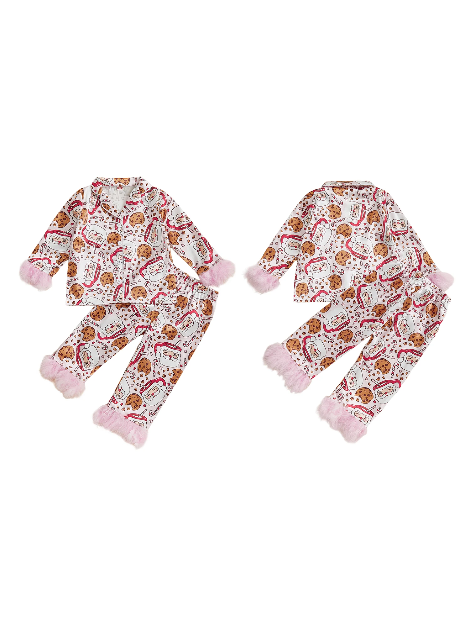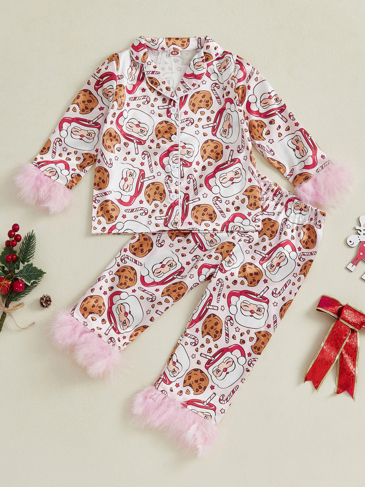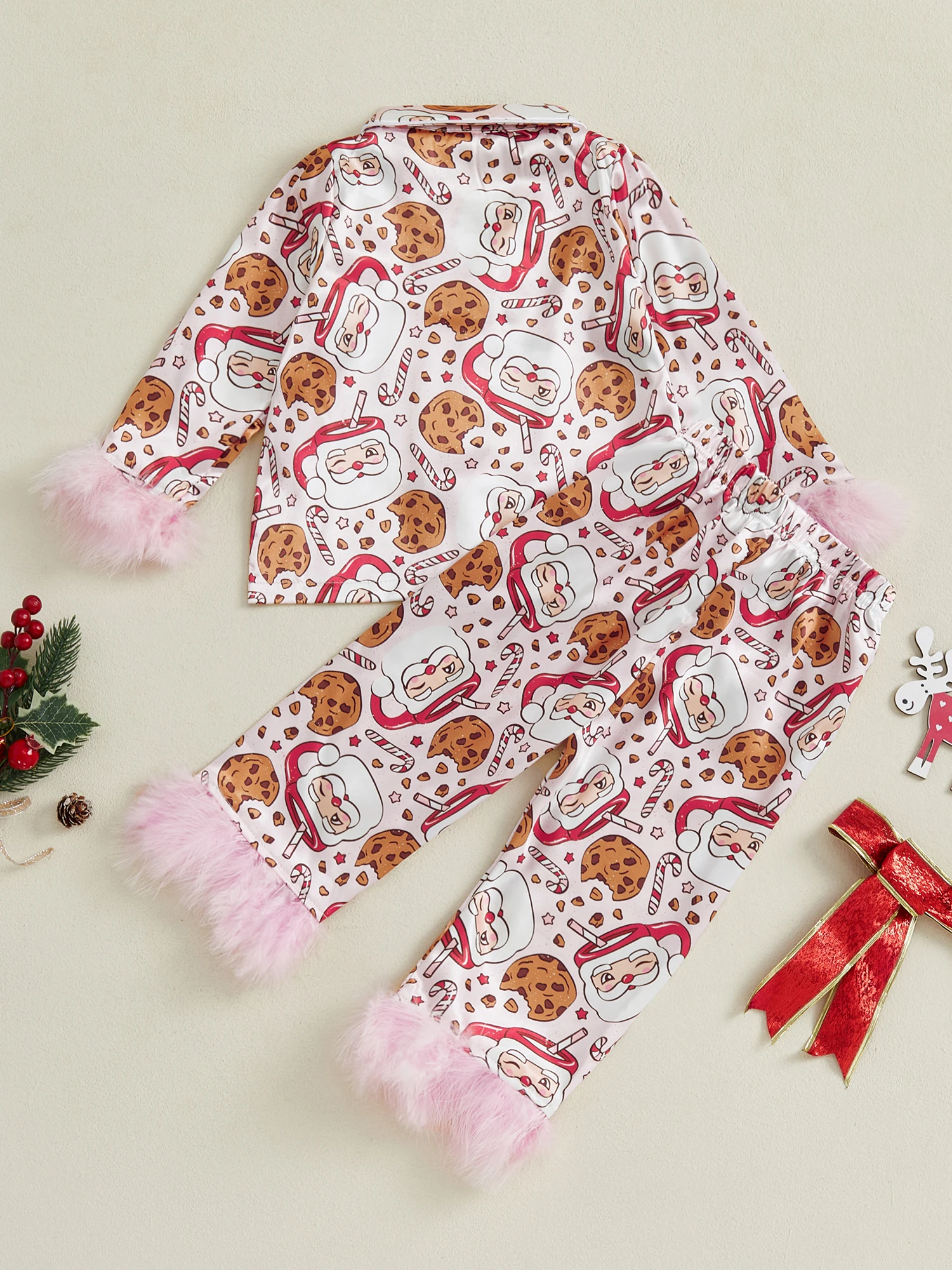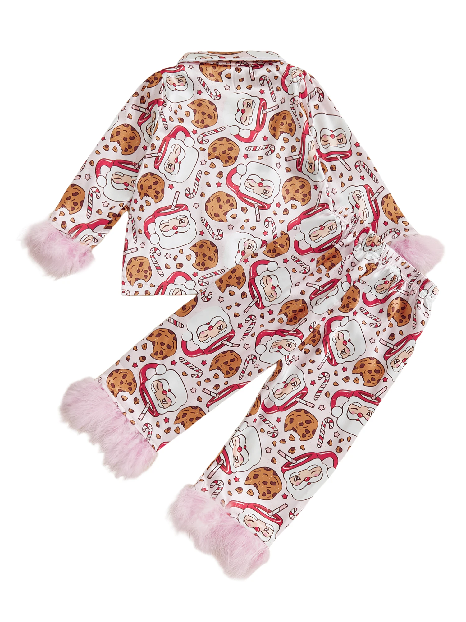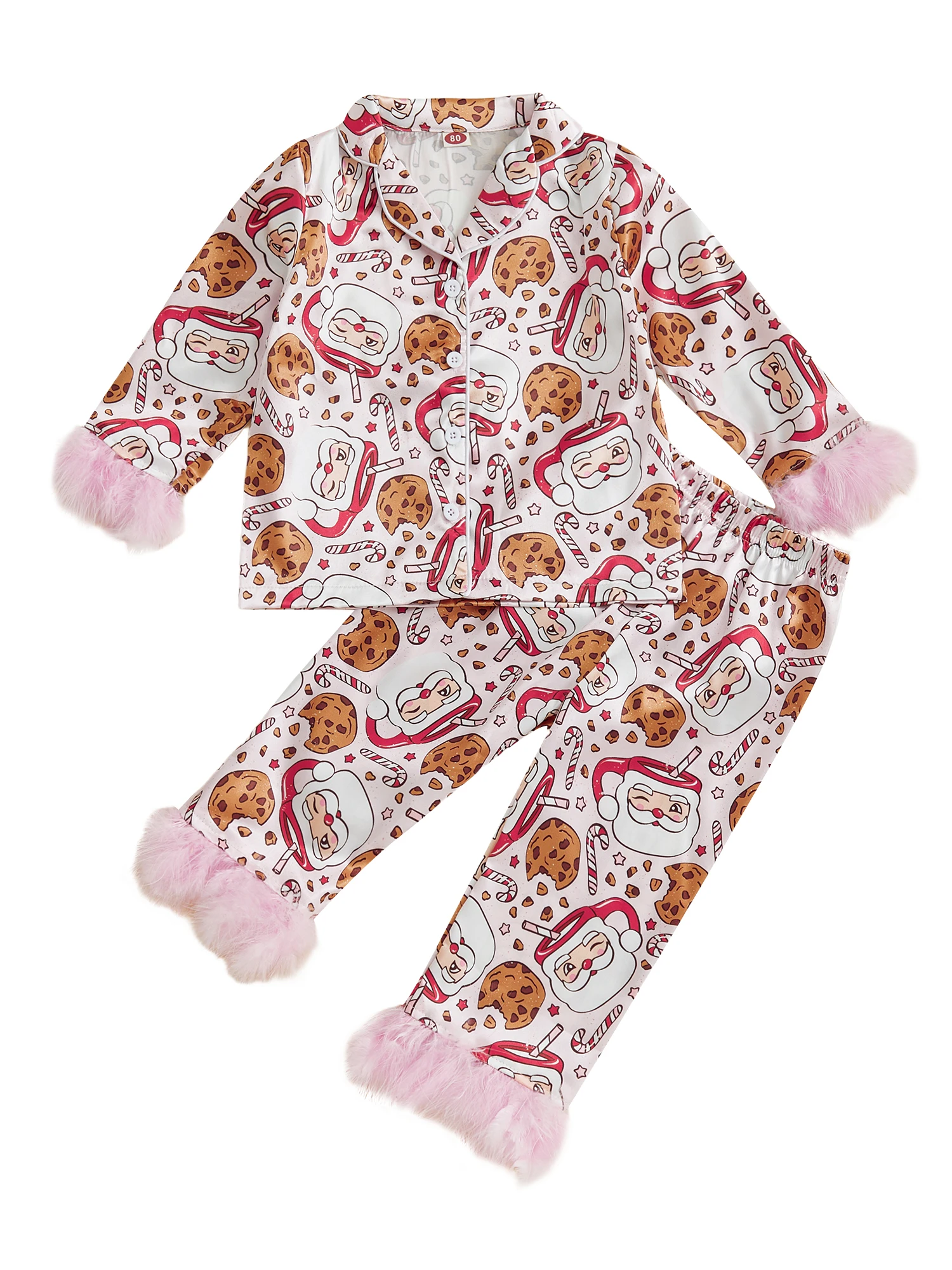 Comprar Pijamas navideños para niña, puños de plumas, taza de Papá Noel y estampado de galletas, Tops de manga larga con solapa y pantalones, conjunto de ropa de dormir para niño pequeño