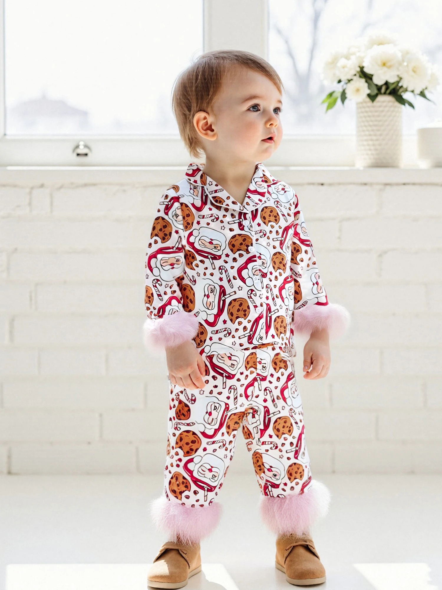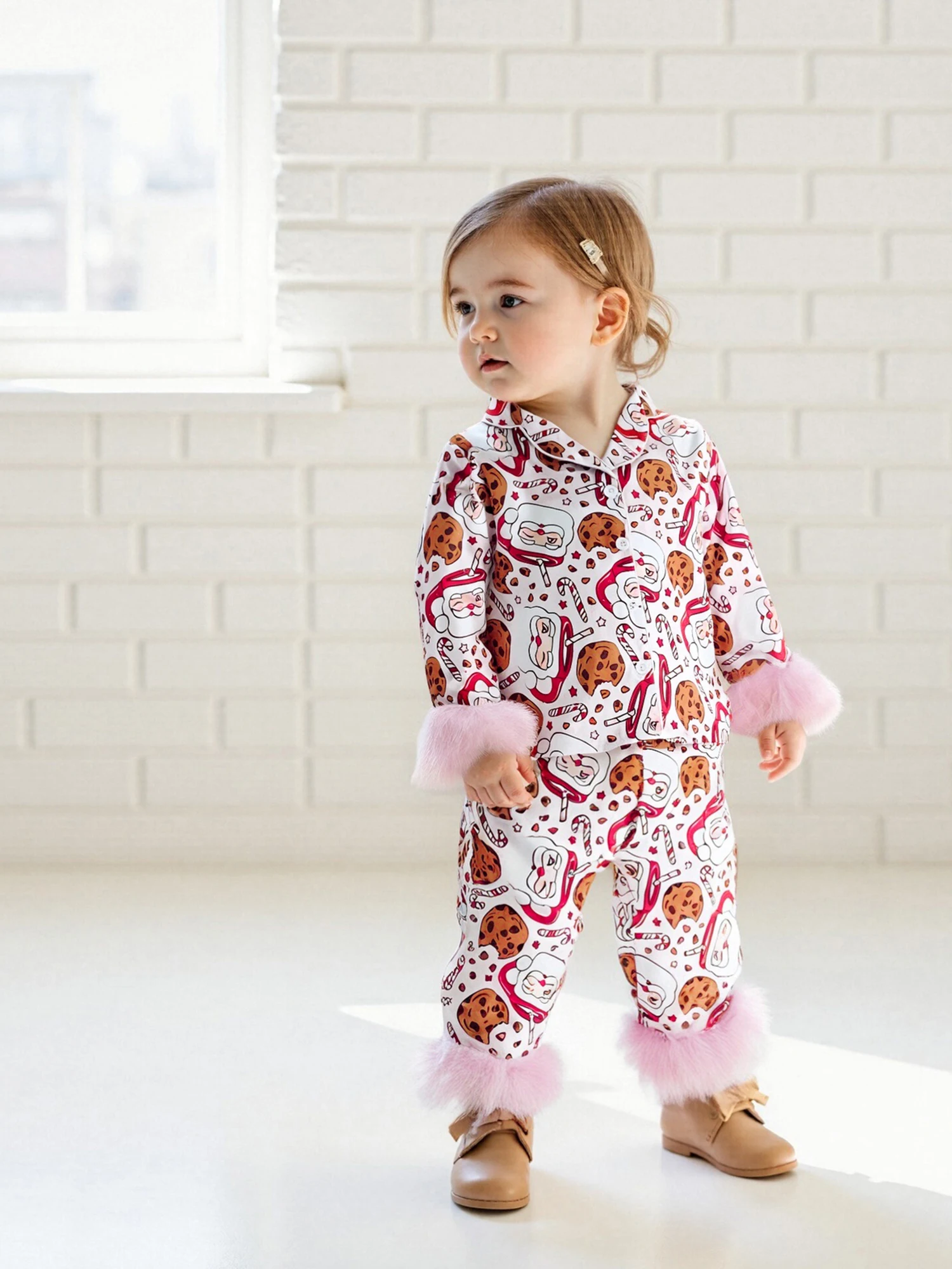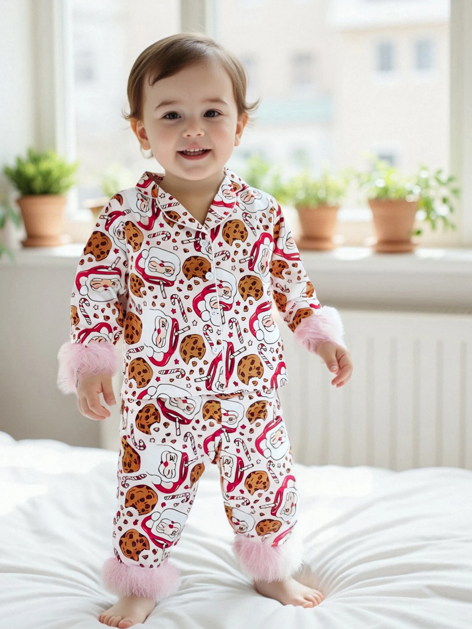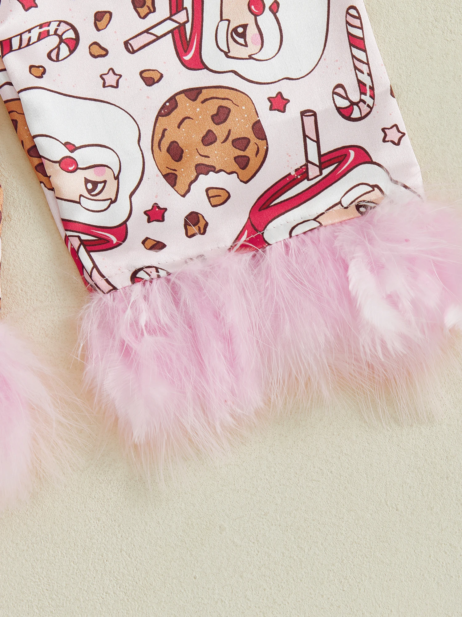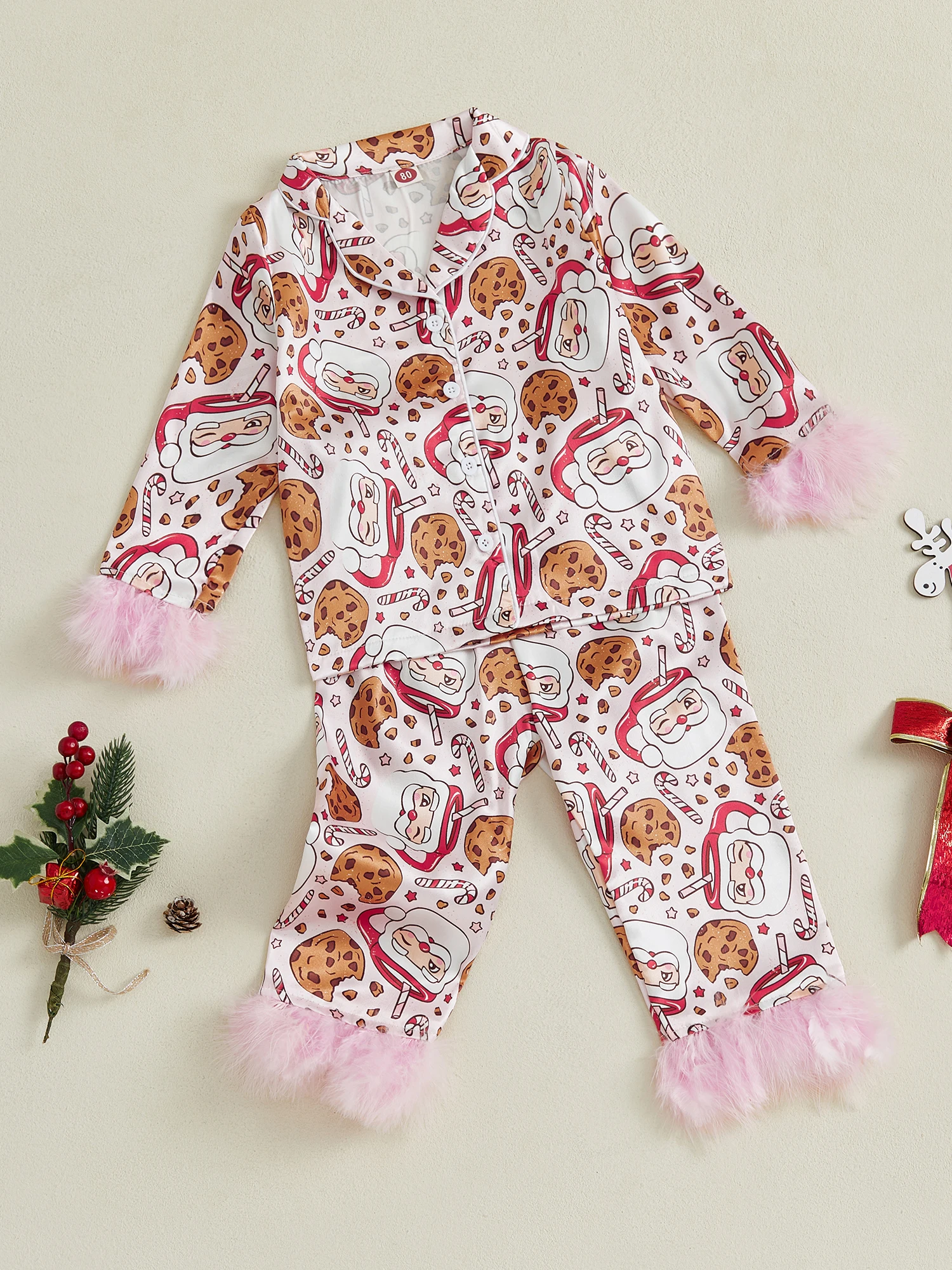 Comprar Pijamas navideños para niña, puños de plumas, taza de Papá Noel y estampado de galletas, Tops de manga larga con solapa y pantalones, conjunto de ropa de dormir para niño pequeño