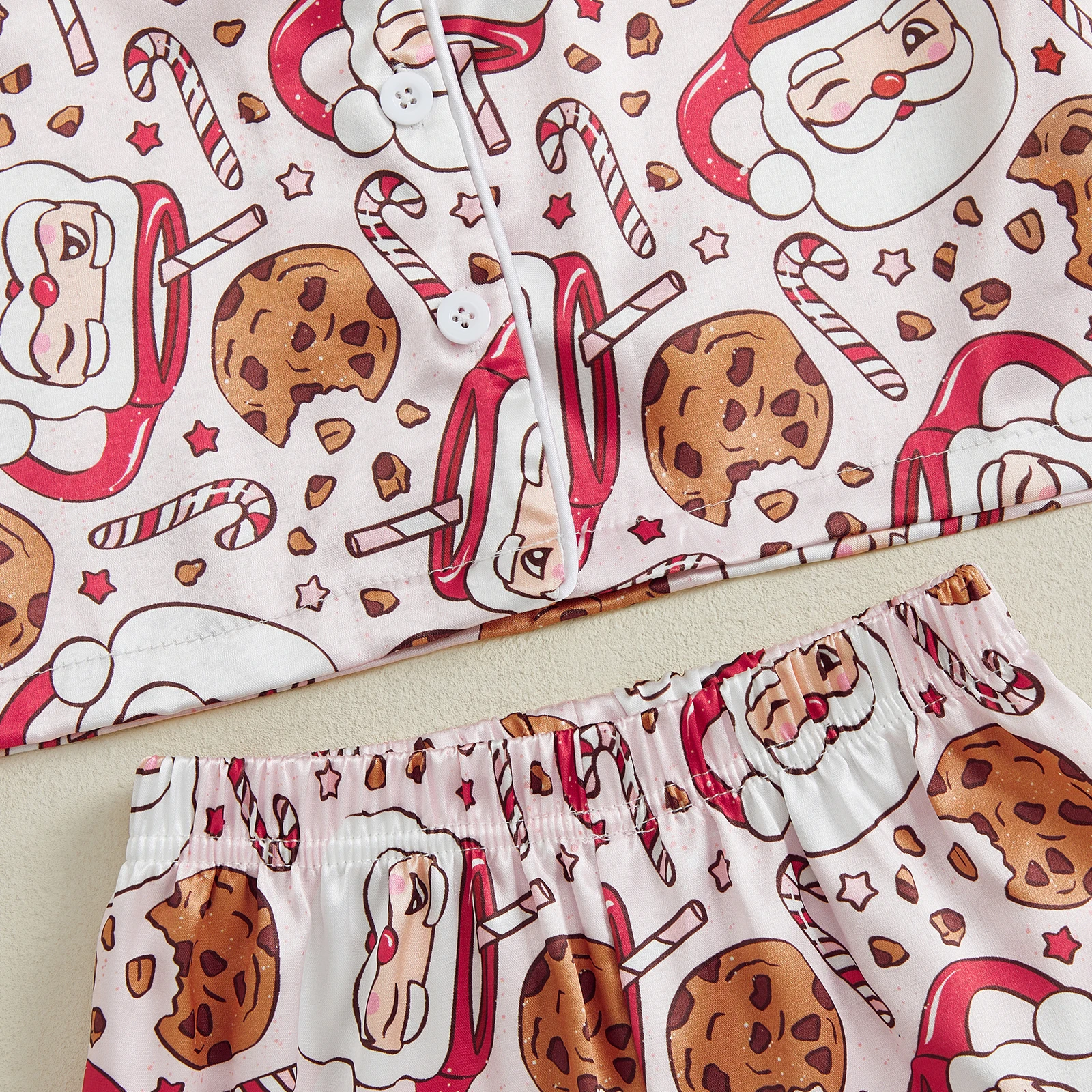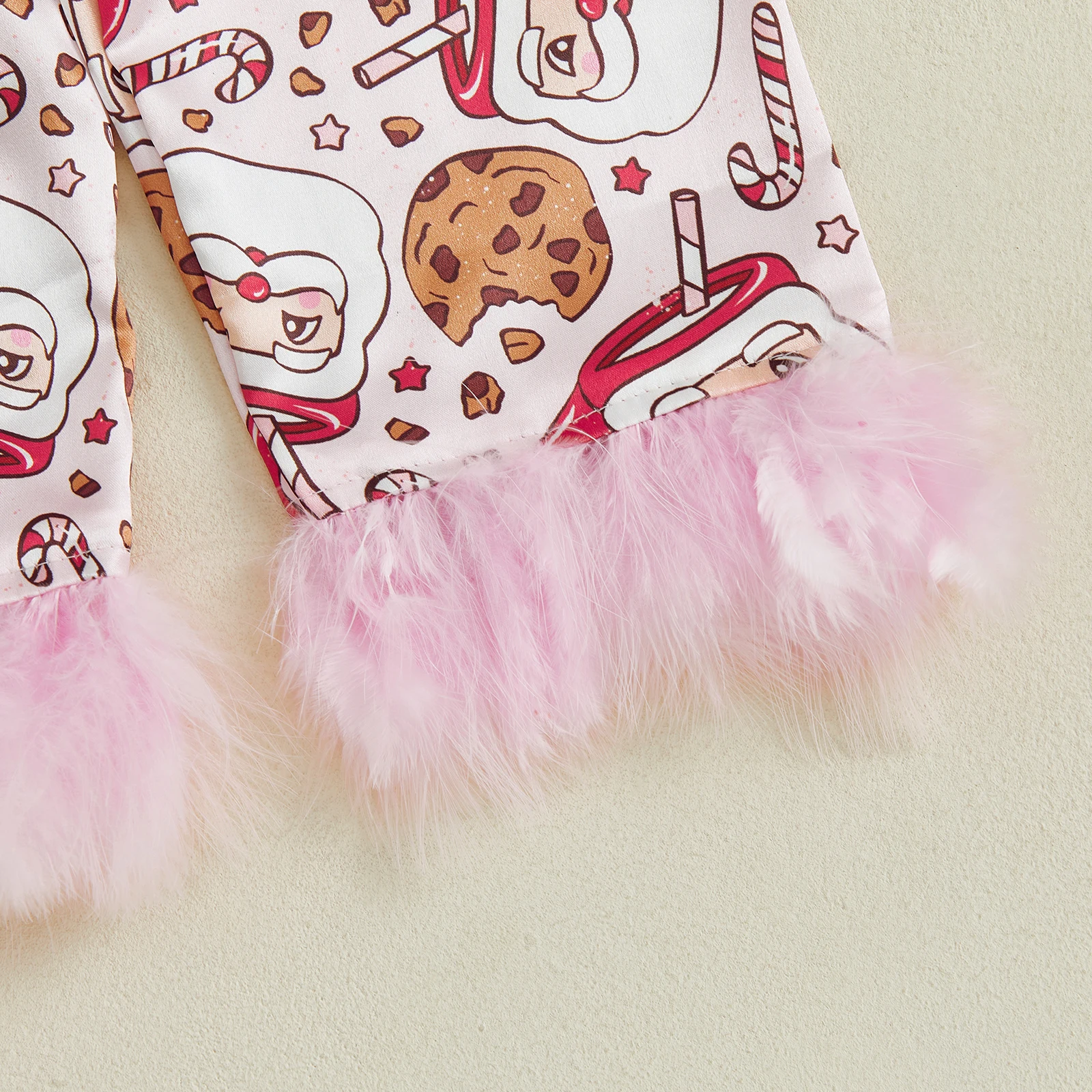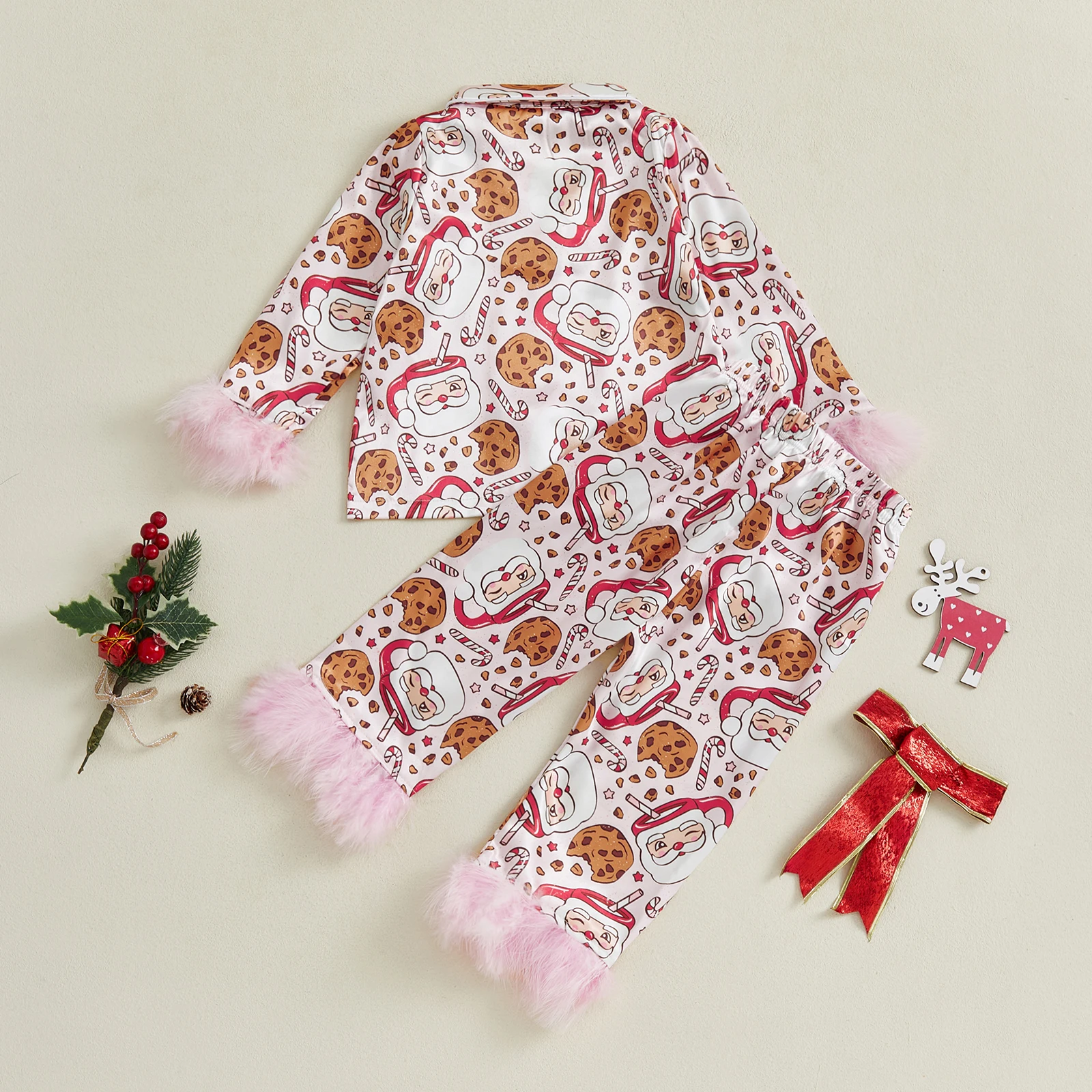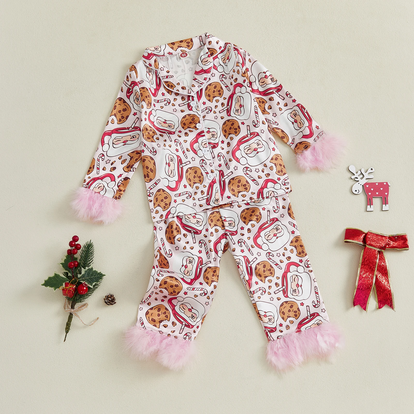 Comprar Pijamas navideños para niña, puños de plumas, taza de Papá Noel y estampado de galletas, Tops de manga larga con solapa y pantalones, conjunto de ropa de dormir para niño pequeño