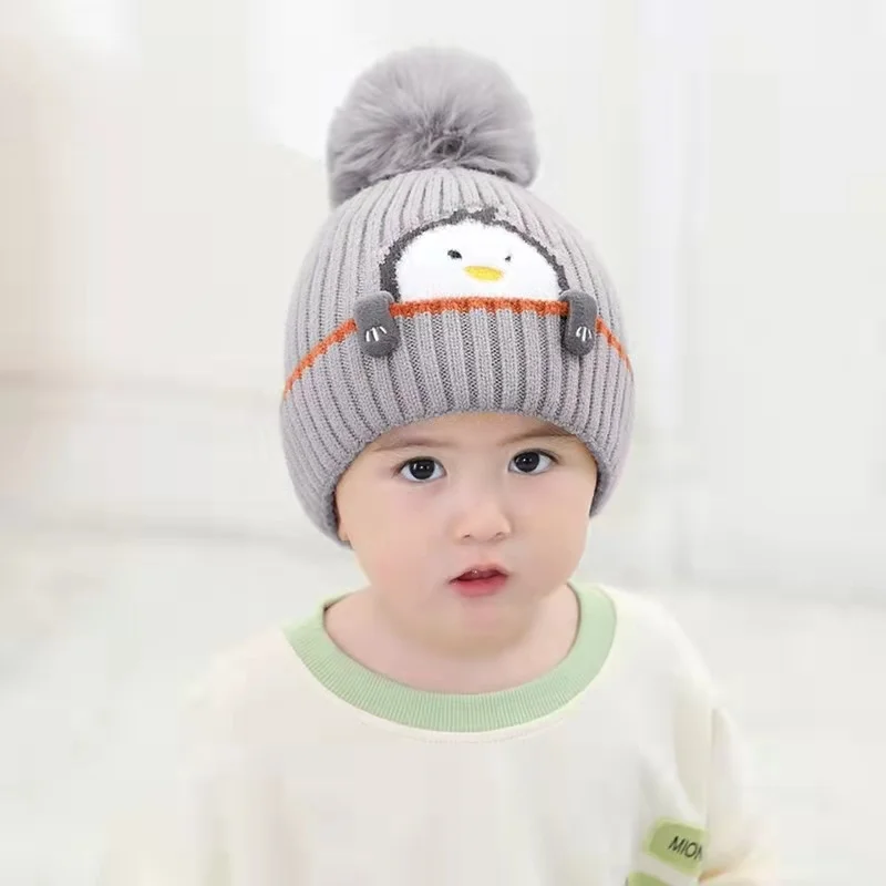 Pingüino, gorro de Jacquard tejido acrílico Unisex, bufanda para bebé con pompón de piel para niños, conjunto de gorro de viaje para invierno cálido