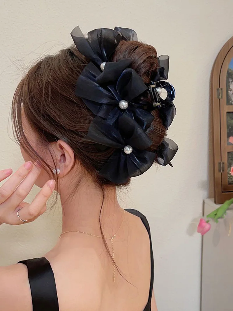 Comprar Pinza para el pelo con lazo y perlas para mujer, accesorios para el cabello a la moda, Clip de tiburón de gran tamaño, pinzas para el pelo de cangrejo de malla, regalos para tocado para niña 2024