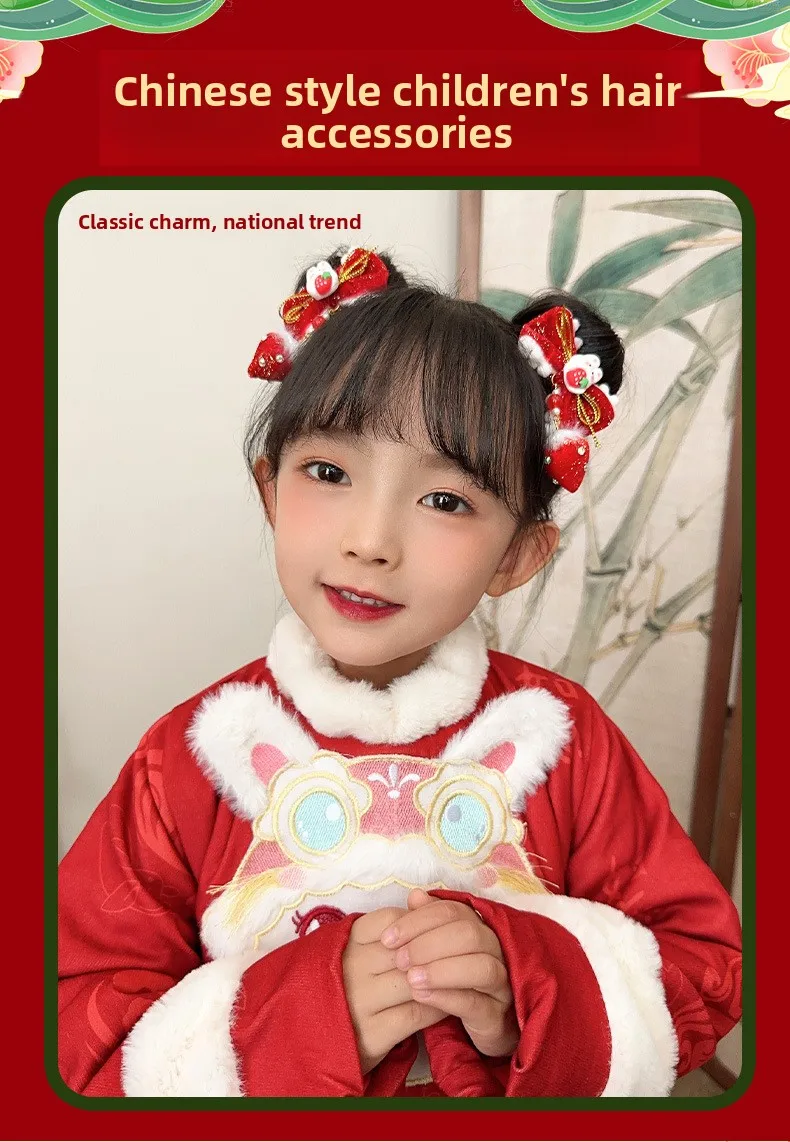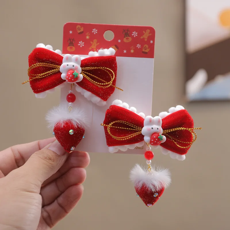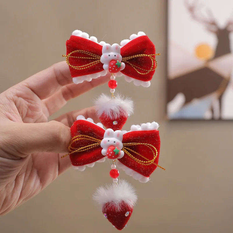 Pinzas para el cabello de Año Nuevo de estilo chino para niños: diseño de conejo de fresa roja, lindo festivo, perfecto para trajes Hanfu.