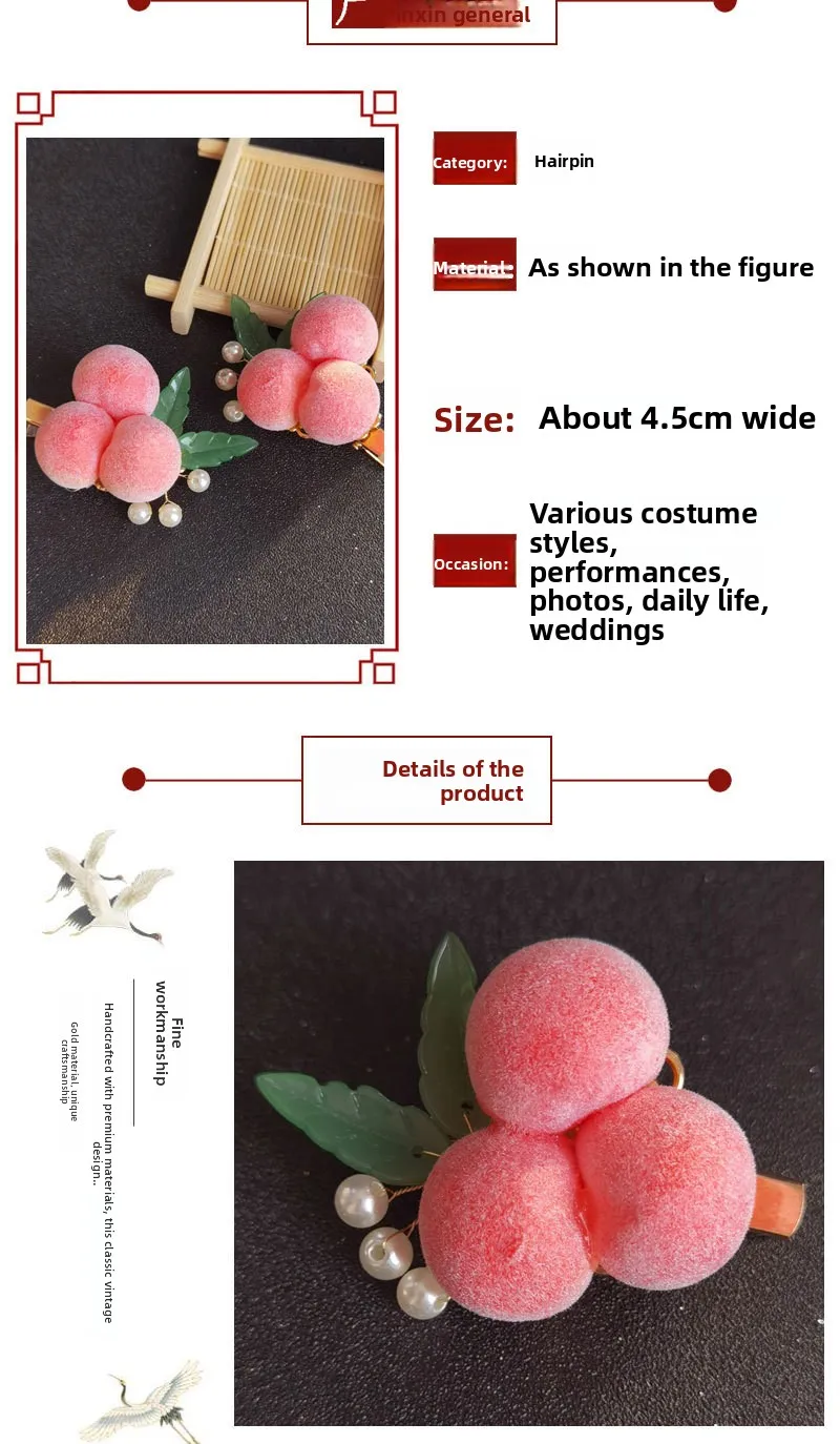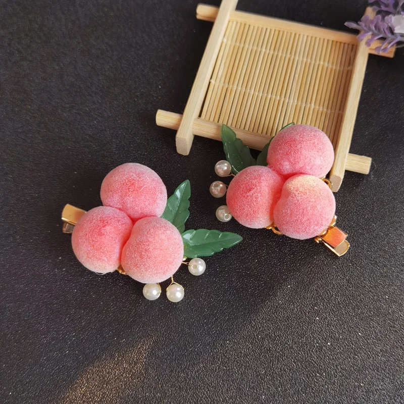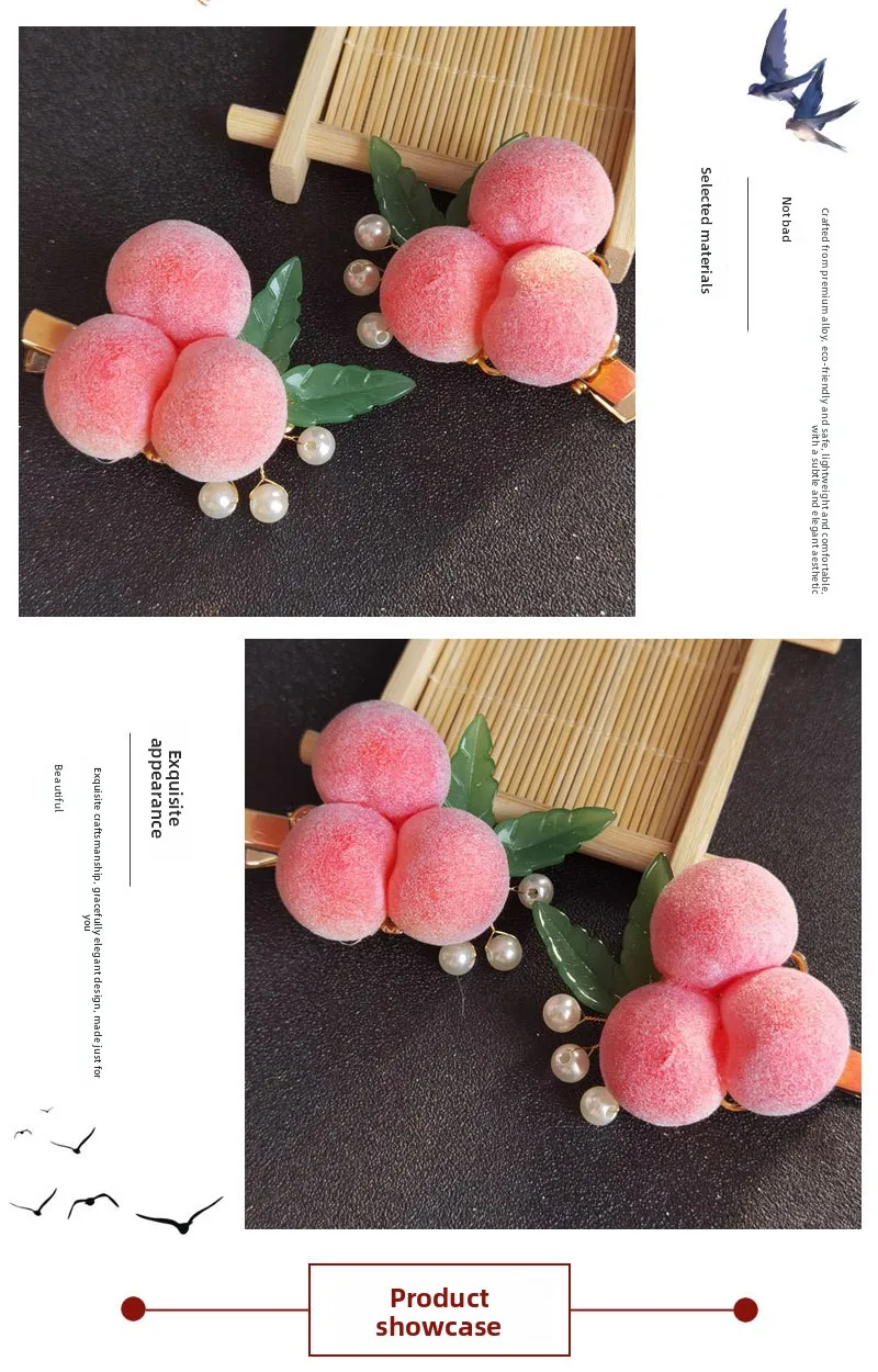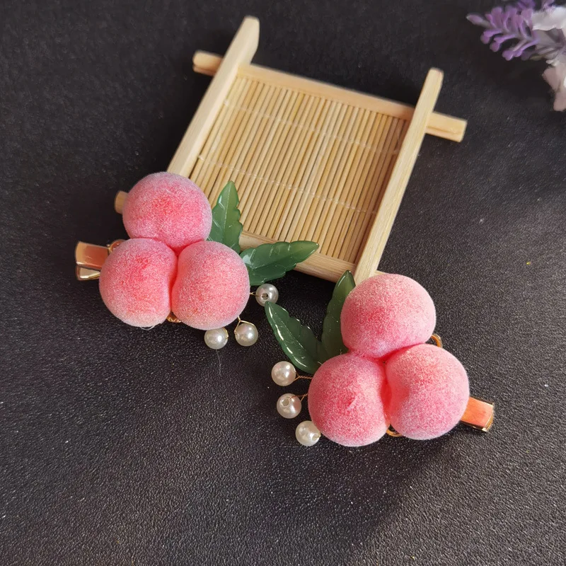 ¡Pinzas para el cabello de melocotón Hanfu chino para niños! Suave terciopelo melocotón y hojas verdes, perfecto para disfraces antiguos, lindos accesorios elegantes.