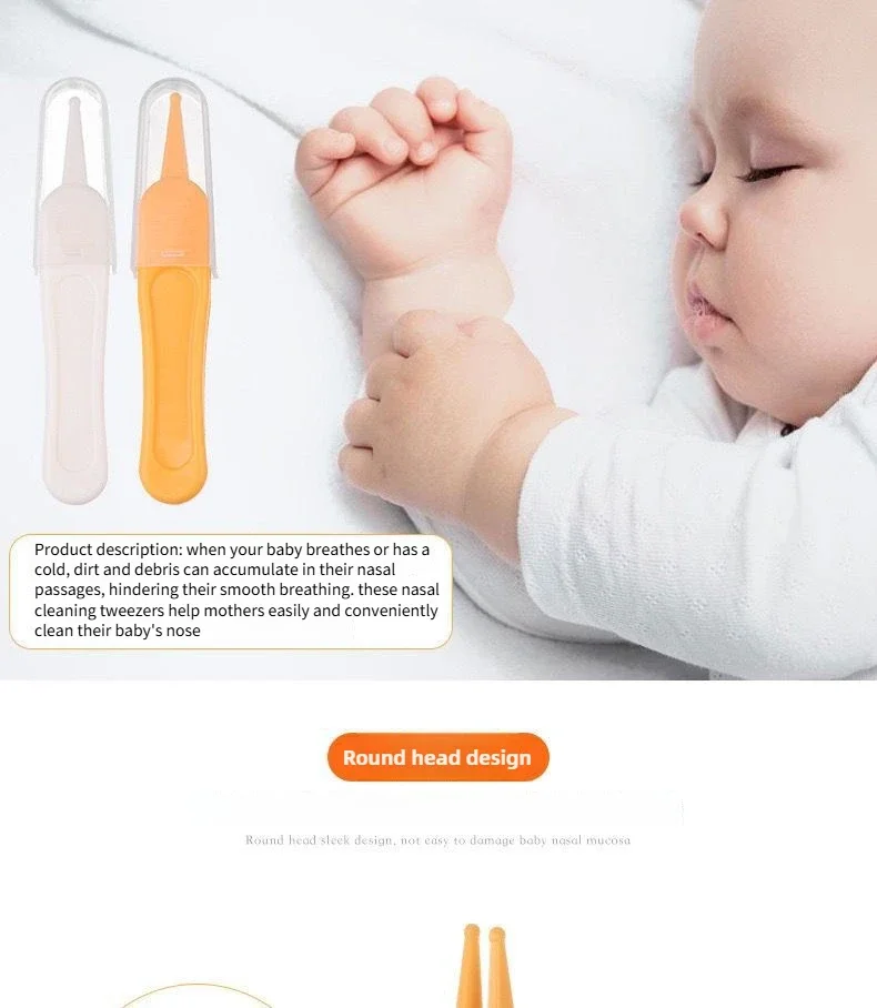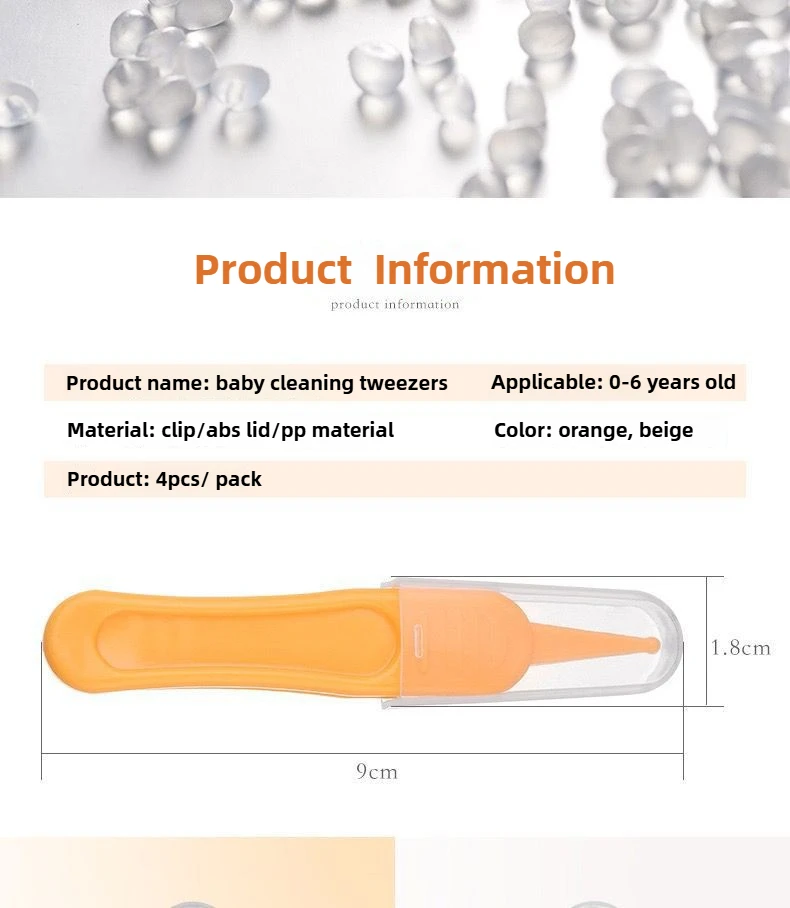 Nombre del producto: Pinzas de limpieza para bebés (limpieza eAR, fosa nasal, pinza para suciedad en el ombligo) Material del producto: pinzas de limpieza.Plástico ABS Color del producto: blanco, naranja, azul, amarillo. Tamaño del producto: 91,6X19X13,5 (mm)