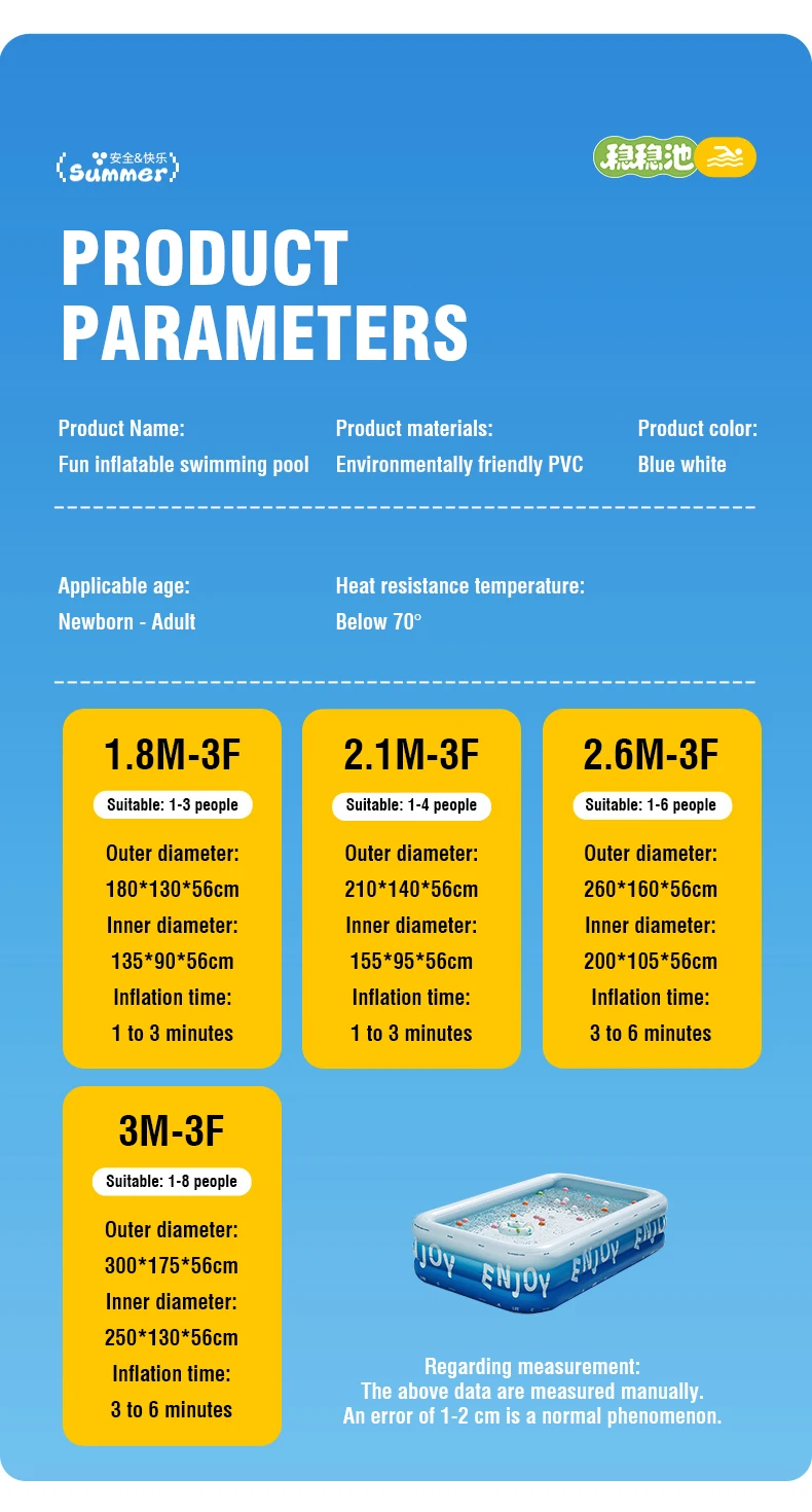 1.Resistente: fabricada con PVC seleccionado, esta piscina inflable incorpora un grosor reforzado para ofrecer una base de calidad diseñada para una resistencia constante.
