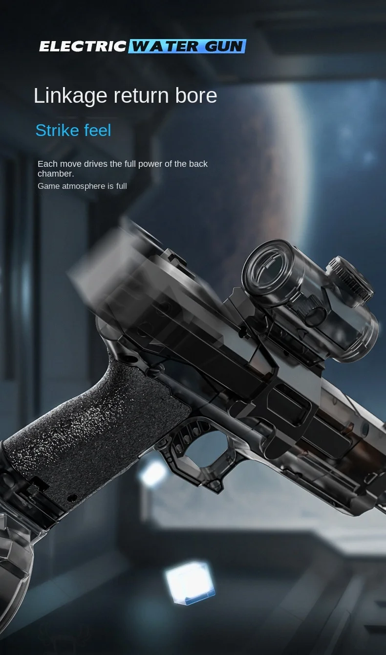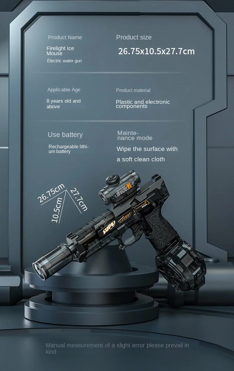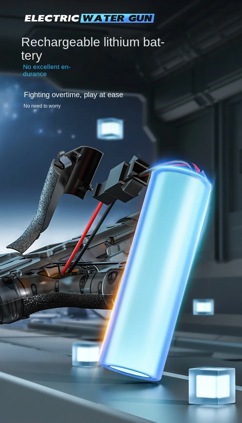 Se apaga automáticamente, lo que hace que sea divertido para los niños jugar con él. Sin embargo, compré tanto el rojo como el azul, pero el producto rojo tiene algunas piezas faltantes... No es un gran problema, así que lo usaré de todos modos. Y hay una batería dentro de la parte del mango, pero no es impermeable; solo tiene una estructura de tapa cerrada. No sumergir en agua. Jugué con él una vez, pero cuando lo abrí para cargar, había un poco de agua dentro. Para referencia, la parte del silenciador tiene un ruido fuerte, así que planeo probarla solo en una noche oscura. Estoy satisfecho con el resto.
