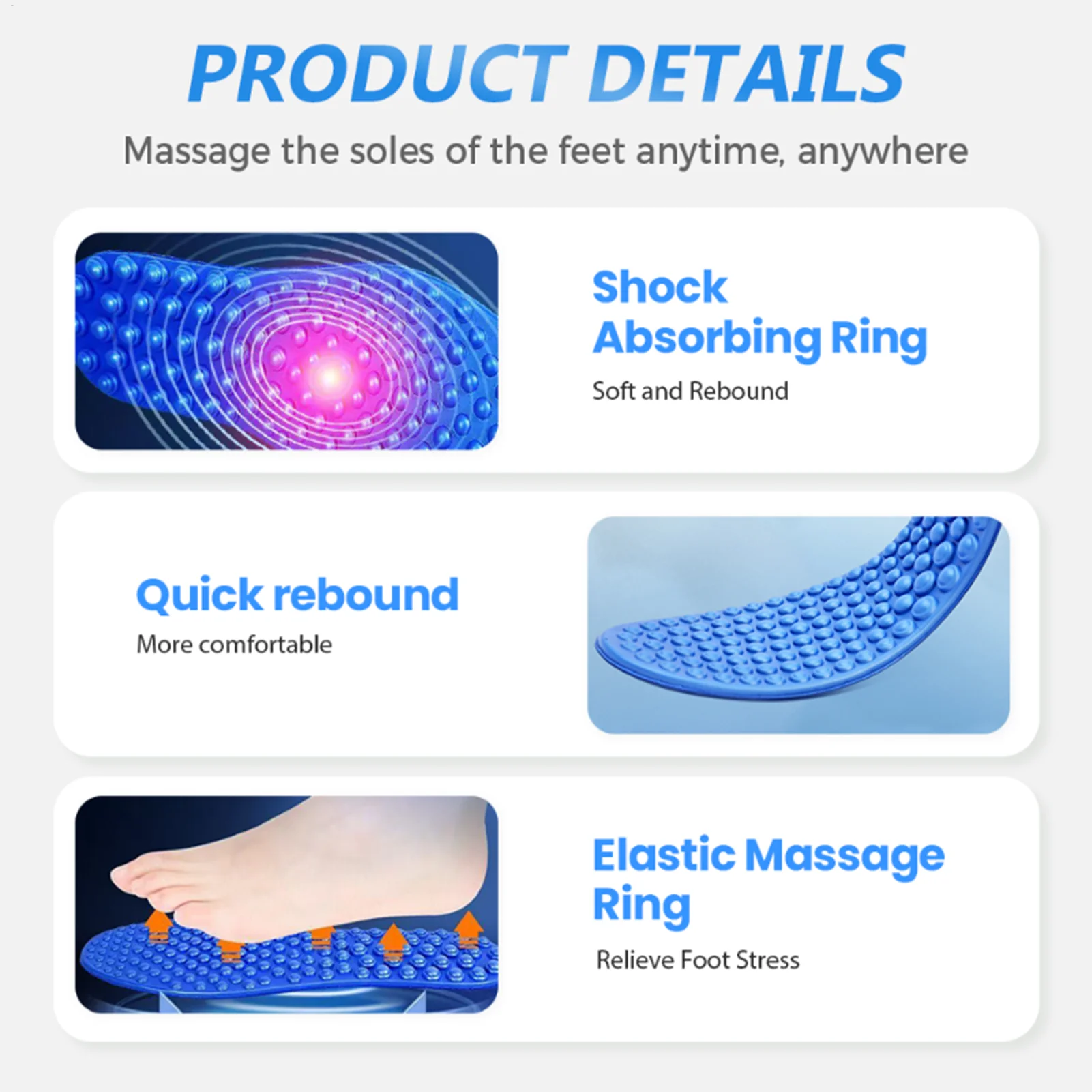 3.Plantillas de refuerzo de circulación: las plantillas de masaje para mujeres cuentan con una activación específica del punto reflejo, lo que ayuda a la estimulación de la circulación y reduce la hinchazón, ofreciendo una experiencia revitalizante que mejora el bienestar general después de estar de pie o caminar durante períodos prolongados.