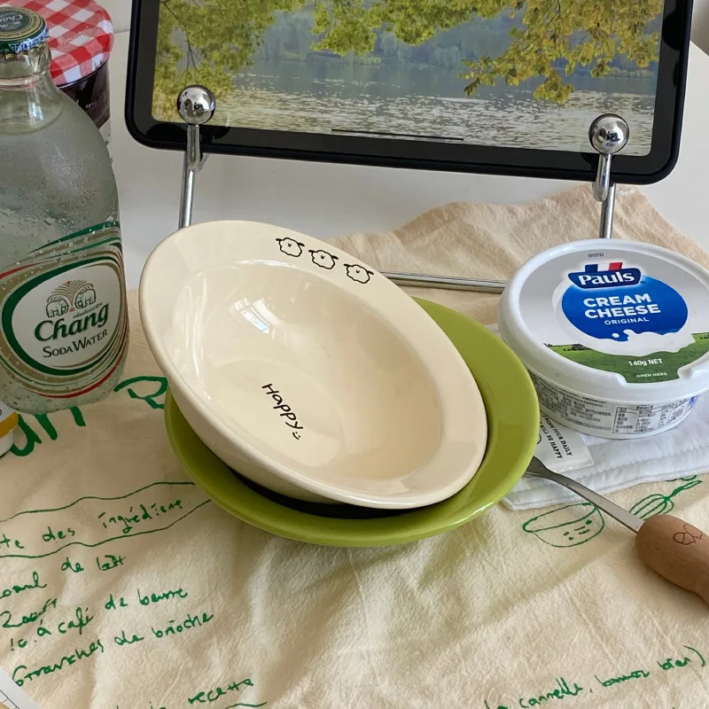 Plato de postre de Pasta occidental creativo, cuenco de cerámica verde de nicho Ins, plato de decoración de estilo Simple de dibujos animados divertidos para el hogar